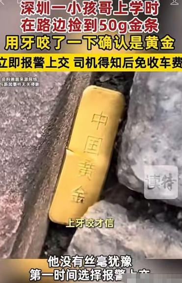 广东深圳,一名5年级的小学生在上学路上看到一个金灿灿的东西,捡起用牙一咬,竟然是一块50克的金条,随后他把金条交给了警方,但遭到了网友群嘲。 一块印着“投资足金”字样、重约50克的金条,按当前金价计算价值约4.5万元,这样一笔对成年人而言都不算小数目的财富,意外出现在深圳一名11岁少年的上学路上。 而少年的选择,不仅引发全网两极争论,更照见了成年人世界的功利与孩子本心的纯粹。 这名少年名叫李麒瑞,是深圳翠北实验小学五年级学生,今年11岁。 事发地点位于深圳罗湖区田贝四路,这里是全国知名的黄金珠宝聚集地,全国最大的黄金批发市场便坐落于此,也正因如此,在这片区域捡到金条,并非天方夜谭。 事发当天早晨,李麒瑞背着书包前往学校,行至路边时,发现一个无人认领的小布袋。 出于本能,他弯腰将布袋捡起,打开后,一块金灿灿、分量沉重的物件映入眼帘。 因从未接触过真金条,李麒瑞无法确定其真伪,便学着电视中的方法,用牙轻轻咬了一下,凭借柔软的质地,确认这是一块真金条。 随后,李麒瑞遇到同班同学,便将金条拿给对方查看。 同学对金价有初步了解,告知了他金条的重量和大致价值。 4.5万元,对11岁的李麒瑞而言无疑是一笔天文数字,但他没有丝毫犹豫,也没有任何私心,当即掏出随身携带的电话手表,拨通了110报警电话,之后便一直守在原地,静静等待民警到来。 民警抵达现场后,李麒瑞将金条原封不动地上交,并详细叙述了自己捡到金条的时间、地点和全过程。 面对民警的询问,李麒瑞朴实地说出了自己的想法:老师和父母一直教导他,不是自己的东西坚决不能拿,他能想到,失主丢失如此贵重的物品,一定十分着急。 这场本应彰显拾金不昧美德的小事,在被传到网上后,却迅速掀起了激烈争论,网友观点截然对立。 有网友极力赞扬李麒瑞,认为他家教良好,小小年纪便有极强的原则性,不贪财、有担当,所作所为甚至超过了许多成年人,值得所有孩子学习,也值得成年人反思和借鉴。 与此同时,另一部分网友的言论却充满了阴阳怪气的嘲讽。 有网友表示,李麒瑞太过年轻,没有经历过生活的艰辛,不懂得金钱的重要性,等他长大成人,明白4.5万元的实际价值后,一定会为此次上交金条的行为感到后悔。 事实上,类似的争议并非个例。此前,浙江一名四年级小女孩在公园游玩时,捡到一个装有几千元现金和各类证件的钱包,随后便拉着母亲,将钱包主动交给了附近的派出所。 即便如此,该小女孩的善举也遭到了部分网友的嘲讽,有网友认为她没必要多管闲事,不如把钱留着买零食、买玩具。 这种对少年善举的否定,背后本质上是成年人功利心的作祟。 与网友的嘲讽形成鲜明对比的,是社会各界对李麒瑞的温暖回应。 上交金条后,学校的老师专门陪同李麒瑞前往派出所配合调查,途中乘坐出租车时,司机得知他的事迹后,坚决拒绝收取车费,还表示如此善良的孩子值得鼓励,不能让他的善心受到寒心。 民警也对李麒瑞的行为给予了郑重表扬,称赞他小小年纪便有担当,拾金不昧的精神值得全社会学习。 李麒瑞所在的学校也计划将他的事迹整理成德育案例,开展相关宣传活动,让全校同学以他为榜样,传承拾金不昧的传统美德。 目前,那块50克的金条仍由警方妥善保管,民警也在全力寻找失主,希望能尽快让金条物归原主。 而这场围绕少年拾金不昧展开的争议,更值得人们深思:拾金不昧从来不是遥不可及的高尚美德,而是从小被教导的做人本分,我国《民法典》更明确规定,拾得遗失物必须返还或上交,这既是美德,也是每个公民应尽的法定义务。 如今,李麒瑞依旧保持着往日的生活节奏,按时上学、按时放学,仿佛自己只是做了一件微不足道的小事。 他在金钱诱惑面前守住本心的纯粹与善良,不该被成年人的世故和算计否定。 一块小小的金条,不仅测出了人心的成色,也让人们看清,最纯粹的善良,从来都值得被尊重、被温柔对待,更值得每个成年人去守护。 如果各位看官老爷们已经选择阅读了此文,麻烦您点一下关注,既方便您进行讨论和分享,又能带来不一样的参与感,感谢各位看官老爷们的支持!