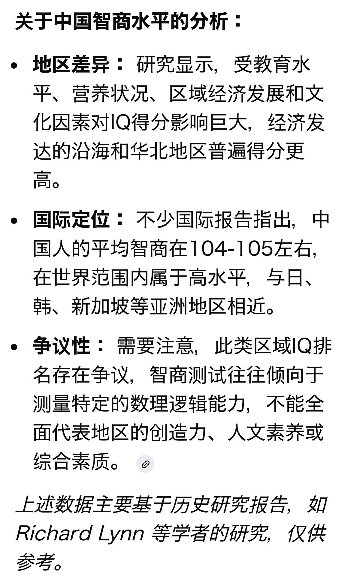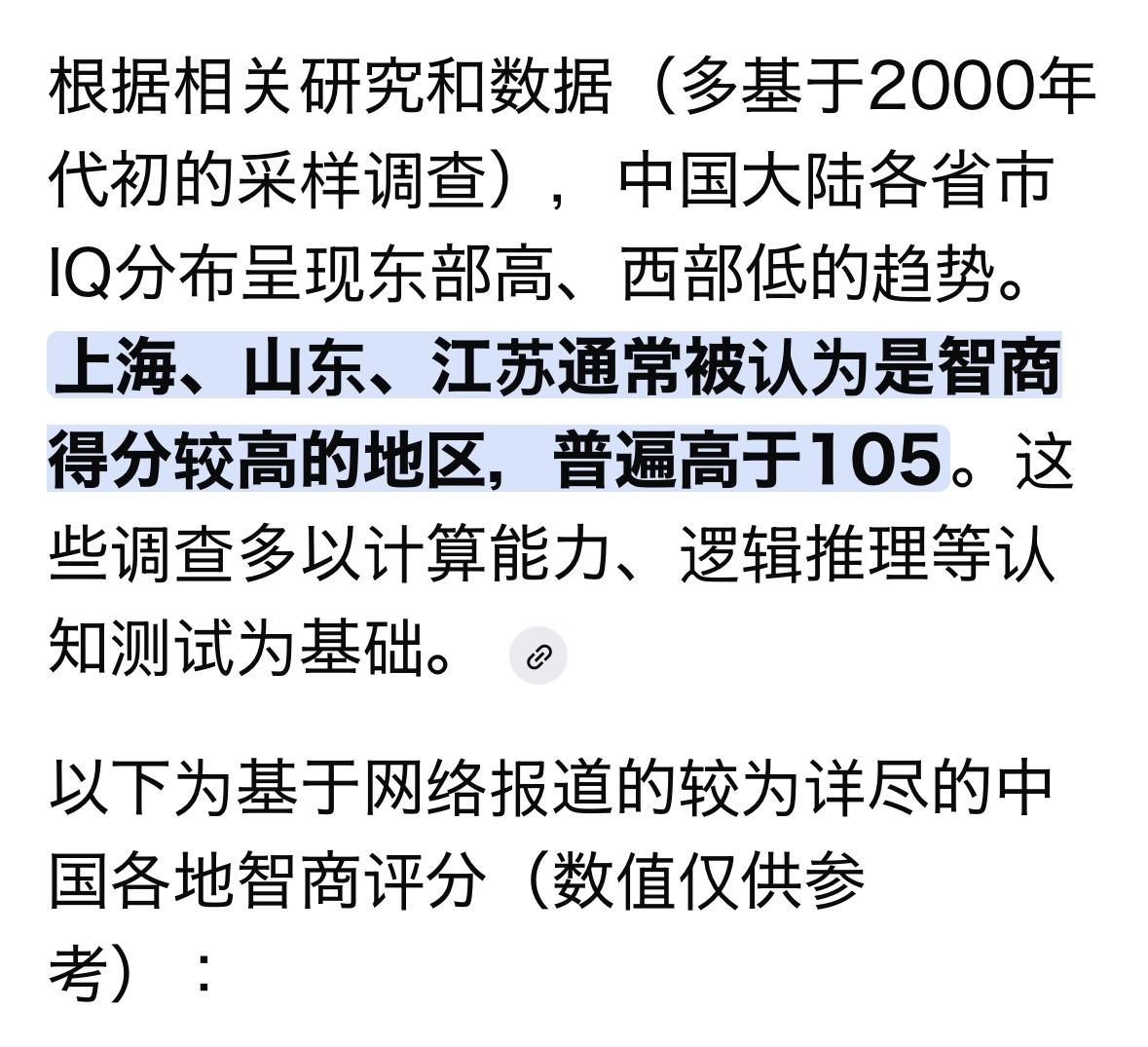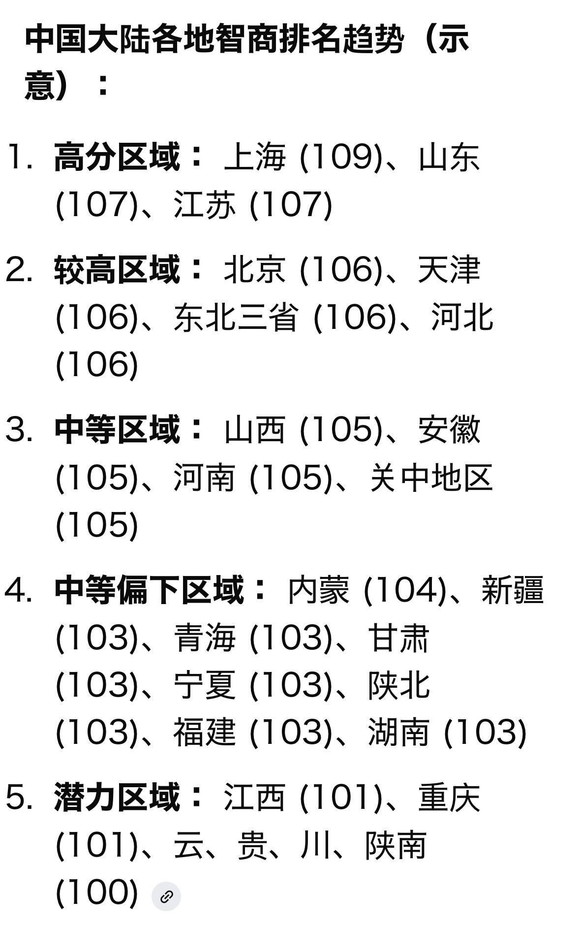 在日本,中部和东北地区IQ最高,平均102 。其次,是关东和关西,分别是100和99。最低的是冲绳96。 战国时代的英豪多出自高IQ地区,像爱知县,说不定打仗真锻炼智商呢。看来不同地区的智商水平还真有差异。 顺便看一下中国的IQ,由东向西下滑。