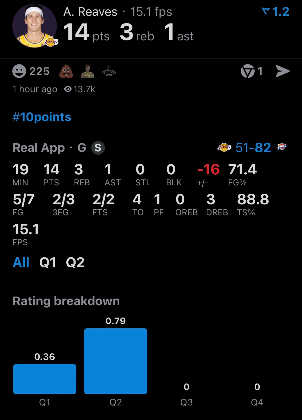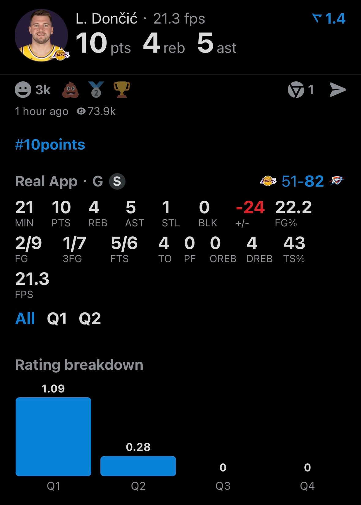 湖人三核半场没有发挥:东契奇10分4板5助攻、里夫斯14分3板1助攻詹姆斯8分3板2助攻。湖人vs雷霆