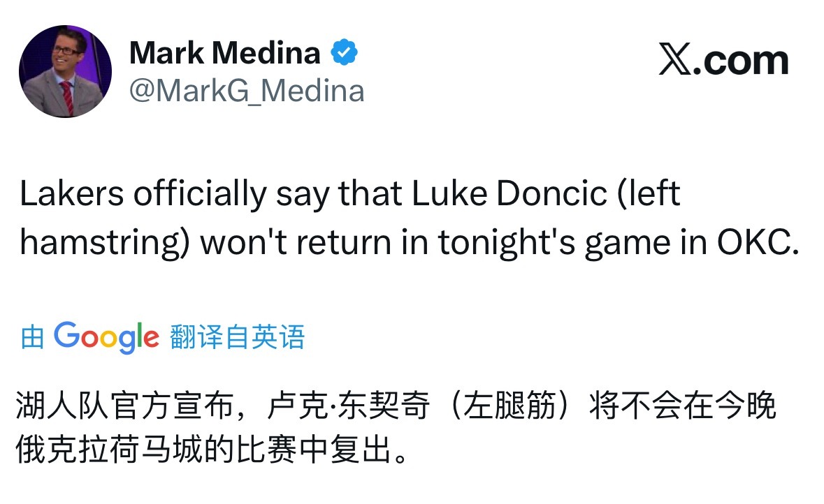 湖人官方:东契奇左腿筋拉伤不会回归。 湖人vs雷霆东契奇疑似左侧大腿拉伤