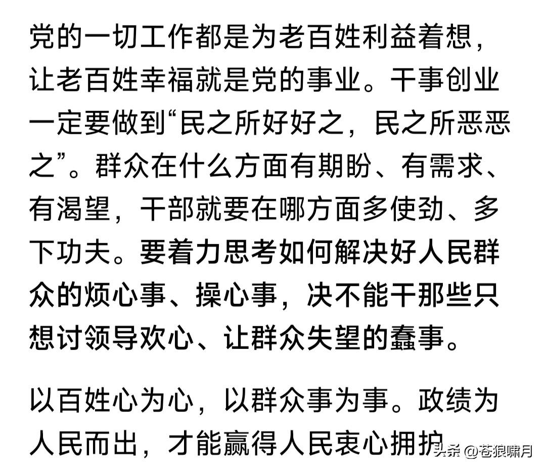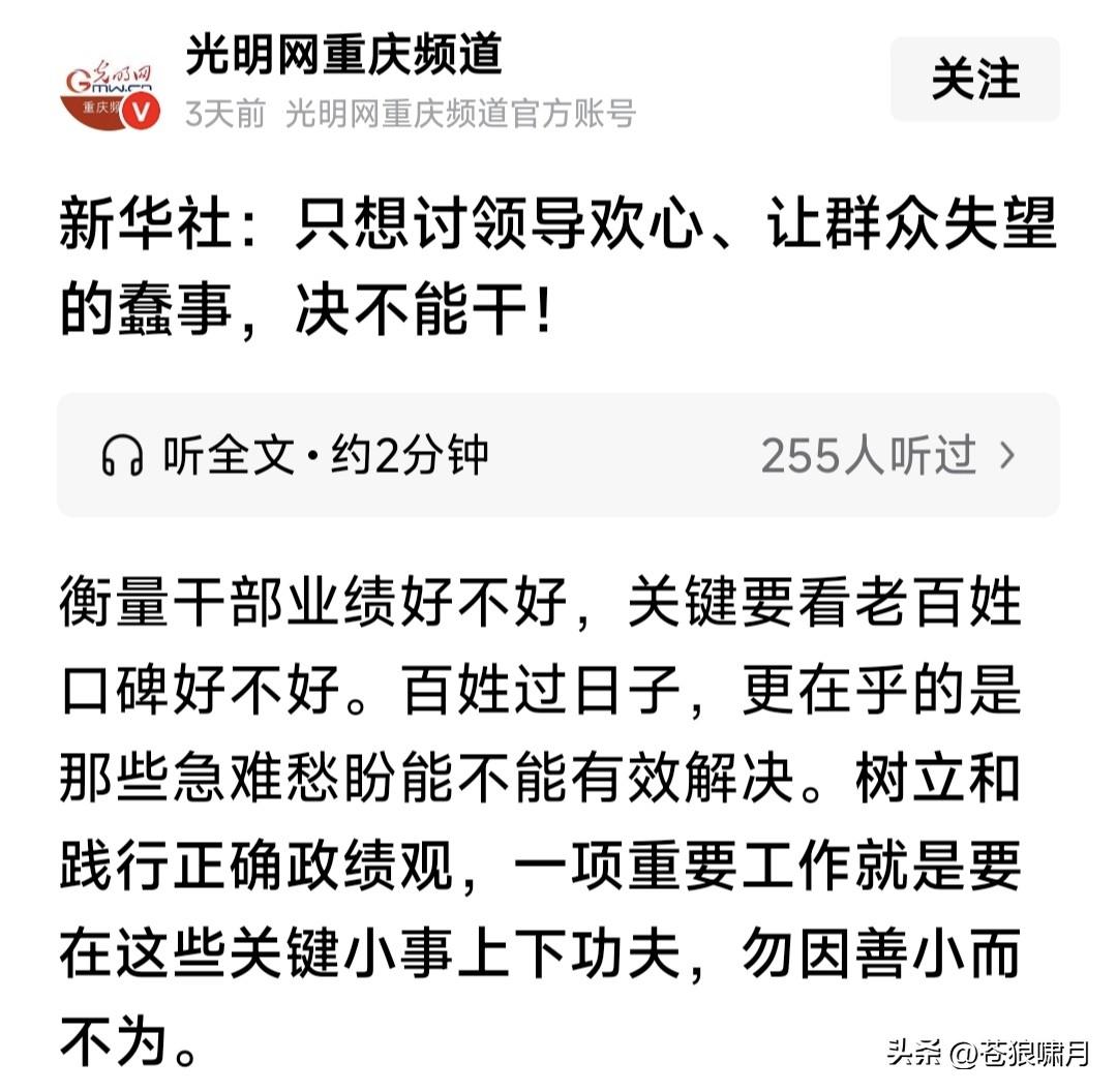 为新华社点赞:只想讨领导欢心,让群众失望的蠢事,我们坚决不能干! 衡量干部业绩好不好?关键看老百姓口碑好不好!我们办企业,不管规模大小效益如何?只要百姓得实惠就干! 我们国家的一切属于人民!政府机构与工作人员,都是为人民服务。要倾听人民意见,接受监督才能赢得拥护! 想起豫剧“七品芝麻官”,唐成的一段唱:当官不为民做主,不如回家卖红薯!把这句话送给当今官员,也挺合适? …………