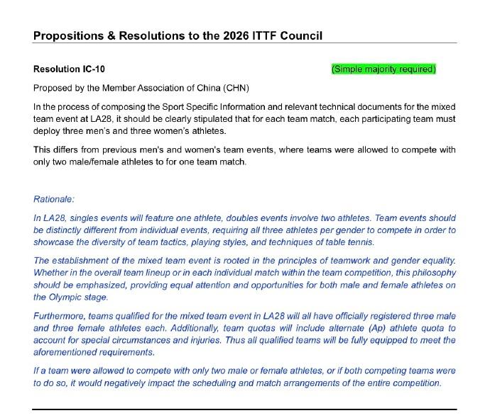 中国乒协提案球拍管控标准化,中国乒协提案洛奥混团3男3女 4月3日,中国乒乓球协会提交给2026年国际乒联理事会的提案与决议,建议对球拍管控实施标准化管理,并就洛杉矶2028年奥运会混合团体赛的参赛阵容提出明确要求。明确规定,每场团体赛中,每支参赛队伍必须派出三名男选手和三名女选手。 提案指出,当前球拍检测的操作指引不够完善,尤其在器材存放、运输及交接环节缺乏明确规范,纸质信封等传统包装方式难以有效防止球拍在双打或团体赛事中因多人多拍集中管理而意外受损。决议要求:器材委员会、裁判委员会等相关部门,在6个月内协同修订并明确球拍检测的具体流程与标准化操作要求;必须使用标准化、硬质的存储装置(如透明塑料盒)存放受检球拍;全流程视频监控:从球拍存放至检录区起,直至在比赛球台交还运动员为止,须通过录像或其他可追溯方式全程记录;运动员及其随行人员,有权对球拍检测的所有环节进行观察与监督。 提案理由包括:球拍检测的工作流程说明与检测手册,均未针对运动员这一最重要的比赛器材的处理,提供充分的操作指引;相关文件也未明确运动员及其随行人员在检测流程中享有的权利。此外,有理由认为,纸质信封或包装袋不足以保护球拍免受意外损坏,尤其是在双打与团体赛事中,一名裁判可能需要同时携带最多4至6支球拍。 在针对洛杉矶2028年奥运会混合团体赛的专项信息及相关技术文件中,决议明确要求:每场团体赛中,每支参赛队伍必须派出三名男选手和三名女选手。这与以往男子或女子团体赛事中仅需派出两名同性别运动员的规则有显著区别。 提案理由包括:在洛杉矶2028年奥运会上,单打项目由一名运动员参赛,双打项目由两名运动员参赛。团体项目应与个人项目有显著区别,要求每个性别的三名运动员均需参赛,以展现乒乓球团体战术、比赛风格和技术的多样性。混合团体项目的设立植根于团队合作与性别平等的原则。无论是在整体队伍阵容中,还是在团体赛的每一场单打比赛中,都应强调这一理念,在奥运舞台上为男女运动员提供平等的关注和机会。 此外,获得洛杉矶2028年奥运会混合团体赛参赛资格的队伍,均须正式注册三名男运动员和三名女运动员。此外,各队名额中将包含替补(Ap)名额,以应对特殊情况和伤病。因此,所有获得参赛资格的队伍都将具备满足上述要求的充分条件。如果允许某支队伍仅派出两名男运动员或女运动员参赛,或者参赛的两支队伍都这样做,将对整个赛事的赛程安排和比赛安排产生负面影响。 文/北青体育 周学帅