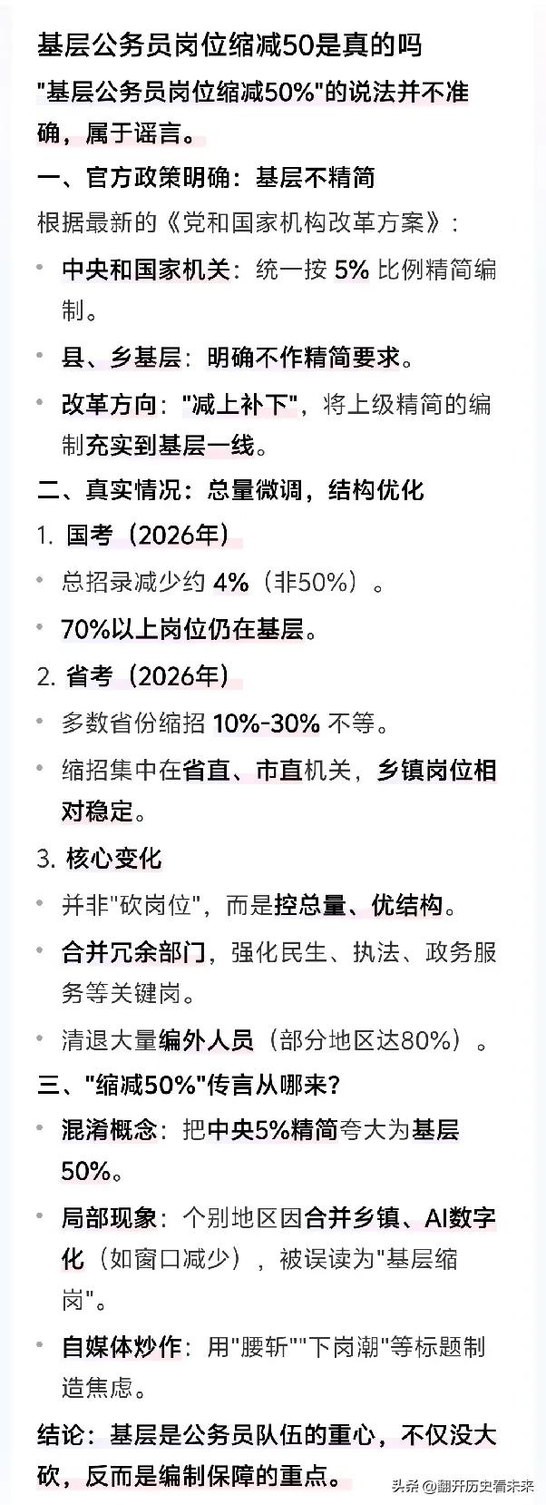 这两天我看到了一个消息: 2028年前基层公务员岗位缩减50%,AI政务系统全面上线,这意味着“铁饭碗”时代开始终结…… 我看到很多人都在纷纷叫好、纷纷表示支持,很多人感觉人数实在是有点多了。 可是、但是,我想明确的告诉大家:这是一个彻头彻尾的谣言;希望大家不传谣不信谣不造谣! 目前公务人员虽然确实在缩编、编外人员更是在大量减少等等。 不过也只是5%而已,基层人员不但不会减少还要进一步的充实。 结论是:基层公务人员是不会减少的。 当然了,我觉得适当减少未必是坏事,当人人都想去体制内的时候,总感觉哪里不太对。 大家觉得呢?