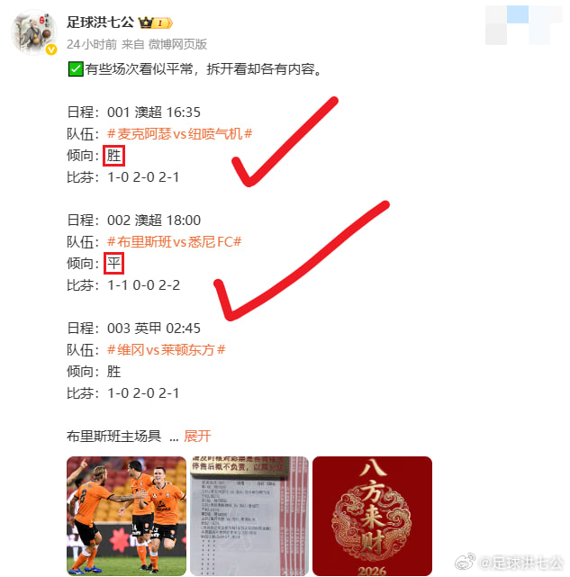 其中 001麦克阿瑟vs纽喷气机 顺利打出,002布里斯班vs悉尼FC 平局方向也成功命中,唯独 003维冈vs莱顿东方 没能如愿拿下,多少还是有些遗憾。