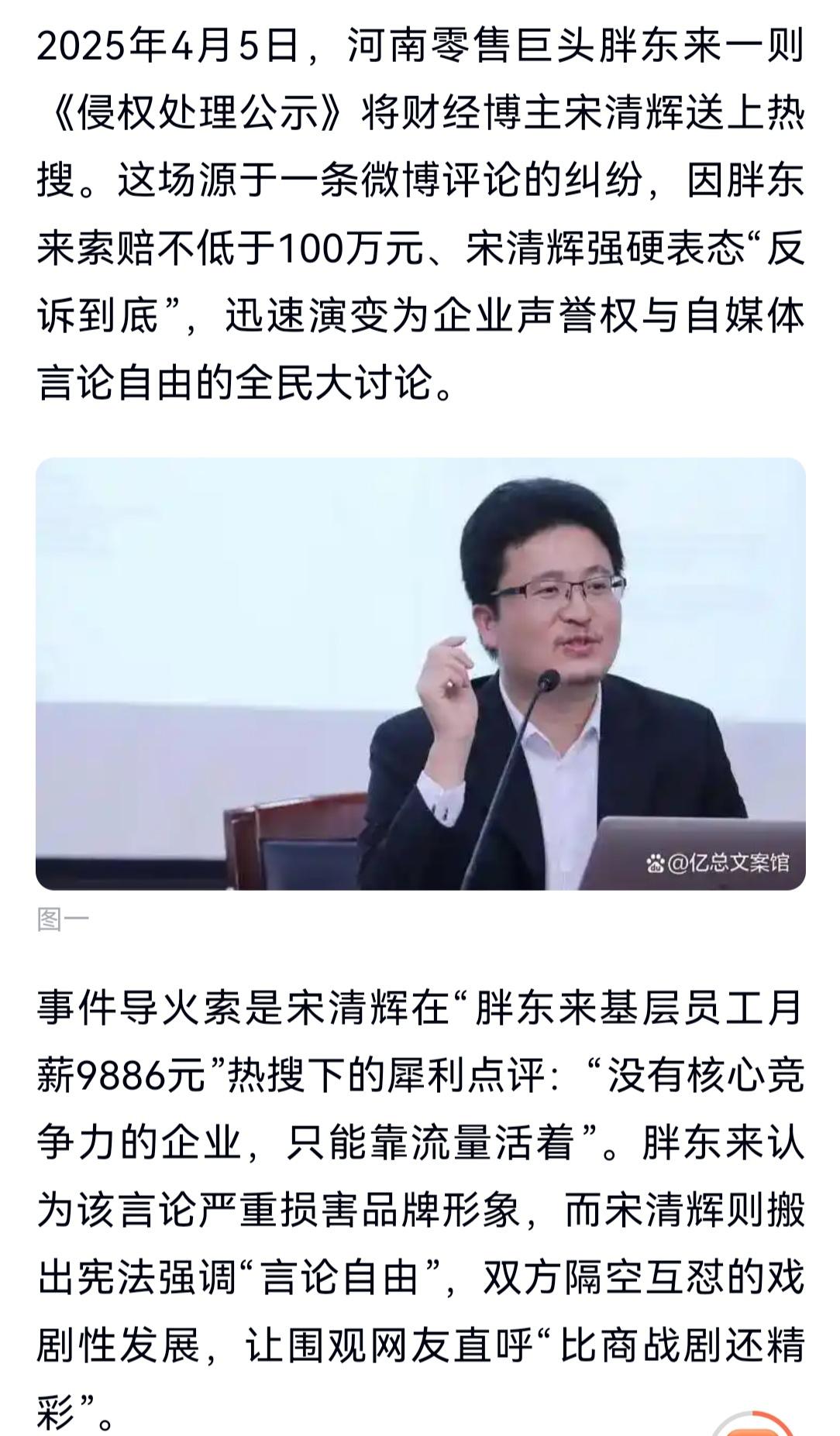 这次,我站经济学家宋清辉。 野生经济学家宋清辉先生又摊上事儿了,起因是老宋在河南地方明星零售商胖东来的员工基本月薪9886元的微博下面留了一条评论,说:“没有核心竞争力的企业,只能靠流量活着”。结果,被胖东来以“侵犯名誉权”诉至当地法院,被判赔65万及七天的道歉。 宋经济学家经常跨界发表一些对教育的看法,可能是因为他自己孩子的教育出了些问题,常常有些言词激烈且不是很靠谱,至少缺乏可操作性,所以他的关于教育的观点我基本上都持反对意见。但是,我反对的是他的观点,不是他发表意见的权力。 胖东来有没有“核心竞争力”我不知道,这是他们经济学领域的事情,咱不懂不敢乱说。但是,作为一个经济学家,哪怕是野生的,说一个企业“靠流量活着”,即便他是错的,即便他没看出来胖子的更深层次的“核心竞争力”,这仍然只是个经济学观点的争论,怎么就成了“侵犯名誉权”?“靠流量活着”怎么就成了名誉不好的形容?网红靠流量,小鲜肉靠流量,自媒体靠流量……这就算丢人了? 不能引言获罪,是立法基础。这次,我站宋清辉。