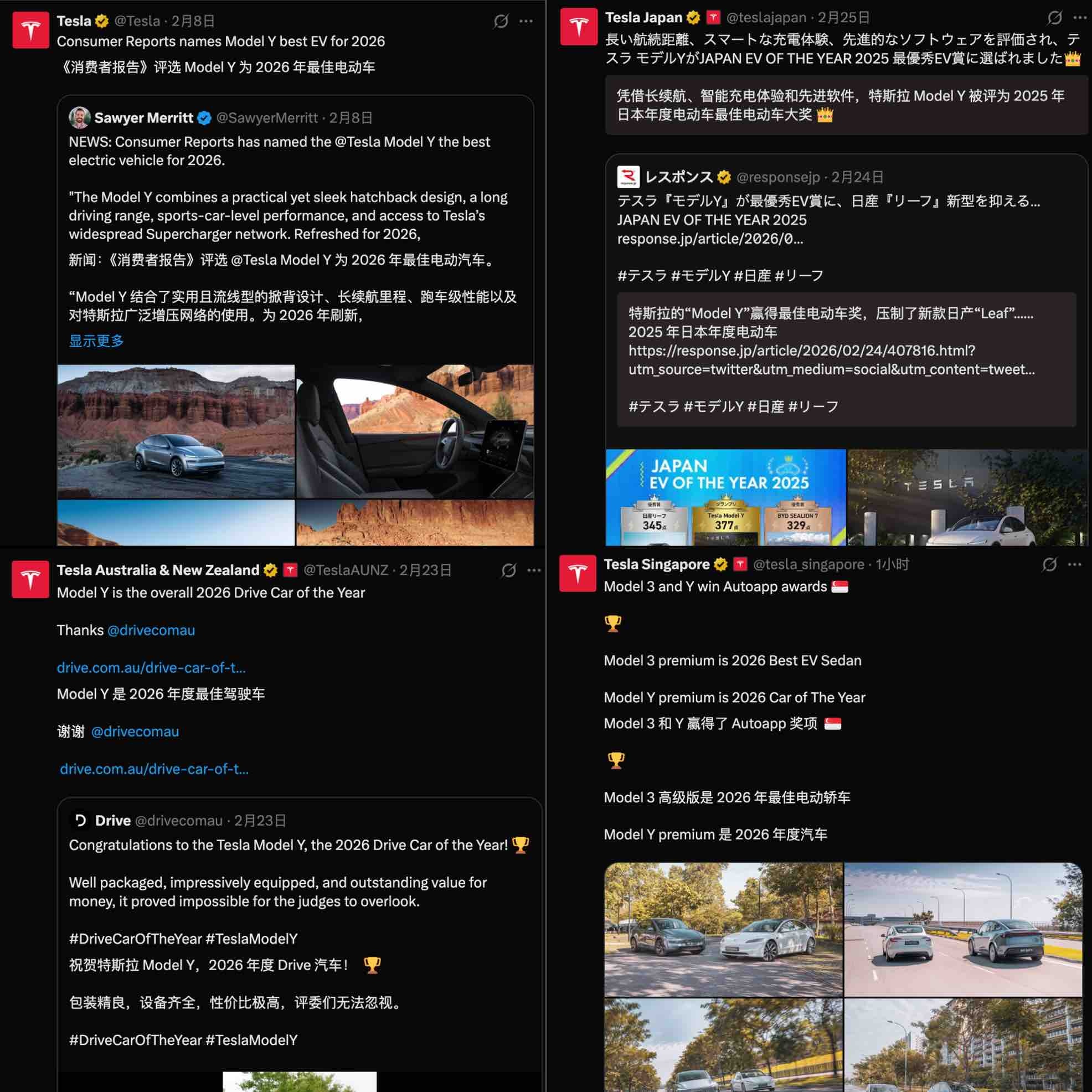Model Y已连续三年拿下全球销冠,累计销量超400万辆;Model 3上市十年,全球累计卖出300万辆。在中国,Model Y蝉联一季度乘用车批发销量冠军;在欧洲、亚太多地也稳居电动车前列。