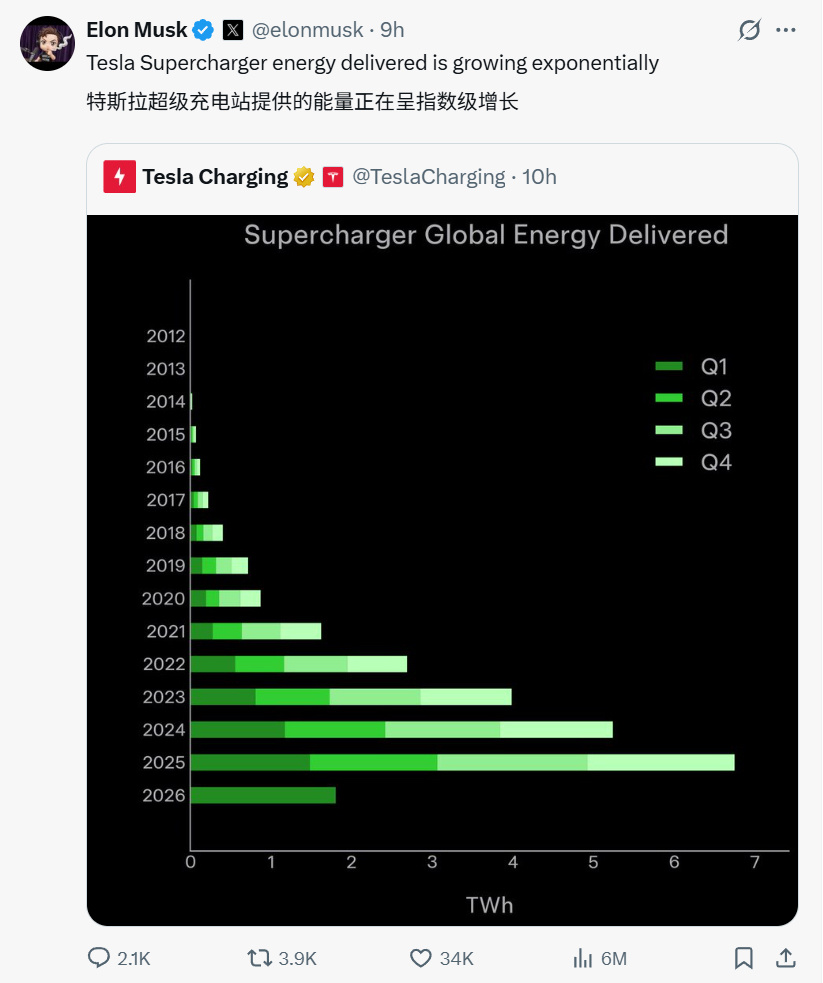 截至3月底,特斯拉全球超充桩超7.5万根,国内超充站突破2500座。重庆高速服务区刚启用了55座超充站,是国内一次性投建规模最大的高速超充项目。