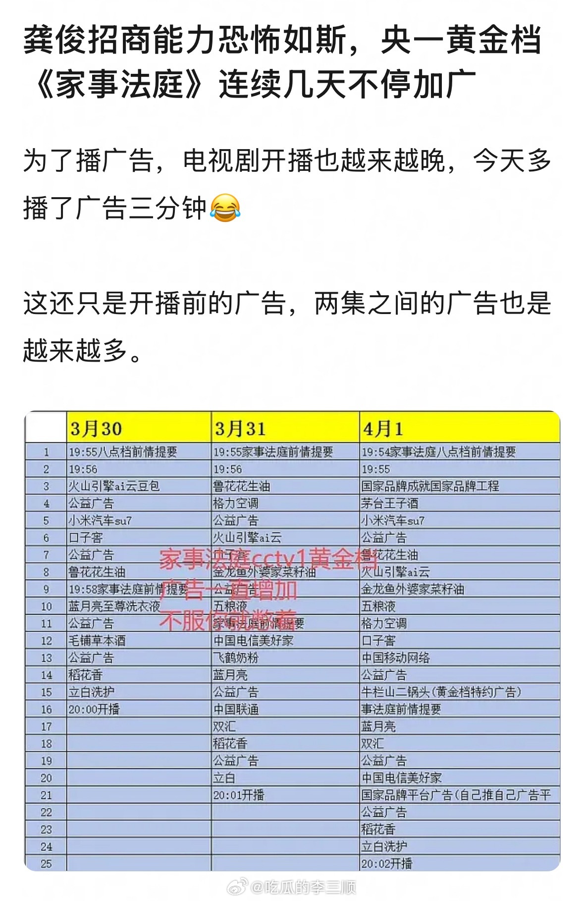 龚俊主演的《家事法庭》又双叒叕加广了,连续几天加广,央一黄金档的广告费巨贵,还能