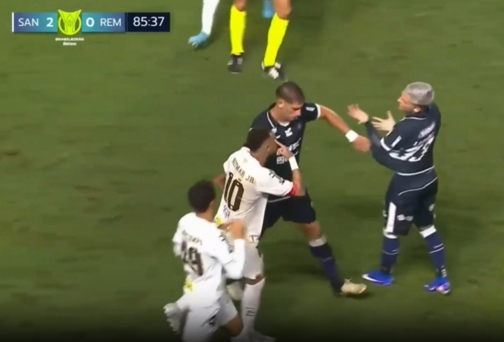 4月03日讯 巴甲联赛桑托斯2-0击败瑞模贝雷,内马尔此役踢满全场,贡献一次助攻,并吃到一张黄牌。第85分钟,内马尔在短短不到10秒钟的时间,被对手同一名防守球员先是推倒、随后从背后踢倒在地。内马尔不满对手恶意犯规,抗议裁判判罚被出示黄牌,引发两队冲突,他也因累积三张黄牌,将缺席下一场对阵弗拉门戈的比赛。踢倒内马尔的33号迭戈·埃尔南德斯也吃到一张黄牌。足球巴甲联赛内马尔