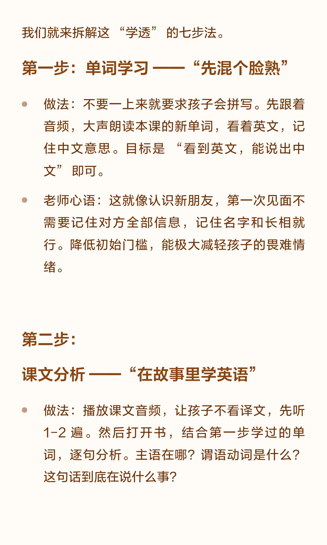 先不看译文,盲听课文音频 1-2 遍,再结合已学单词逐句分析句子结构,在语境中理解内容,培养阅读理解能力,而非孤立记知识点。