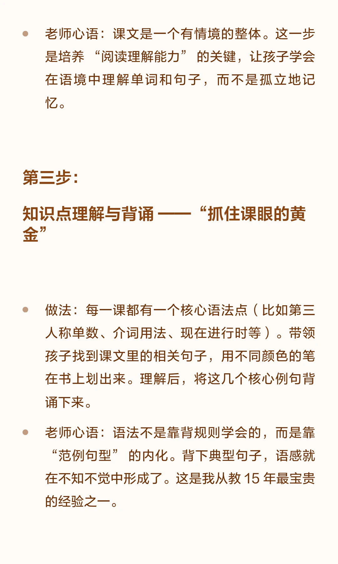 找出每课核心语法点(如第三人称单数、时态等),划出课文中的对应例句,理解后背诵核心句型,通过例句内化语法,培养语感。