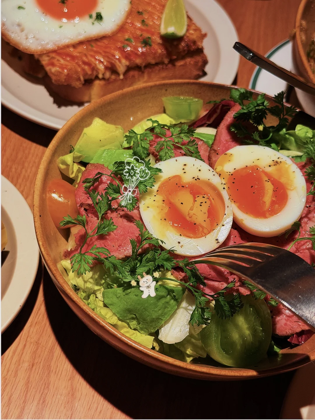 🥂属于最近吃到很喜欢的一家餐厅 自然系风格,食材很干净健康 🥪:三明治有肉眼可见的牛油果🥑,糖心蛋🥚,火腿,分量很大两个女生分着吃很实在 🥦素菜碗好看又健康,正好适合最近减脂。 属于可以反复去吃的餐厅,氛围很好的一次dating