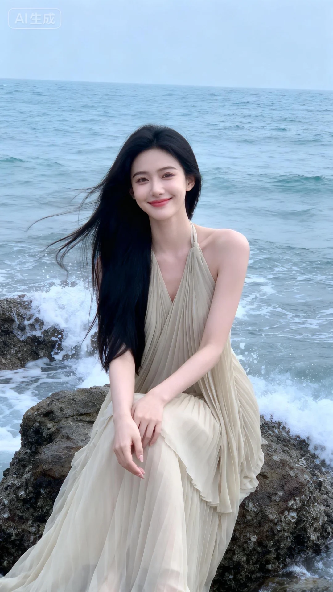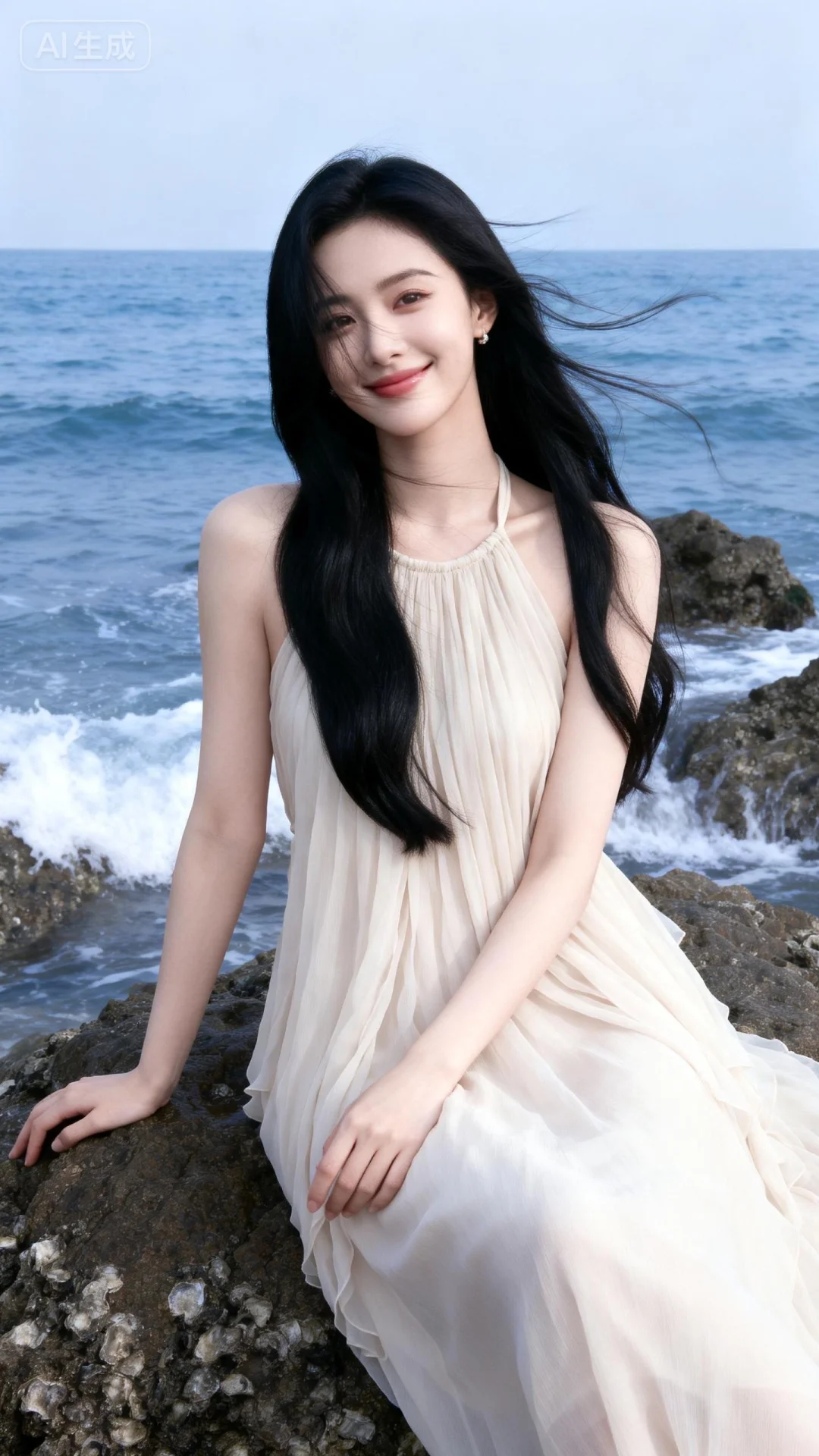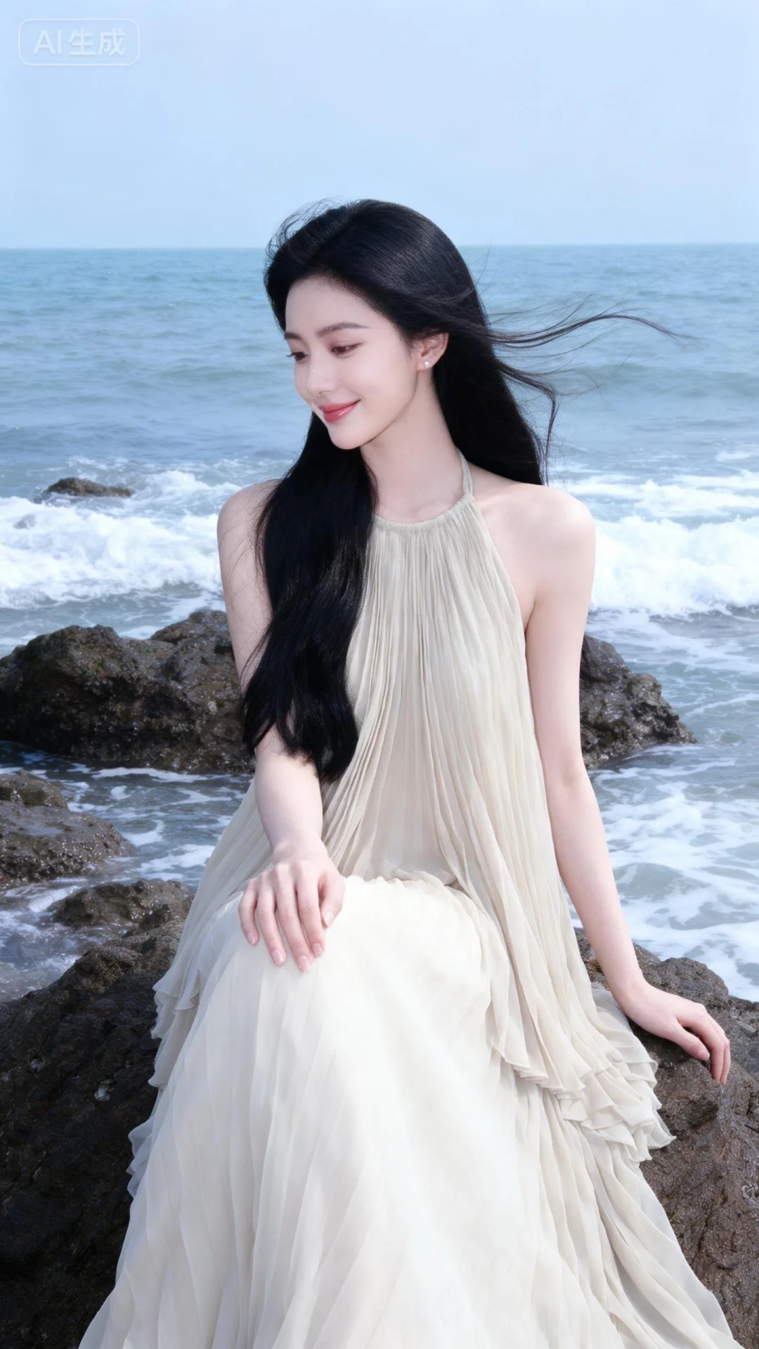 高颜值千金系公主气质美女,冷白皮,娇羞浅笑,气质风格少女系,氛围慵懒,20岁左右,清纯年轻,瓜子脸,冷白皮气质美女,纯欲风,黑色柔顺及腰长发,头包脸,高级,故事性 ,千金贵气感,明艳动人,自信从容,气质温柔,高级惊艳妆造,氛围感,身着浅色雪纺挂脖长裙,天气晴朗的自然光线融合的刚刚好,身后是辽阔的大海,海浪拍打着礁石,坐在礁石上发呆,动作自然举止优雅端庄不做作,海风轻轻吹过发梢,杂志大片既视感