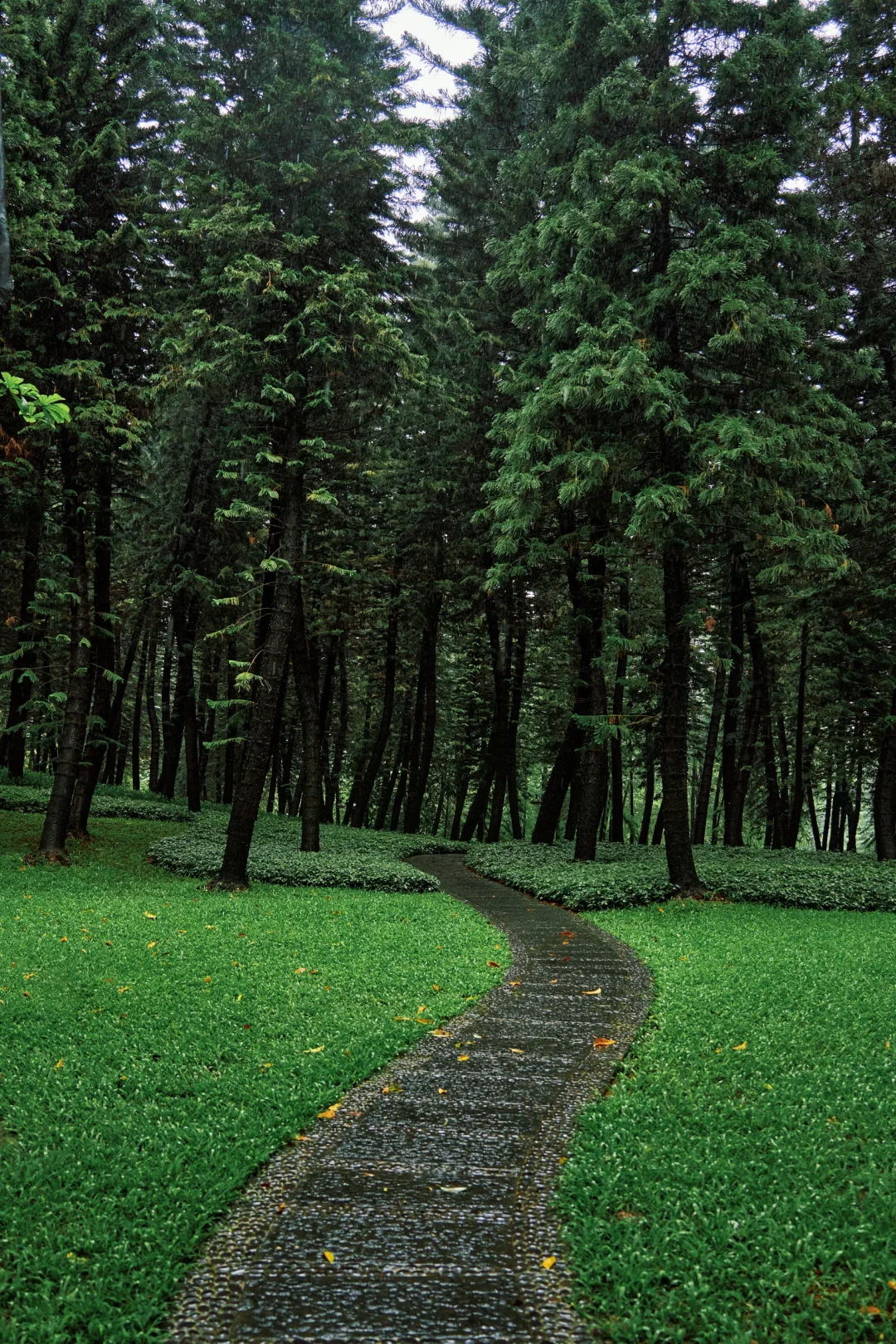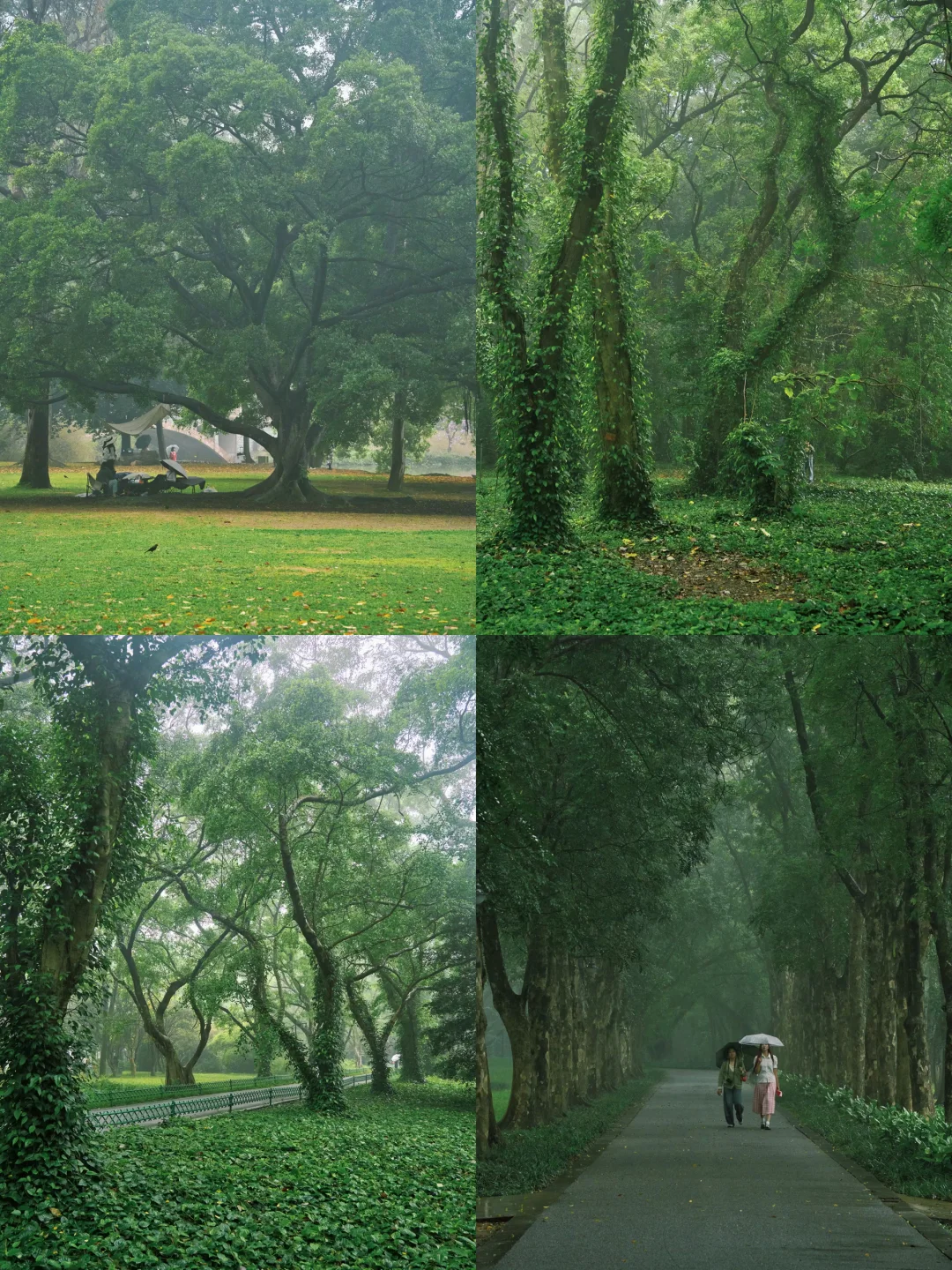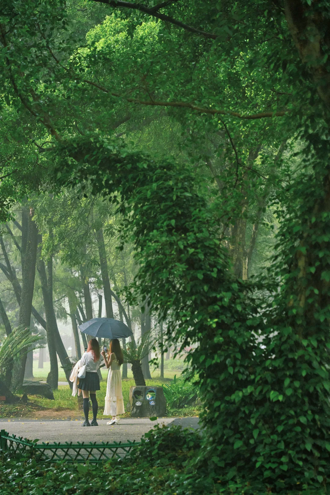 雨天的植物园,是被绿意包裹的秘境,藤蔓顺着古树枝干肆意攀爬,林间小径被层层绿植环绕,雾气在林间游走,如轻纱般朦胧,像极了现实版的绿野仙踪