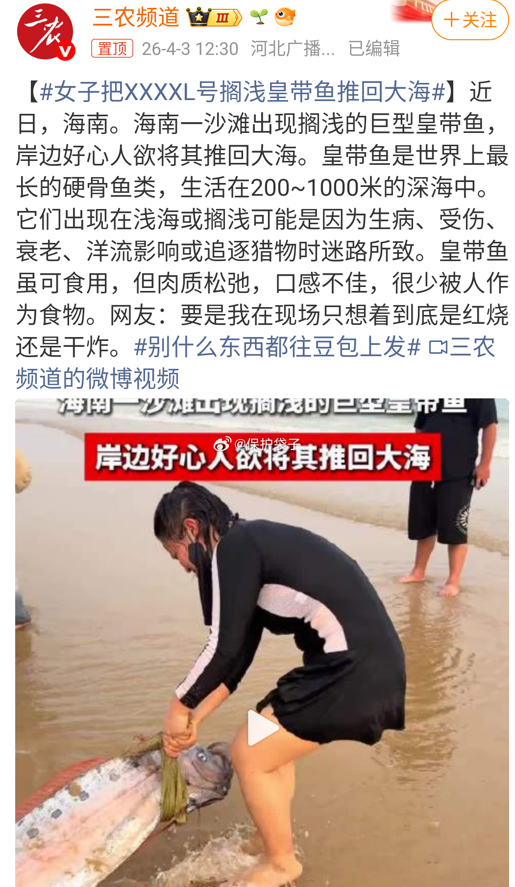 女子把XXXXL号搁浅皇带鱼推回大海别玩了,皇带鱼搁浅多数是要地震,还在看稀奇。皇带鱼本身看上去就是巨型带鱼的样子,要是出来一条十多米的还能说XXXXL号皇带鱼,或者说XXXXXL号带鱼。小扁还是再多学点表达吧。袋子时评