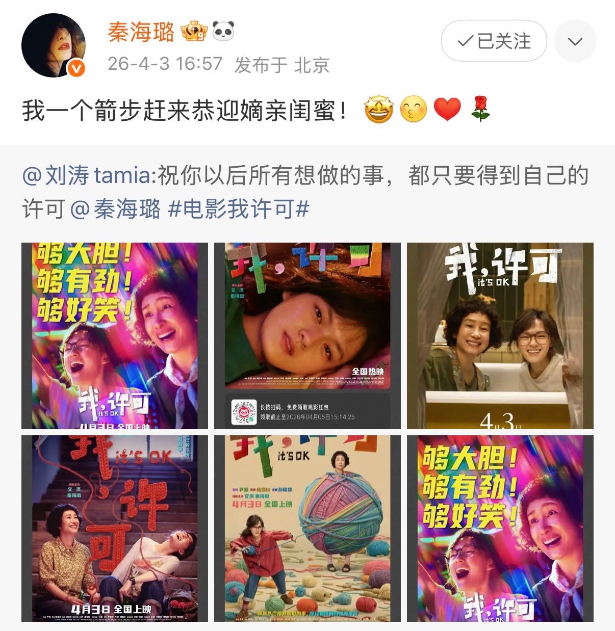 秦海璐喊刘涛嫡亲闺蜜这才是顶配闺蜜局!刘涛直接连包六场应援,主打一个实力宠闺蜜,双向奔赴的友情诡秘我给你接住!秦海璐新片《我,许可》今日上映,和胡春蓉女士大银幕不见不散!刘涛为秦海璐连包六场