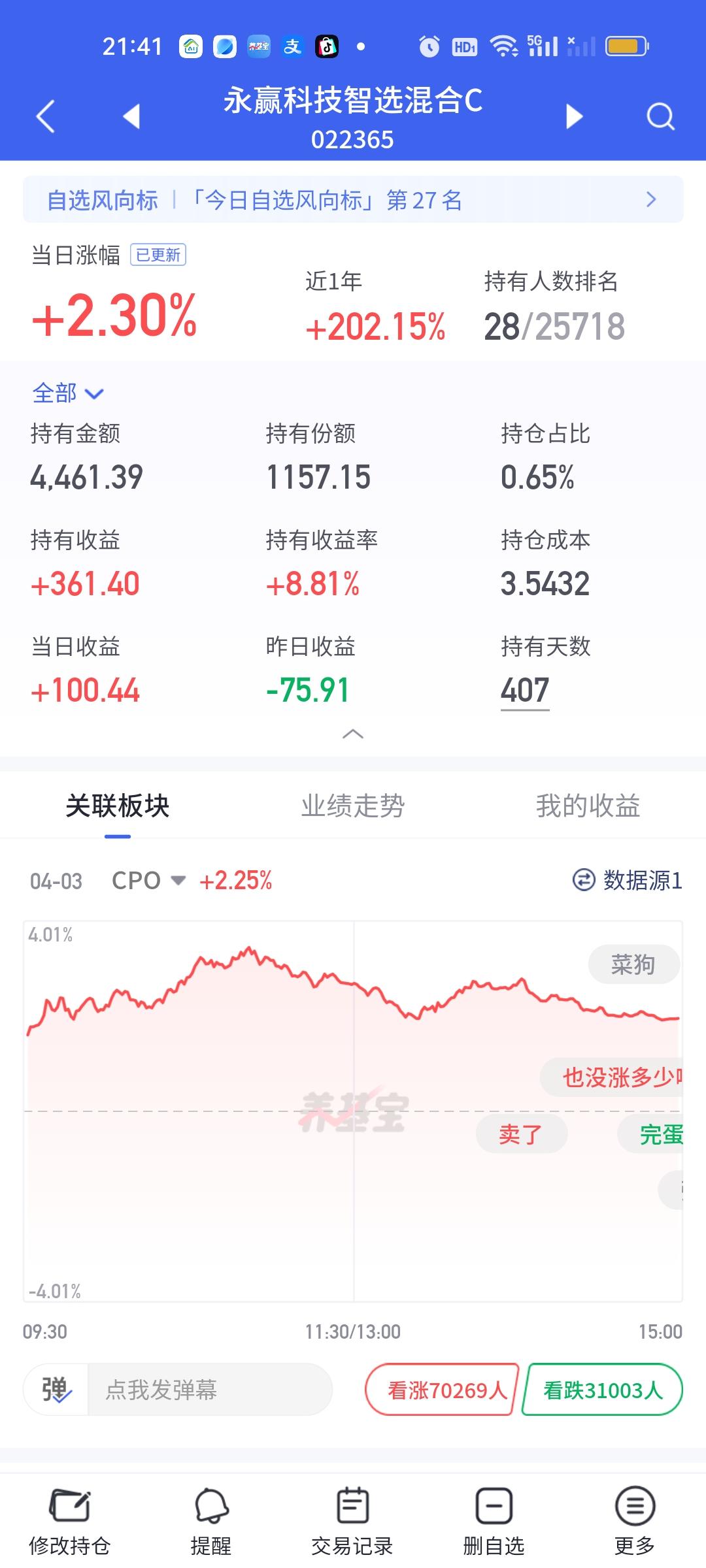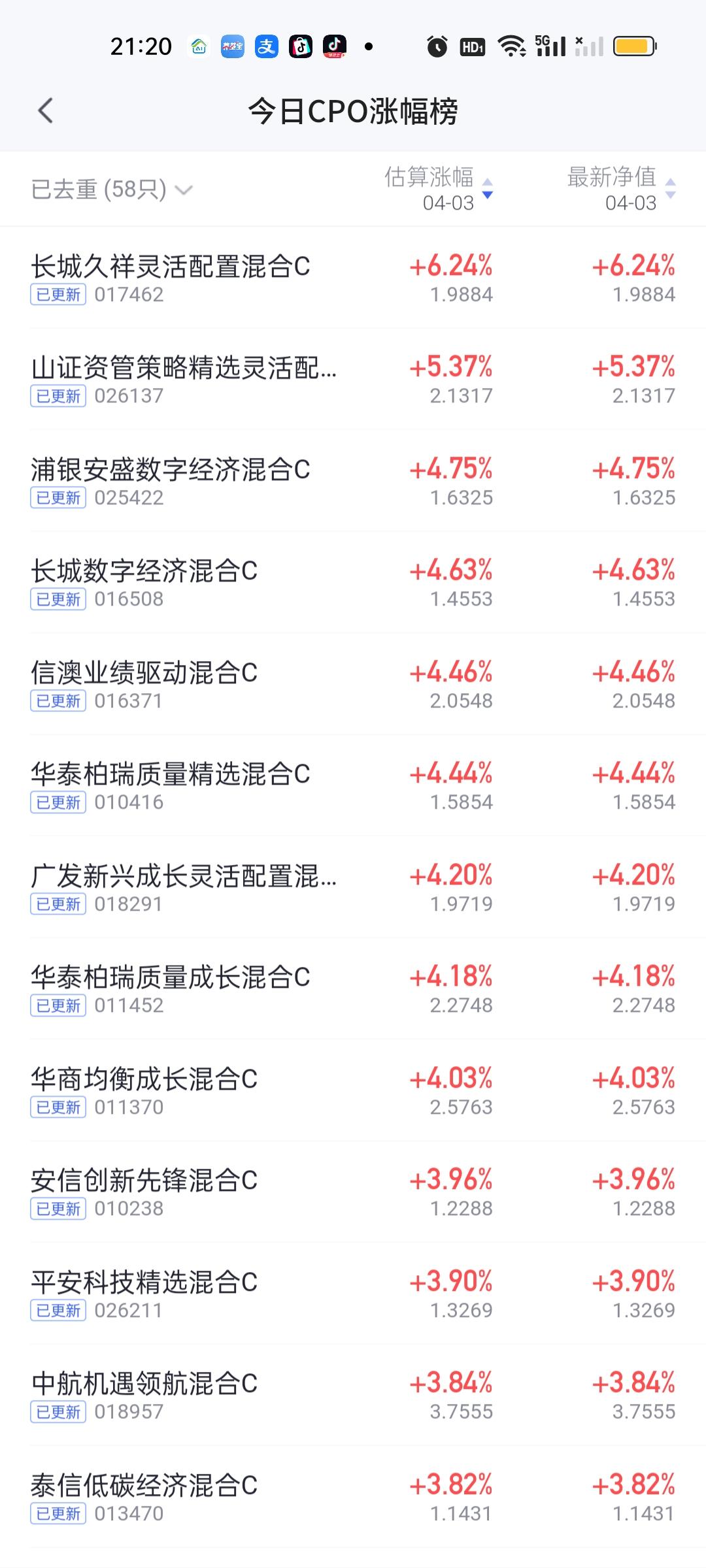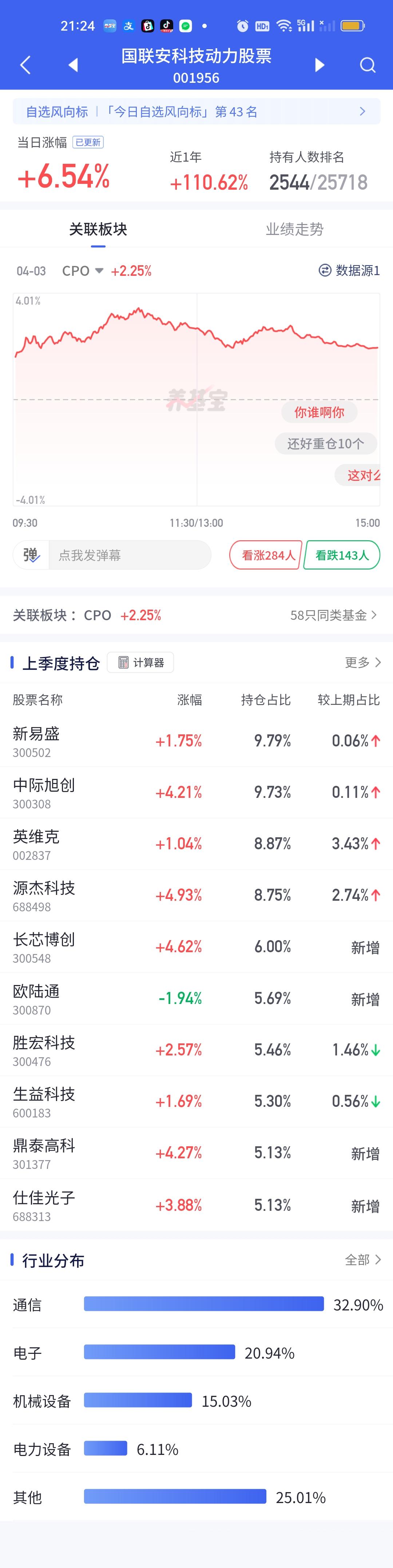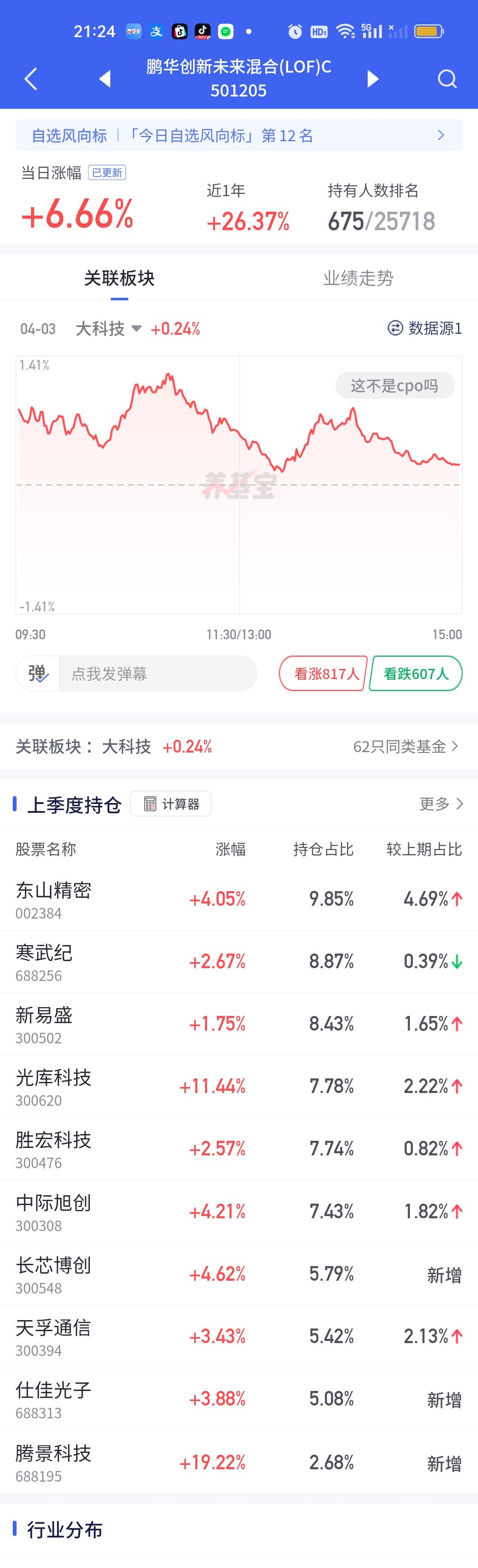 CPO板块是今天涨幅最大的板块,这还不算下午的大幅跳水,如果按照上午计算,6%以上的基金都会在30只以上。长城久祥今天涨了6.24%。但总的净值榜它只能排在第三,鹏华创新未来6.66%排名第一,国联安科技动力股票6.54%排名第二。 不过鹏华创新未来第一大重仓股东山精密,第二大重仓股寒武纪并不属于CPO板块,所以没有把它归纳于CPO基金。而是算做混合基。但国联安很明显是重仓的CPO板块。这个没有疑问。 去年的四大金刚:永赢科技,德邦鑫星,中航机遇和信澳业绩今天的表现并不突出。涨幅4%以上的基金除了长城久祥,国联安科技动力之外,还有山证资管策略精选5.37%,浦银安盛数字经济4.75%,长城数字经济4.63%,信澳业绩驱动4.46%,华泰柏瑞质量兄弟4.44%,4.13%,广发新兴成长4.20%。华商均衡成长4.03%,而永赢科技只开了2.30%,这个就让人非常失望了!可能高达百亿的基金规模,船大不好调头吧。