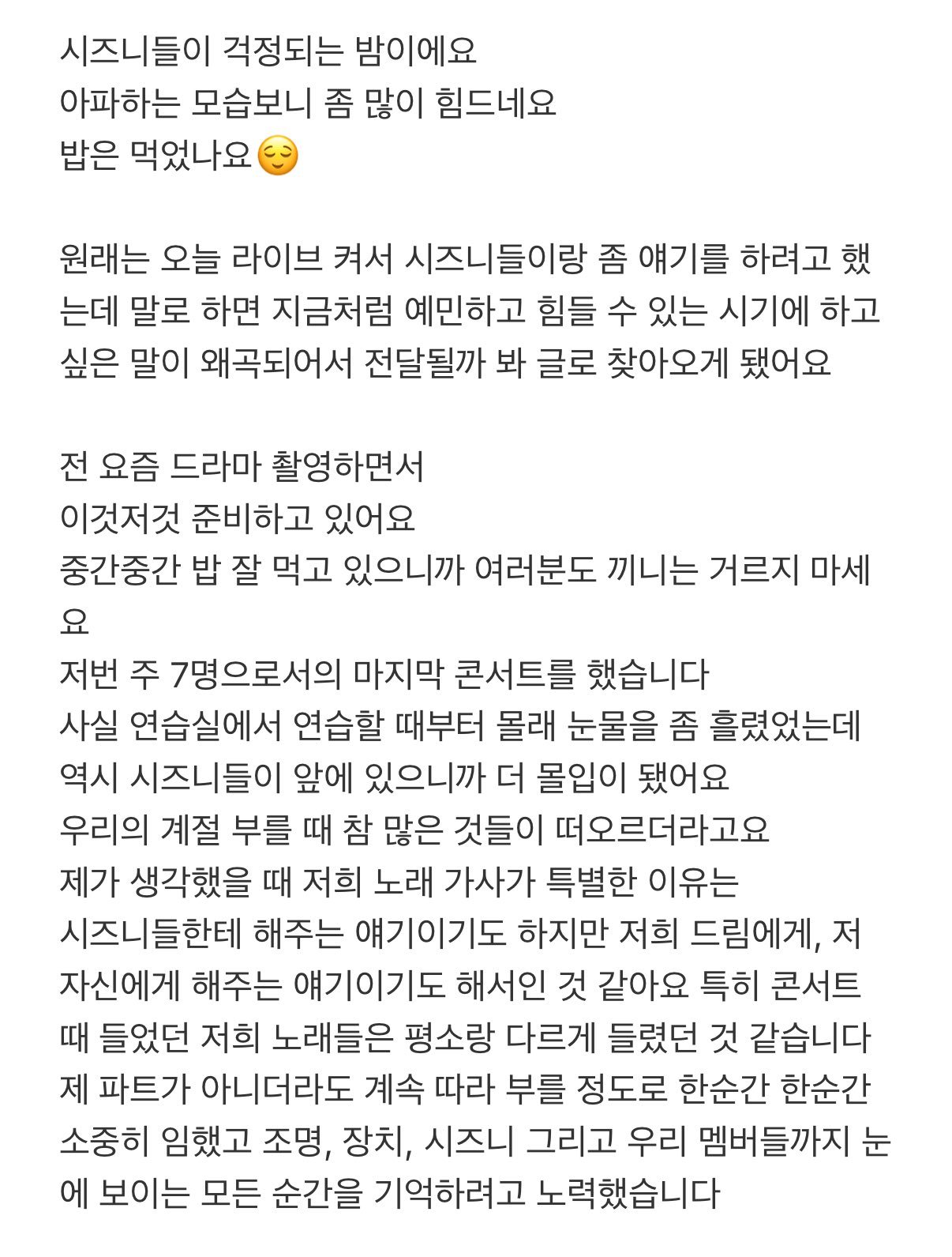 即使不是我唱的部分,我也会一直跟着唱,珍惜着每一个瞬间,努力把每一个瞬间都铭刻在记忆里 — 灯光、舞台布置、西珍妮,还有我们成员们。