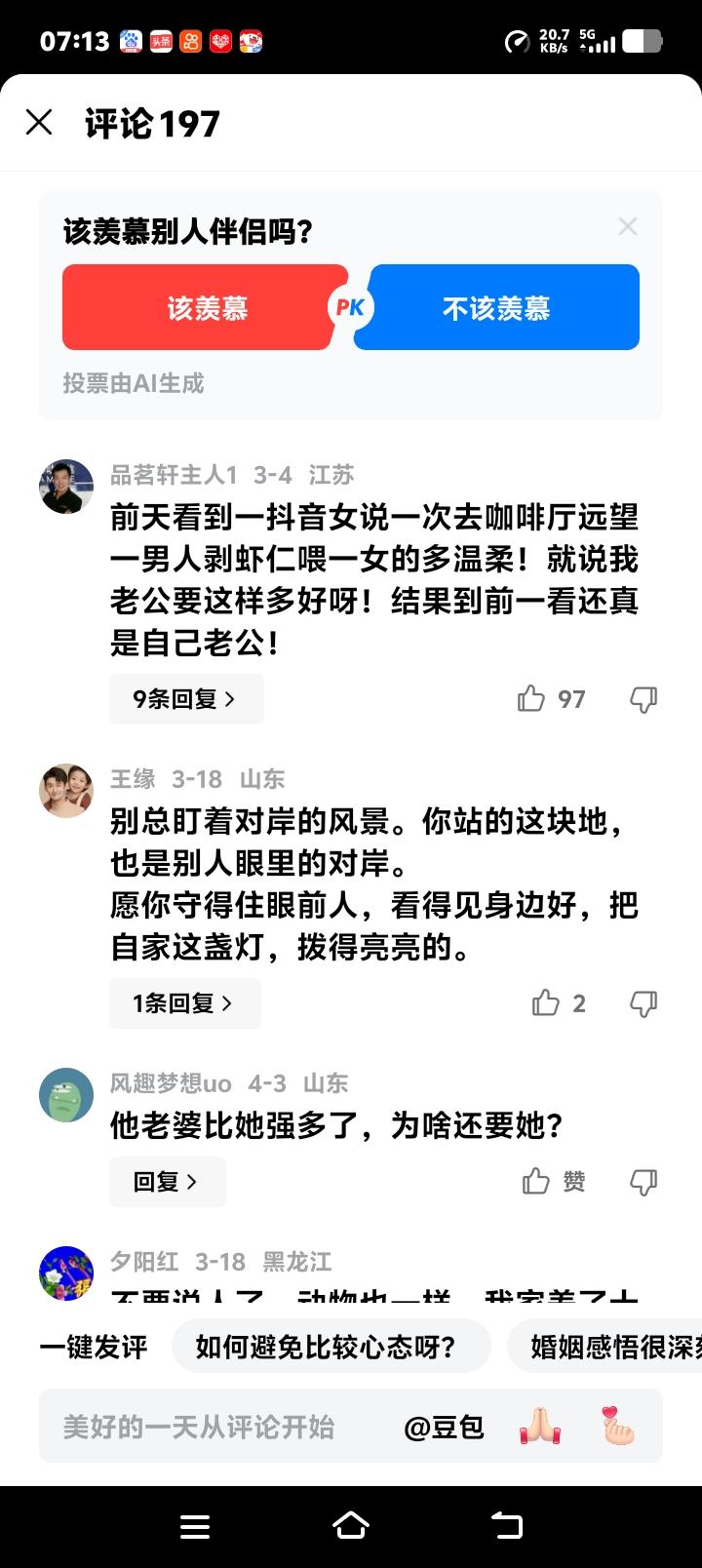 那则刷屏的抖音视频你看了吗?山东一位女士在咖啡厅,远远望见一个男人正温柔地给女伴剥虾,心里正羡慕“别人家的老公”如此体贴。走近一看,如遭雷击——那正是自己的丈夫。这一幕,撕开了多少婚姻最隐秘的伤疤:我们总在仰望和羡慕别人的幸福,一回头,却发现自己正被仰望和羡慕着。