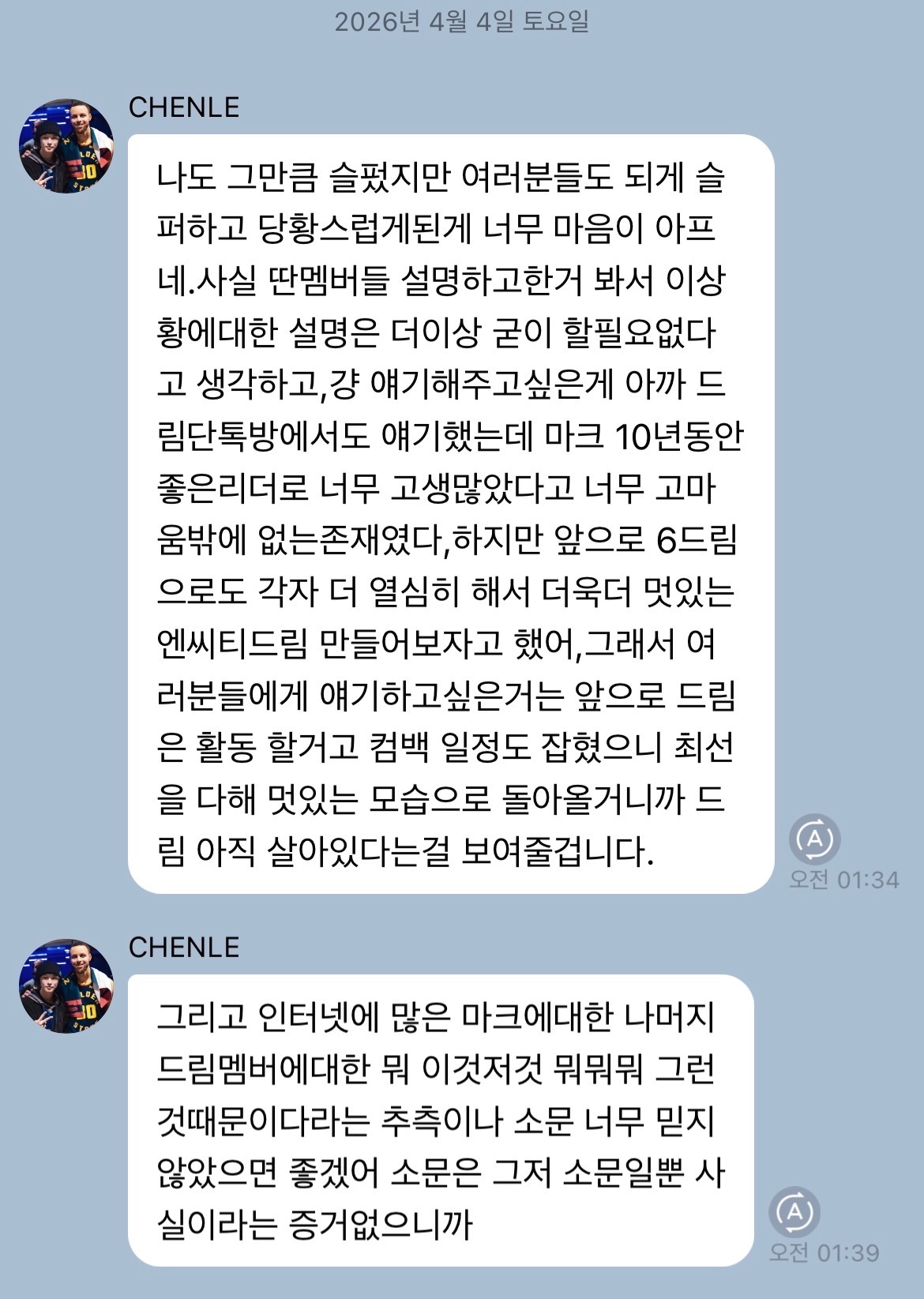 就像我伤心那样,让各位伤心和惊慌让我感到了伤心。看到了其他成员们说出的说明,我想对这一状况应该是不用在做过多的说明了,只想给你们说的是那会在DREAM群房间中也说过的那样,过去的10年马克作为里兜真的是太辛苦了,也是特别感谢的存在。不过未来还是想以6DREAM,各自更加努力,想带给大家带来更加帅气的NCT DREAM,所以想给大家说的是DREAM未来会继续活动,回归日程也定下来了会以最佳的状态回到大家身边让大家看到还“活着”的DREAM。