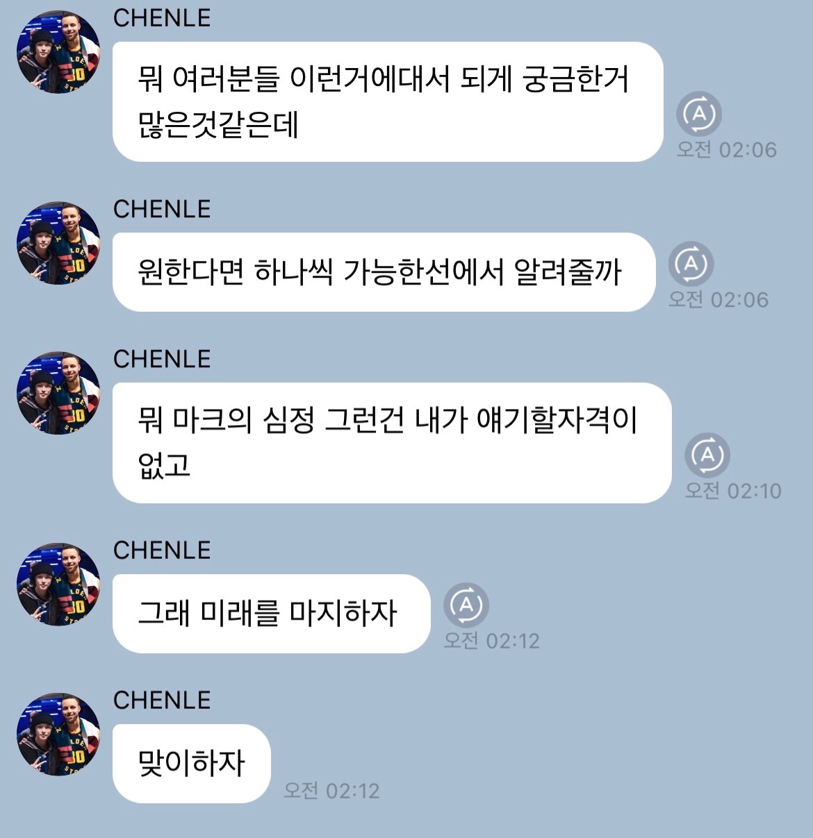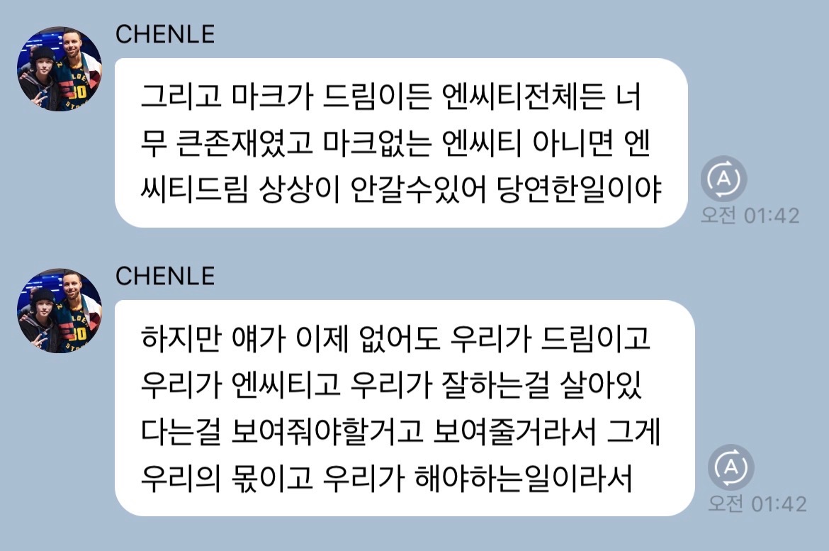 不过说实话这一状况确实是会让大家不喜欢李马克的情况,换做立场是我的话也会那么去想。但可以说的是马克是百分百爱你们、DREAM、127还有NCT全体的一个人,因此他做出这样的决定前和做出决定后的整个过程都交流了很多。