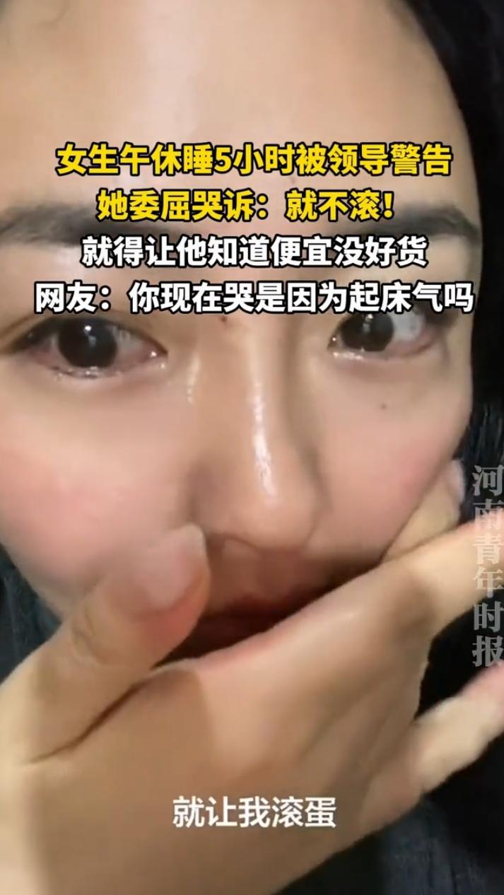 午休睡5小时被警告,女生崩溃哭怼:就不滚!便宜没好货! 河南一女生午休直接睡了5小时,被领导警告后崩溃哭诉,一句“就不滚”直接炸了全网! 她哭着说,自己就是要让领导知道,便宜没好货,想花最少的钱,让员工干最多的活,根本不可能! 网友笑疯了:“姐,你哭成这样,到底是委屈还是起床气没消?”“这波我站女生!午休睡5小时,说明公司根本没活干,领导还好意思警告?” 打工人的崩溃,往往就在一瞬间。你拿我当牛马,我凭什么给你卖命?别总想着用最低的成本,榨干员工的价值,真当打工人没脾气? 打工人
