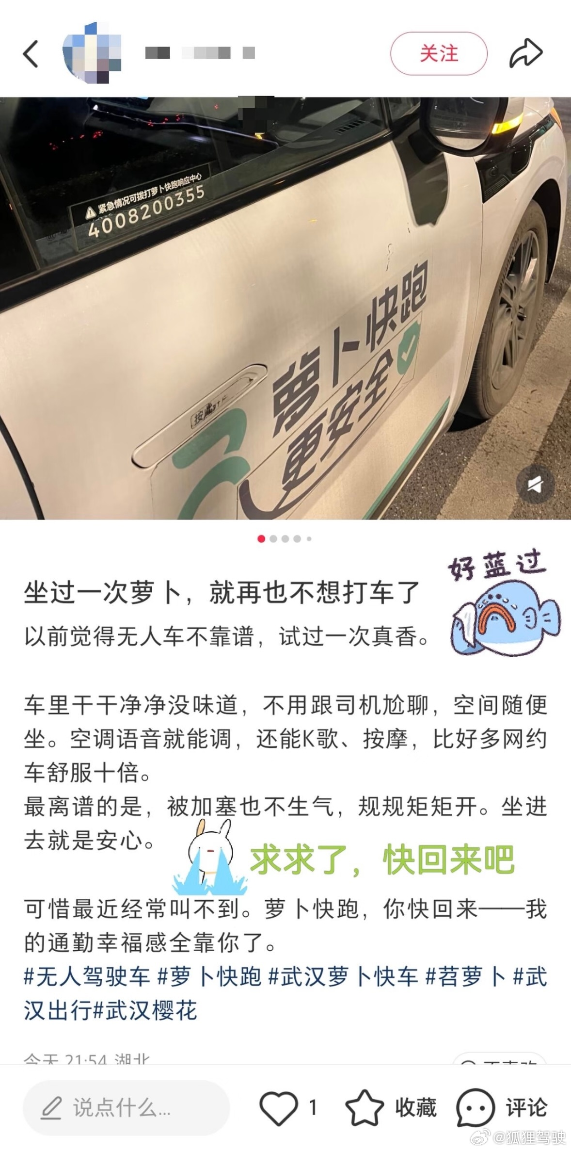 这几天刷手机,发现好多武汉人在说打不到萝卜快跑了。一开始没太在意,后来看多了才反应过来——这玩意儿在武汉已经不只是个新鲜事了。算本土成长起来的吧,从最早路上磨磨唧唧被人吐槽,到现在市区、高速、机场都能跑,价格便宜,有的还能K歌,成了不少人日常通勤的搭子。