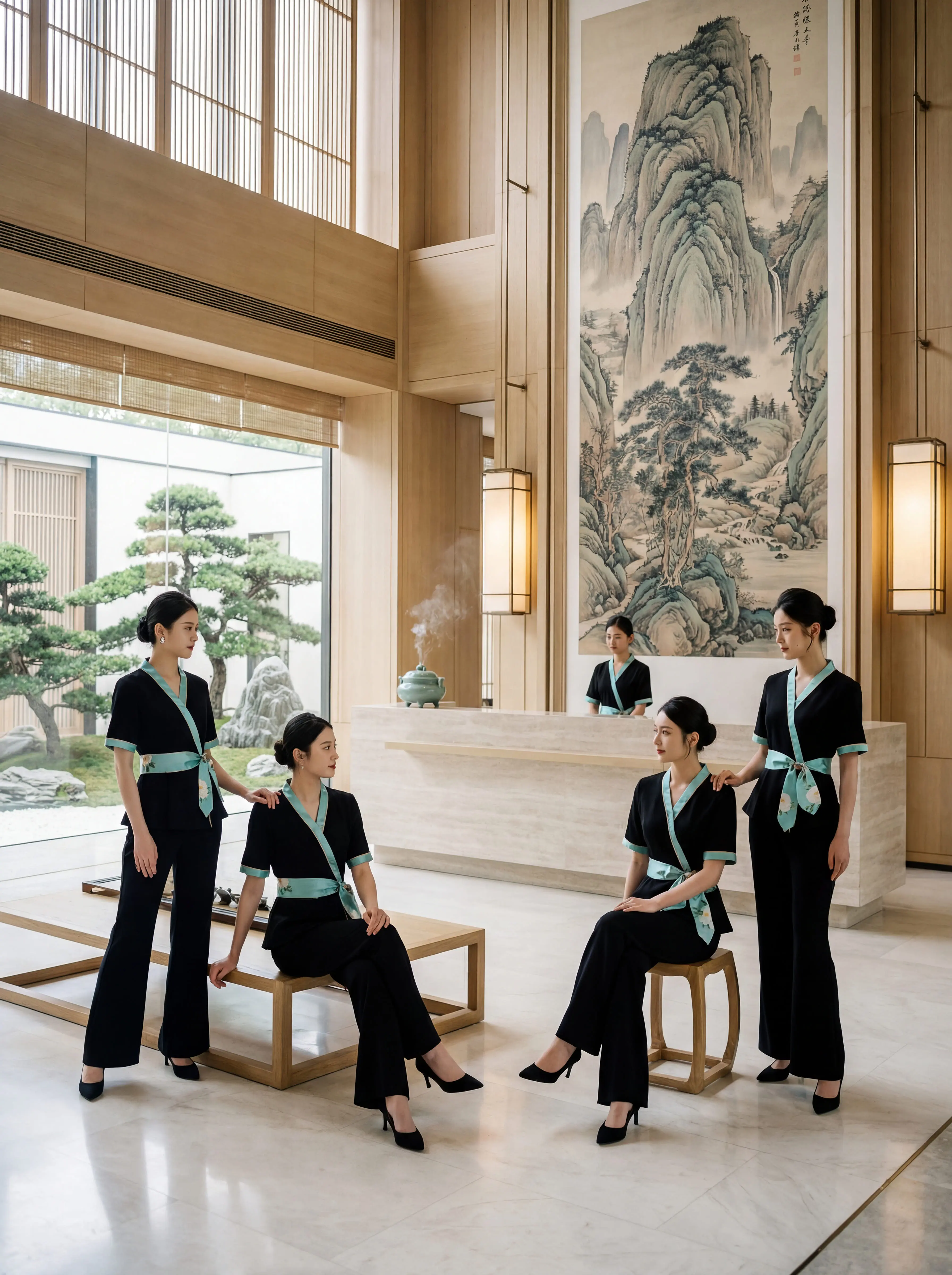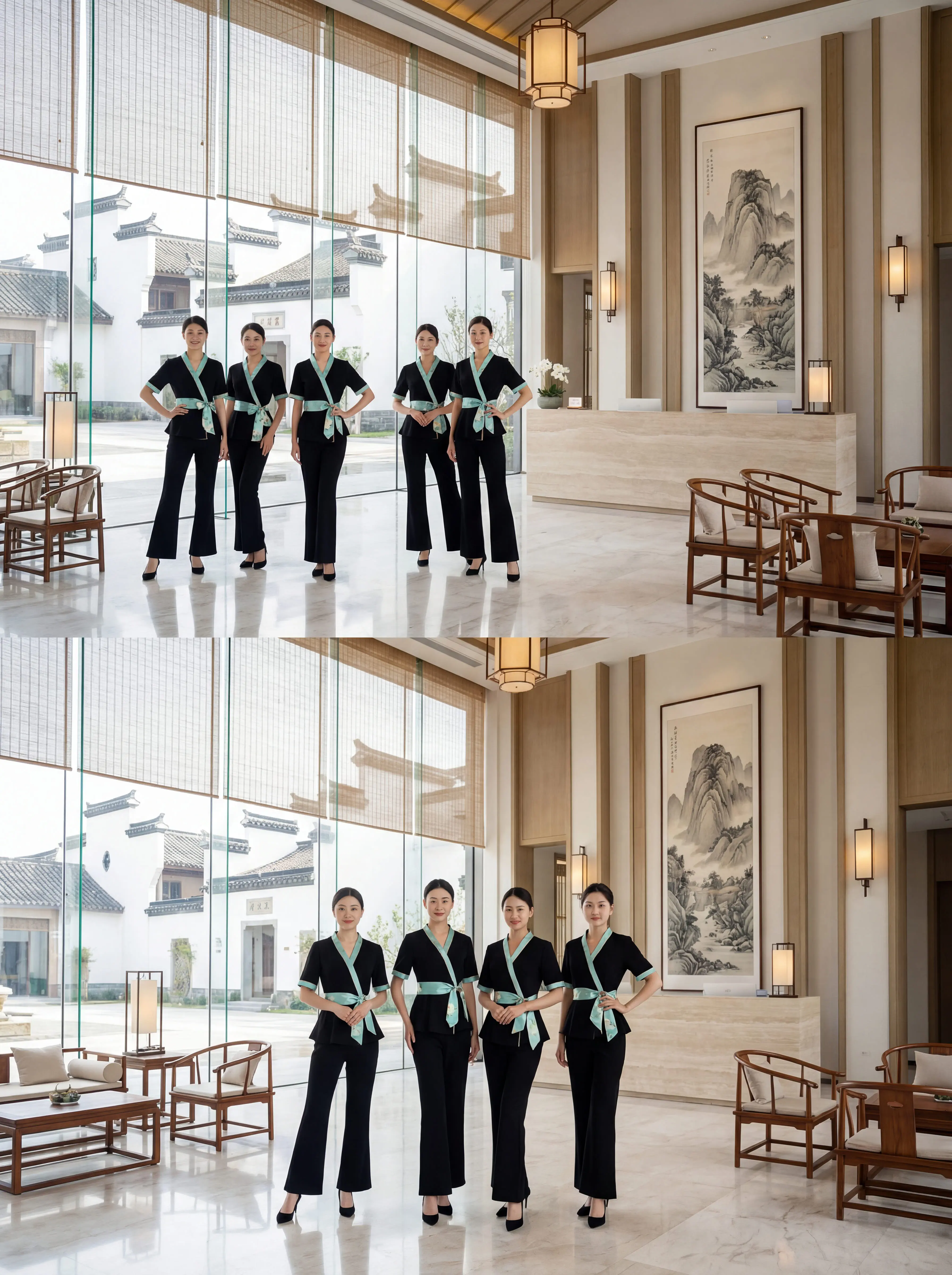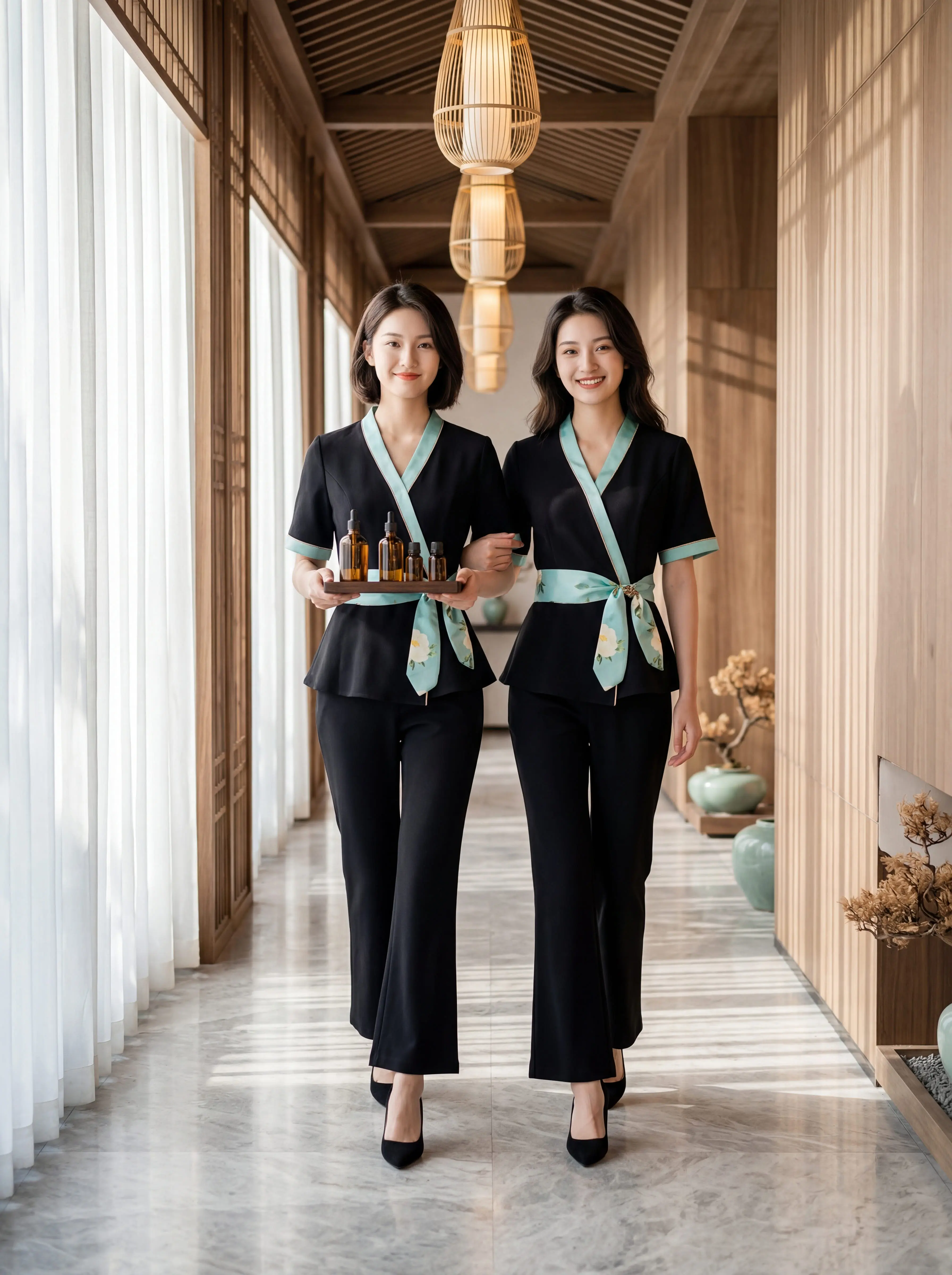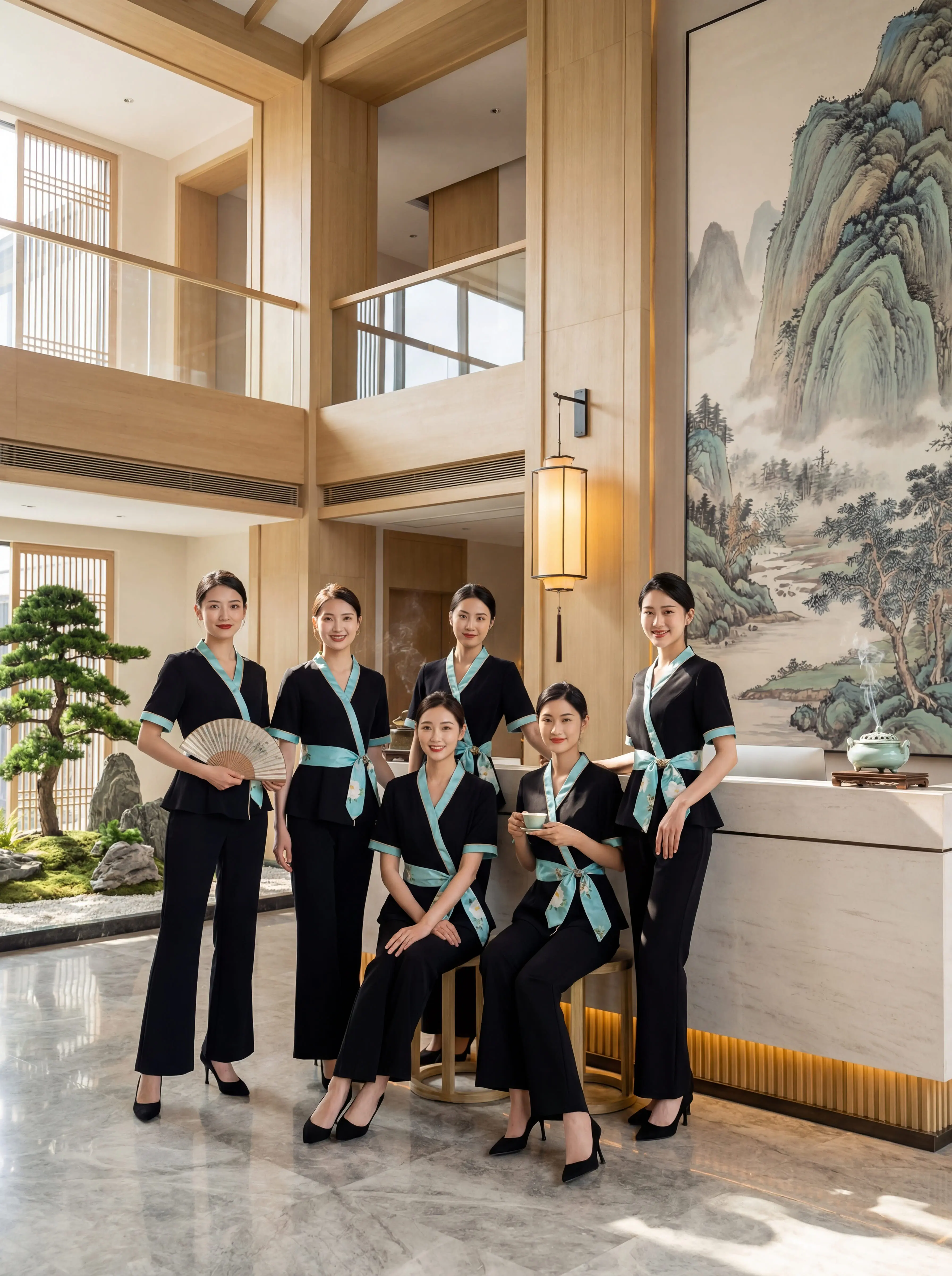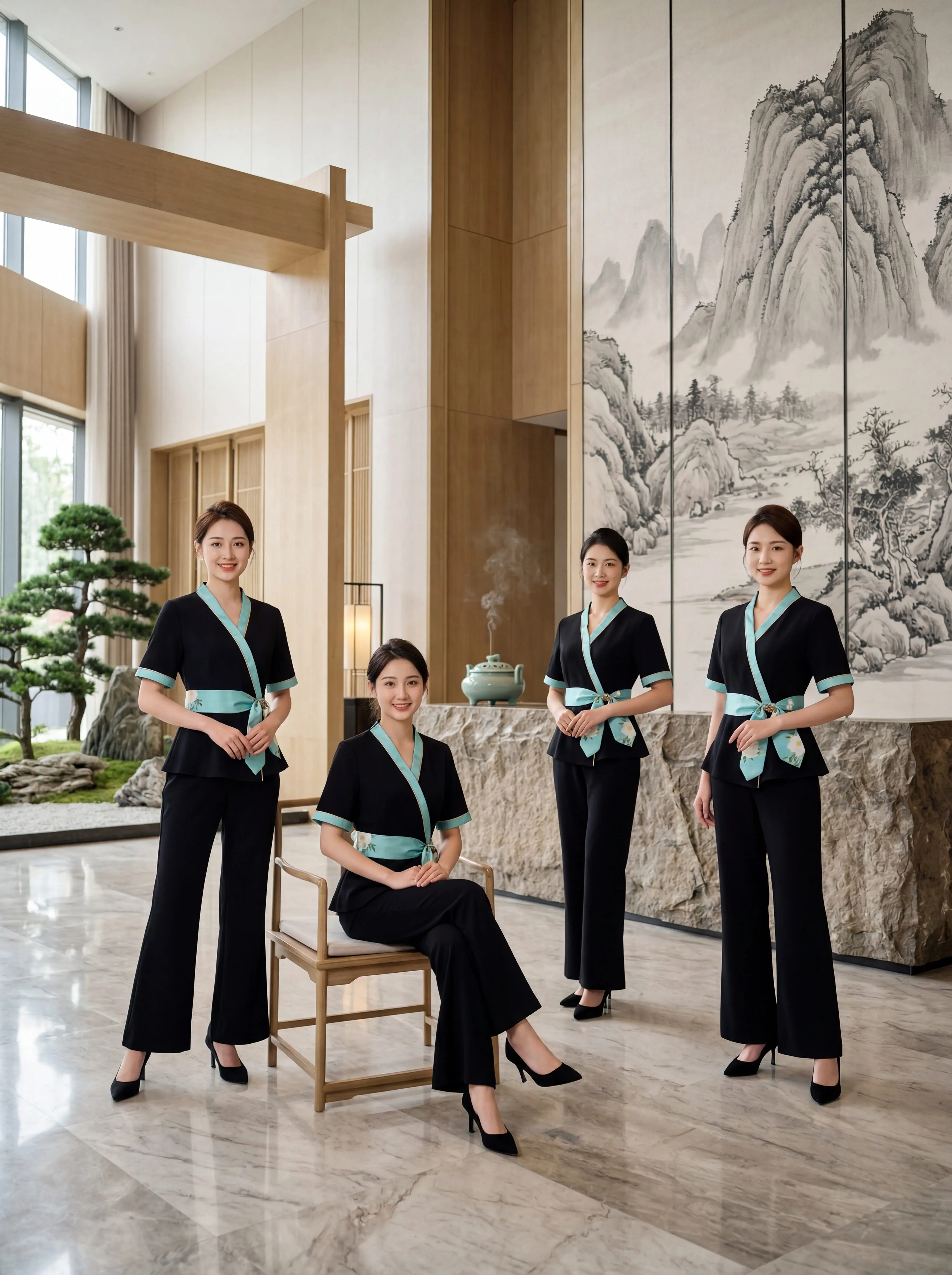 还在给员工穿老气横秋的工服?。经典黑底 + 清透薄荷绿撞色,中式交领 + 腰间系带, 东方韵味直接拉满!上衣收腰遮肚, 直筒裤藏肉显瘦,梨形、微胖身材全 hold 住! 面料抗皱透气,做护理、站一天都不闷不勒,耐洗耐穿,越穿越有质感!