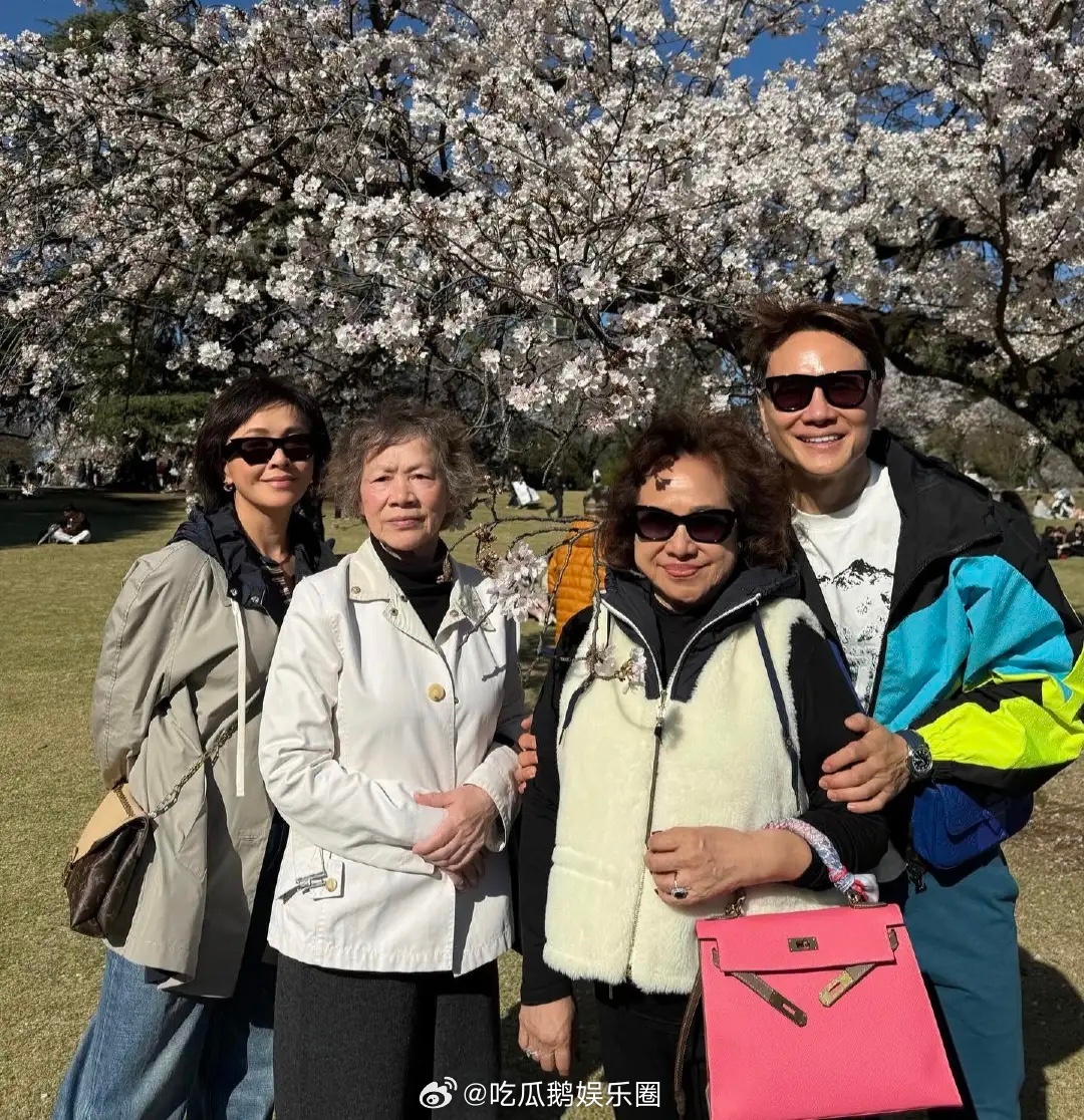60岁刘嘉玲和妈妈、弟弟等一帮亲人朋友到日本赏樱花,她的妈妈看起来好年轻,打扮贵