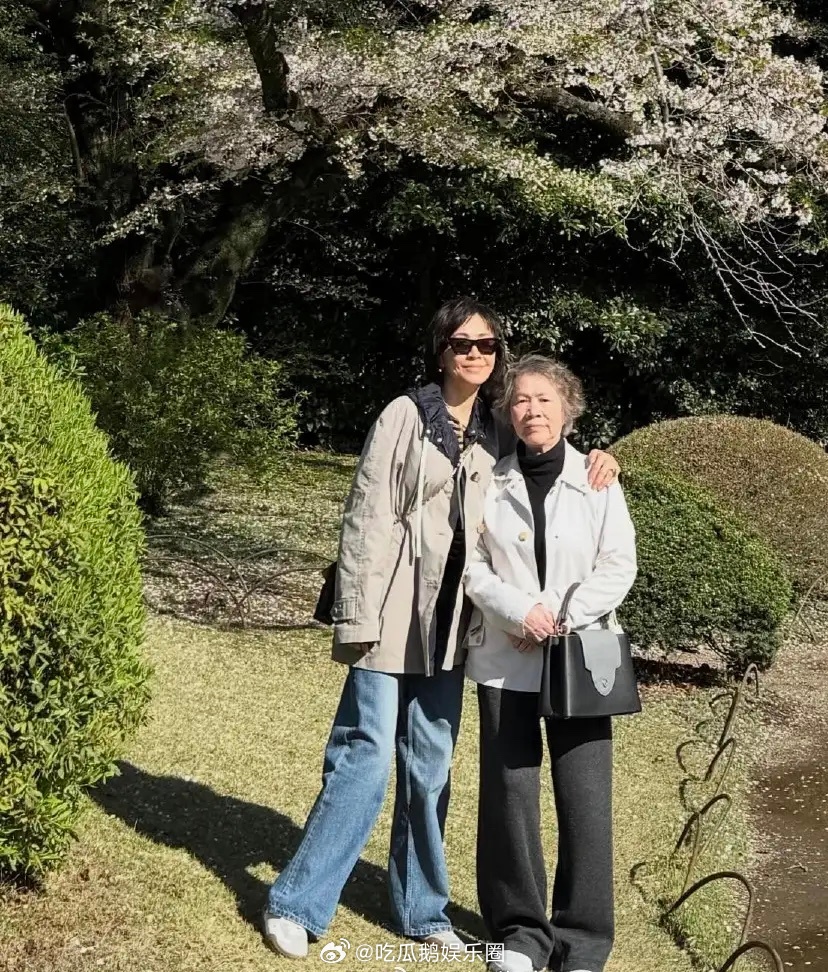 60岁刘嘉玲和妈妈、弟弟等一帮亲人朋友到日本赏樱花,她的妈妈看起来好年轻,打扮贵气,完全不像一个80多岁的老人。