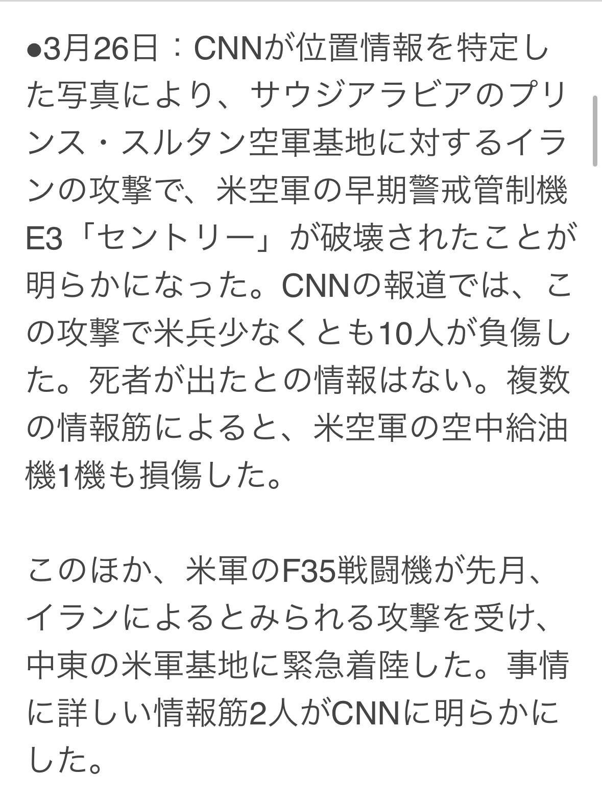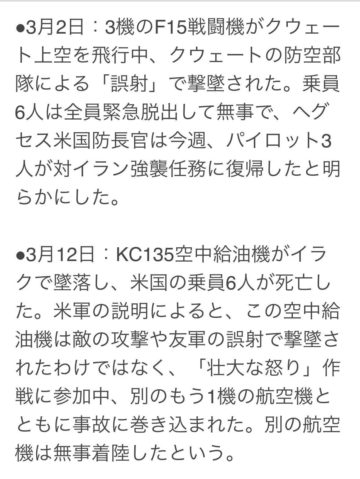 3月3日,美国空军两架F-15战斗机和一架A-10攻击机在两起独立事件中被击落,至此,在与伊朗的战争中,至少有七架有人驾驶飞机被摧毁。 ● 3月2日:三架F-15战斗机在科威特上空被科威特防空部队的友军火力击落。六名机组人员全部安全弹射。国防部长黑格斯本周宣布,其中三名飞行员已返回执行对伊朗的任务。 ● 3月12日:一架KC-135空中加油机在伊拉克坠毁,机上六名美国机组人员全部遇难。据美军称,这架加油机并非被敌方火力或友军火力击落,而是在大怒行动期间与另一架飞机被卷入事故,另一架飞机安全着陆。 ● 3月26日:一架美国空军E-3哨兵预警机,在伊朗袭击沙特空军基地后被摧毁。CNN报道称,至少有10名美军士兵在袭击中受伤,但没有人员死亡的报告。多方消息来源指出,一架美国空中加油机也遭到损坏。 此外,上个月一架美国F-35战斗机在遭到袭击后紧急降落在中东的一个美军基地,据信袭击者是伊朗。