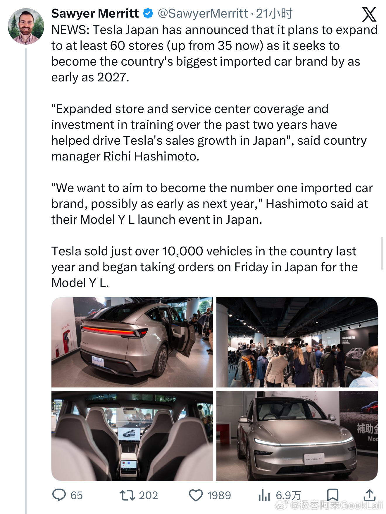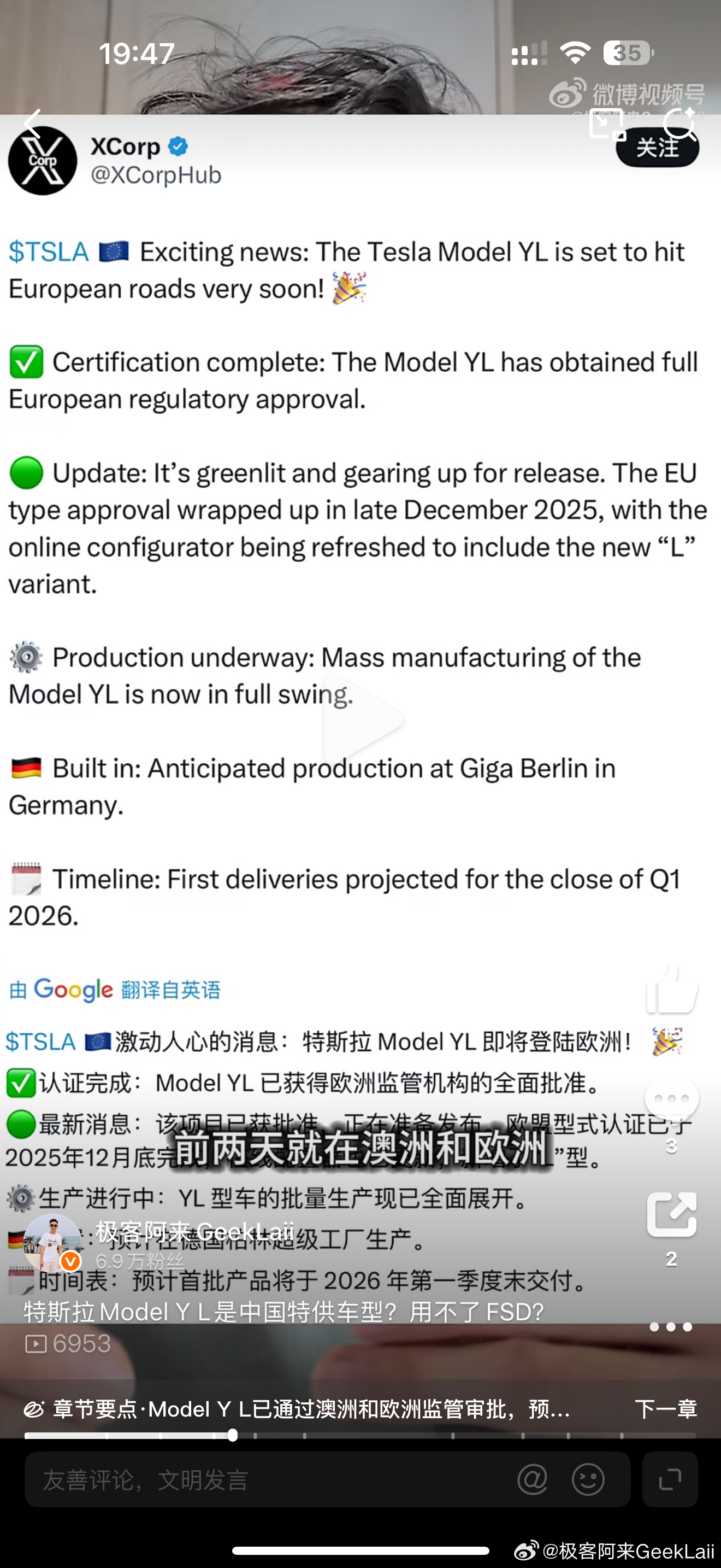 现在再回看半年前Model Y L刚在国内交付时好多人说Model Y L是中国特供车型,我发了条视频反驳说Model Y L就是全球车型。结果评论区一哥们一口咬定Model Y L就是中国特供车型,还搬出了各种“内幕消息”说两年内不会在非大陆地区运营还要跟我赌点啥半年过去了 事实胜于雄辩了网页链接网页链接特斯拉Model Y L目前已经在日本、泰国、韩国、中国香港、新加坡、马来西亚、中国澳门和菲律宾陆续上市了马上德国柏林超级工厂生产后,欧洲也会有很多国家和地区上市(欧洲已经备案车型了)