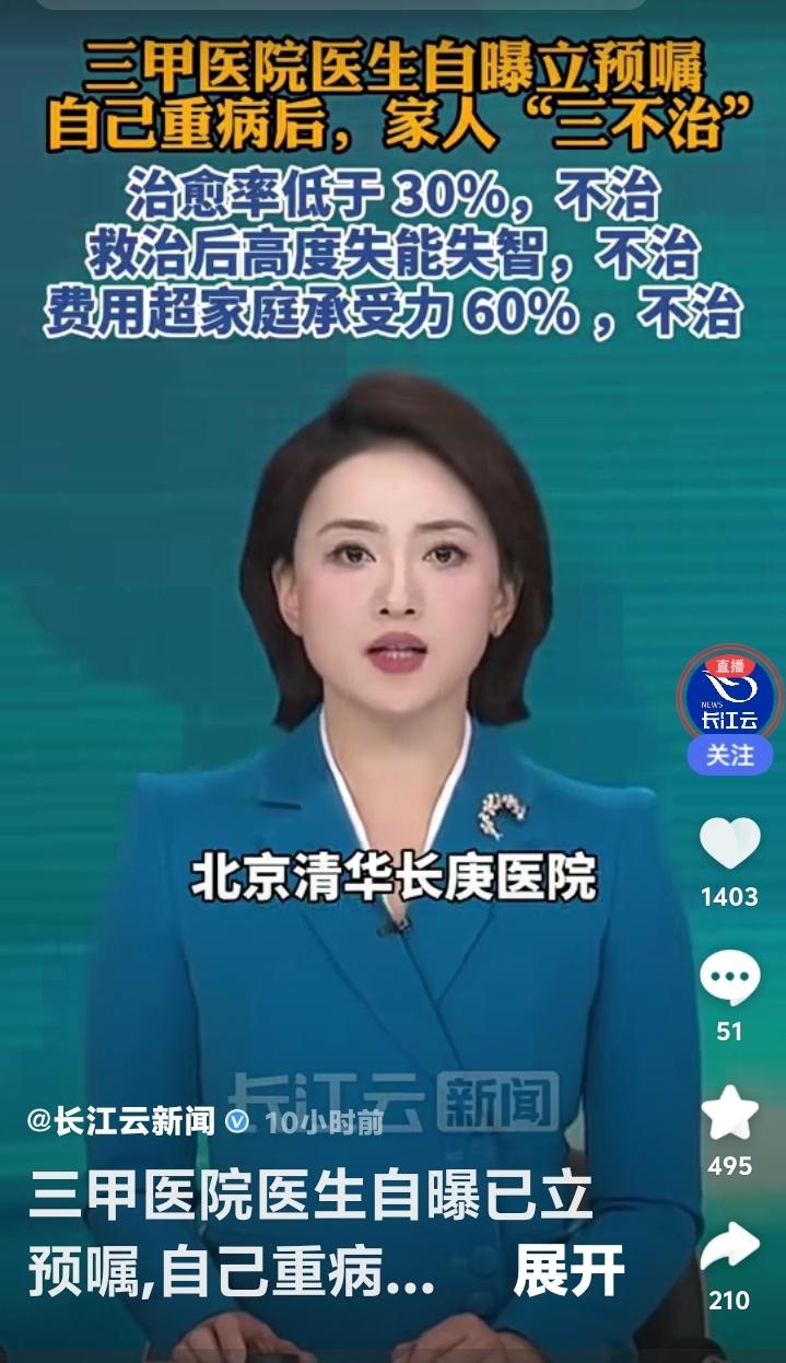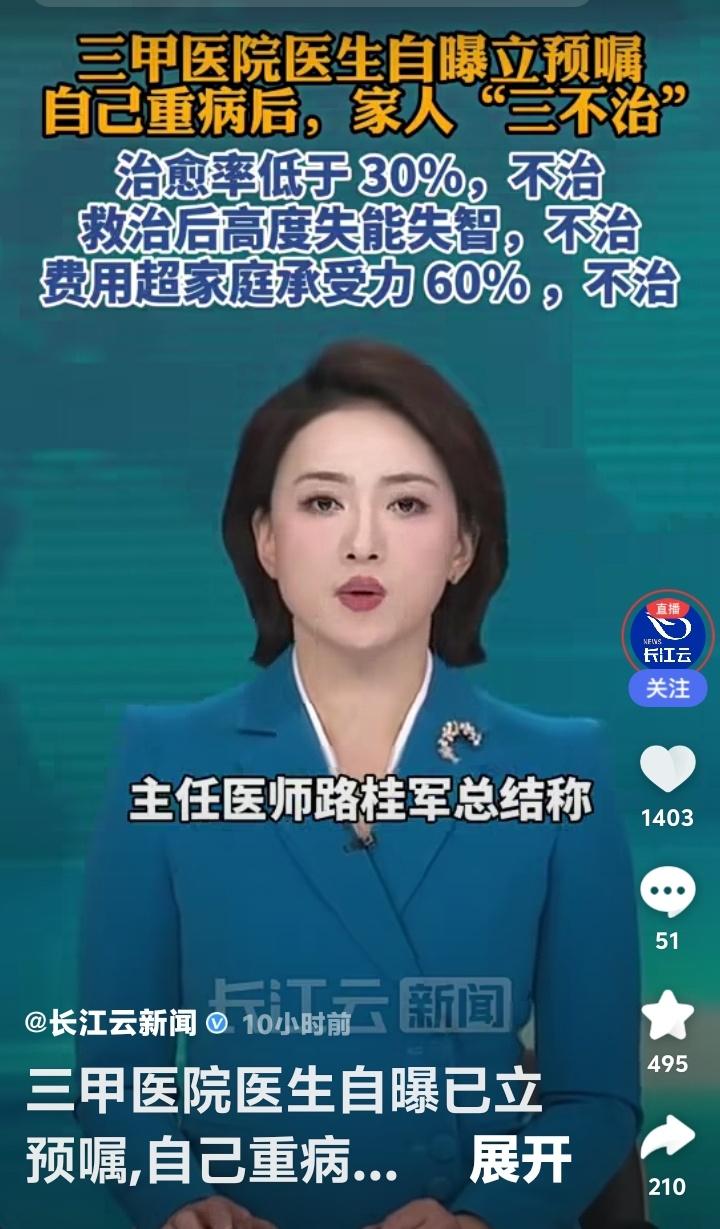 当一位救死扶伤的医生,亲笔写下自己生命末期的“放弃治疗书”,你会感到震惊还是理解?近日,一位北京三甲医院资深医生的自白引发全网激辩。他冷静立下预嘱:若自己重病,治愈率低于30%不治,救治后高度失能失智不治,费用超家庭承受力60%也不治。这纸“冷酷”声明,撕开了无数中国家庭最不敢直视的隐痛。