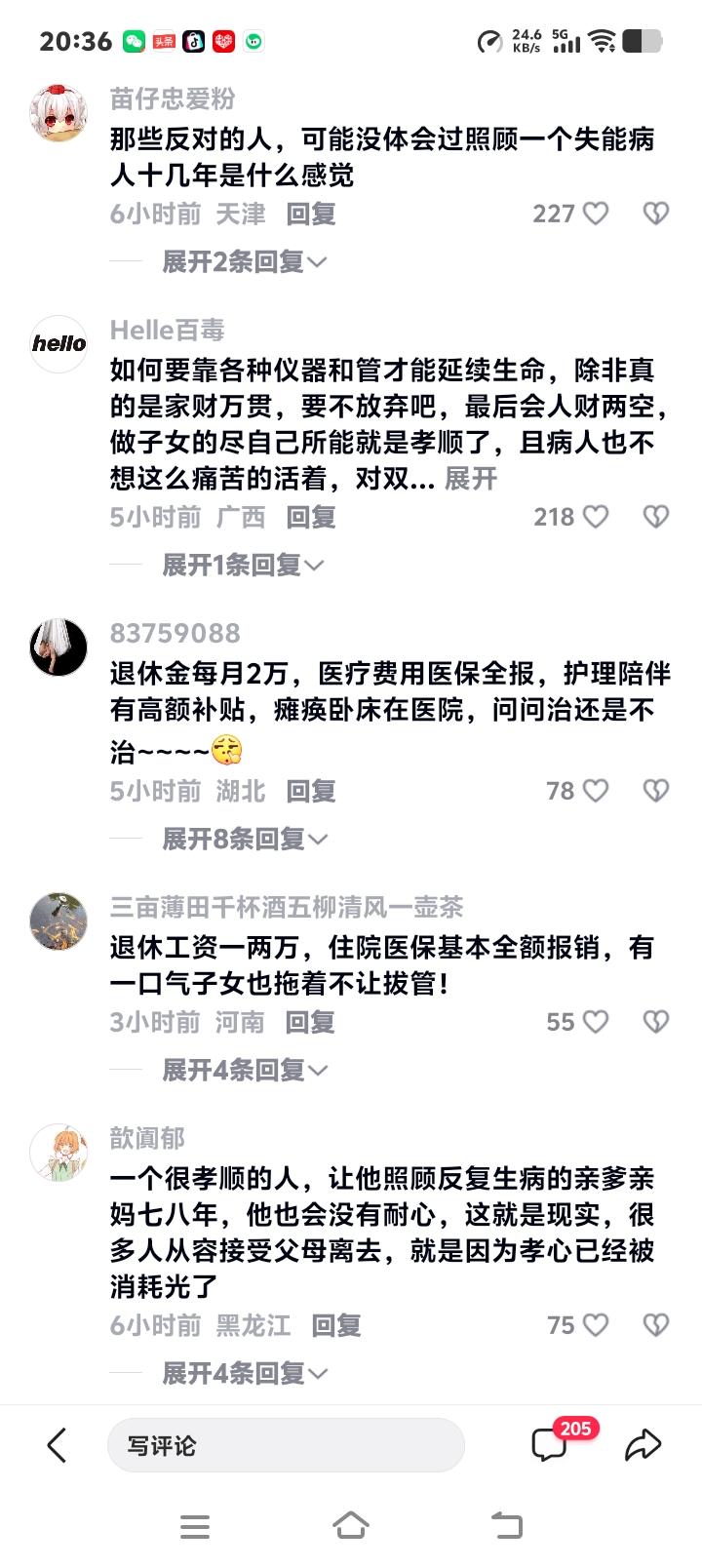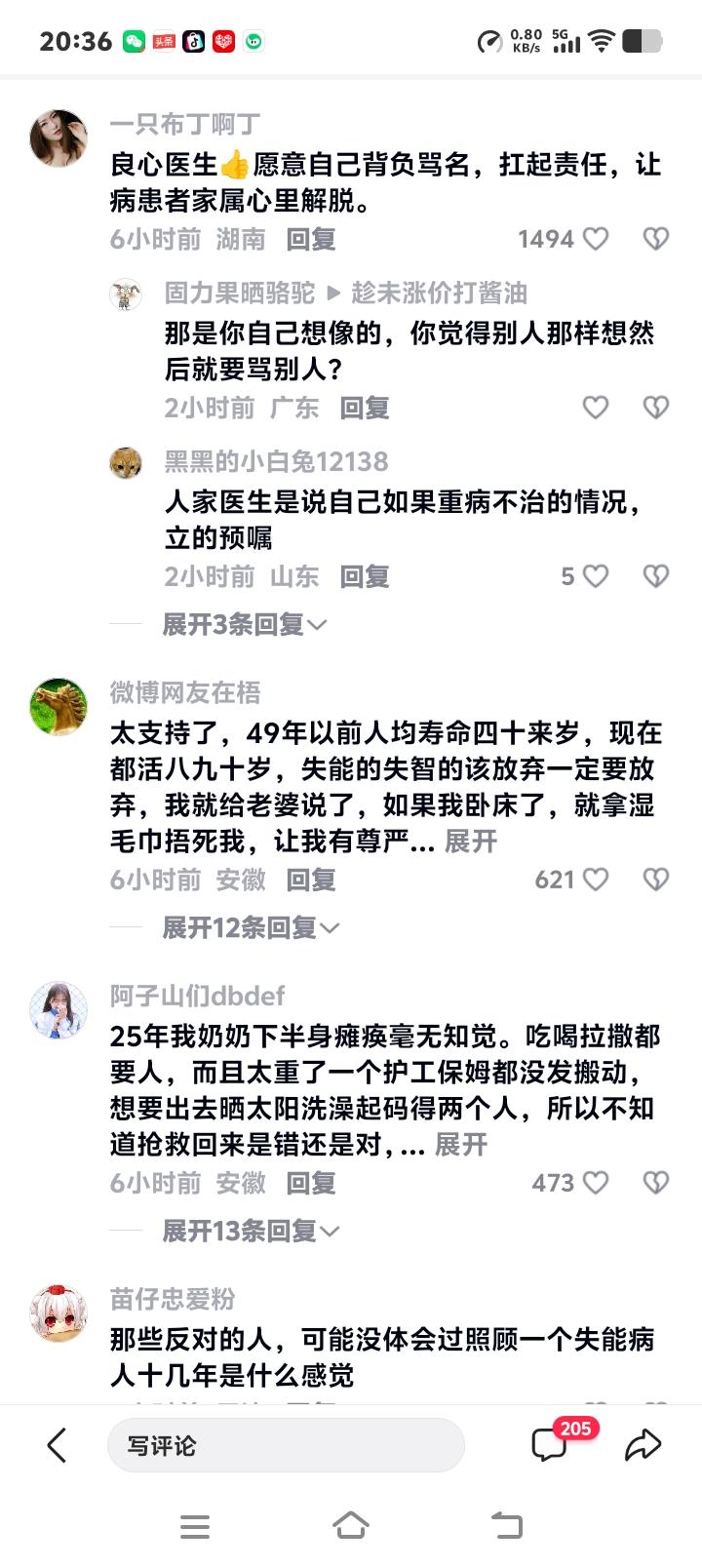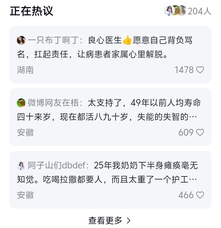 评论区瞬间涌入上万条留言。一位网友含泪写道:“我照顾瘫痪父亲八年,从孝顺到麻木,最后竟盼着他解脱……这话不敢说,却是千万子女深夜的泪。”另一个高赞回复说:“奶奶抢救后成了植物人,每天医疗费如流水,全家负债累累。若早有这样的预嘱,或许我们都好过些。”这些真实故事背后,是医疗、伦理与亲情的三重绞杀。