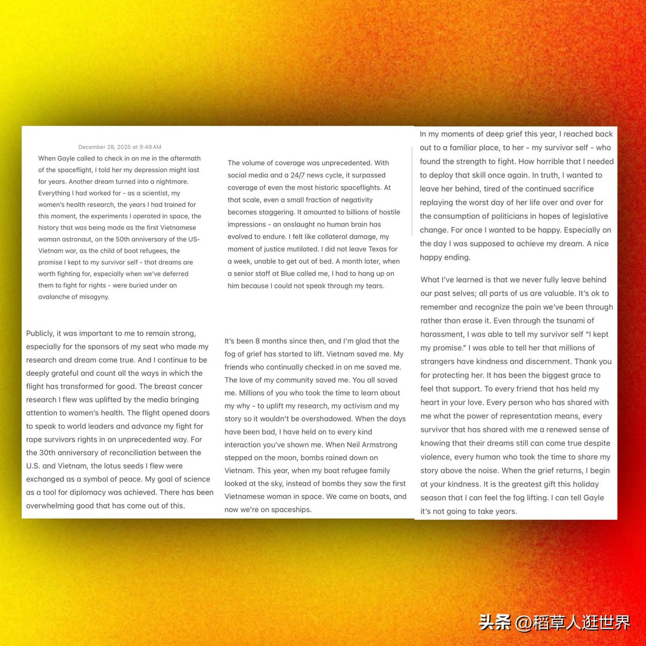 一个普通的女孩,因她的举动改变世界,获得了诺贝尔奖提名,还登上《时代》杂志。 22岁的阮玉(英文名阿曼达阮)在哈佛大学即将毕业时,遭遇了性侵。她当时有两个选择,不匿名报案,会影响她成为宇航员或者进入CIA的梦想未来,于是她谨慎匿名报案,却发现制度漏洞:如果匿名报案,证据套件仅能保存6个月,远低于该罪名15年的诉讼时效。 为留住寻求正义的权利,她深入研究全美法律后震惊的发现,有些州证据套件保存期限最短的竟然只有30天! 她不服!2014年,阮玉创立了纯志愿者组织“Rise”,从零预算奔走国会。面对众人,她始终坚定讲述:“这件事发生在我身上,而我现在就坐在你面前。” 2016年,她推动的《性侵幸存者权利法案》参众两院全票通过,由奥巴马签署生效。24岁的她,让全美幸存者拥有了证据免费、结果透明、到期通知的法定权利。 更传奇的是,她从未放弃太空梦。2025年,她搭乘蓝色起源火箭飞入太空,成为首位进入太空的越南裔女性。 她用亲身经历证明,痛苦能淬炼出力量,梦想与正义,从来都不是二选一。 真实故事 女性力量 谁来为正义发声