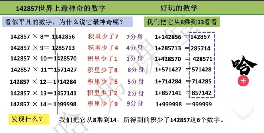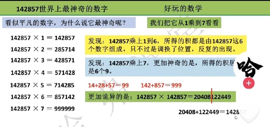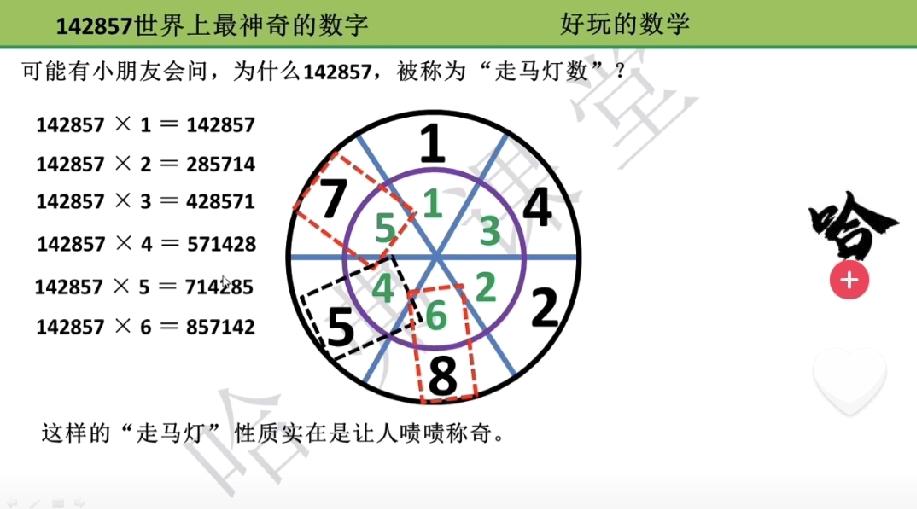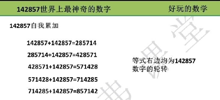 神奇的数字“7” 在我国的传统文化中,“七”是具有特殊意义的数字,不仅如此,还有不少的故事和传说呢!比如传说的“女娲七日造人”、七仙女下凡的故事、北斗七星;还有宗教中的七步生莲、七级浮屠、七窍七魂;丧葬文化中的祭祀日期也是以七天为一个阶段,人死后纪念日为一七、二七、三七、五七和尽七(七七);汉语成语中有七彩祥云、七星高照、七情六欲、七上八下和七老八十等等。 西方文化中也有关于“七”的传说:上帝用六天创造世界,第七天休息,代表着圆满和完美。结合人眼可见的七颗天体,就形成了七天为一周的时间制度。 搜索一下关于七的神奇故事时,又发现了与7有关的更神奇数字“142857”。那就是1/7=0.142857这六个循环数字,看着这六个数字没有任何规律,可是,用任何数字乘142857,结果都是在这六个数字中间转圈,除了乘9,结果是999999外。 数学家发现“142857”是世界上最神奇的数字,给它起名叫“走马灯数字”。看看这几张图片你就明白了。 哈哈,没有想到,神奇的数字7后边还有更神奇的“142857”哈!