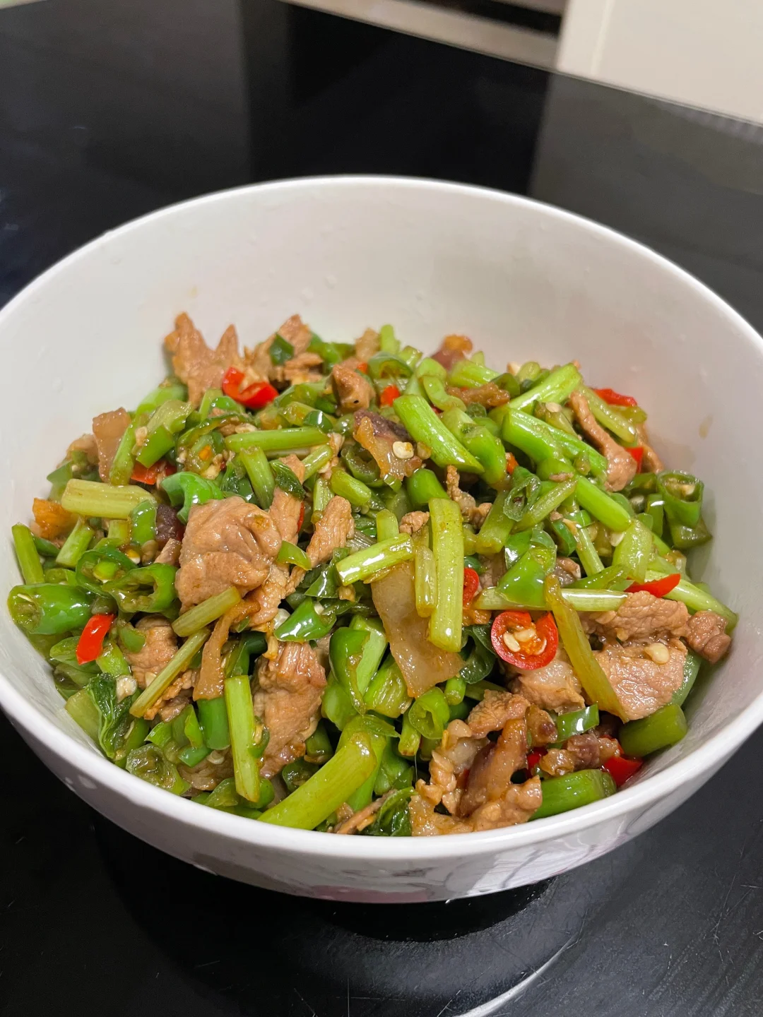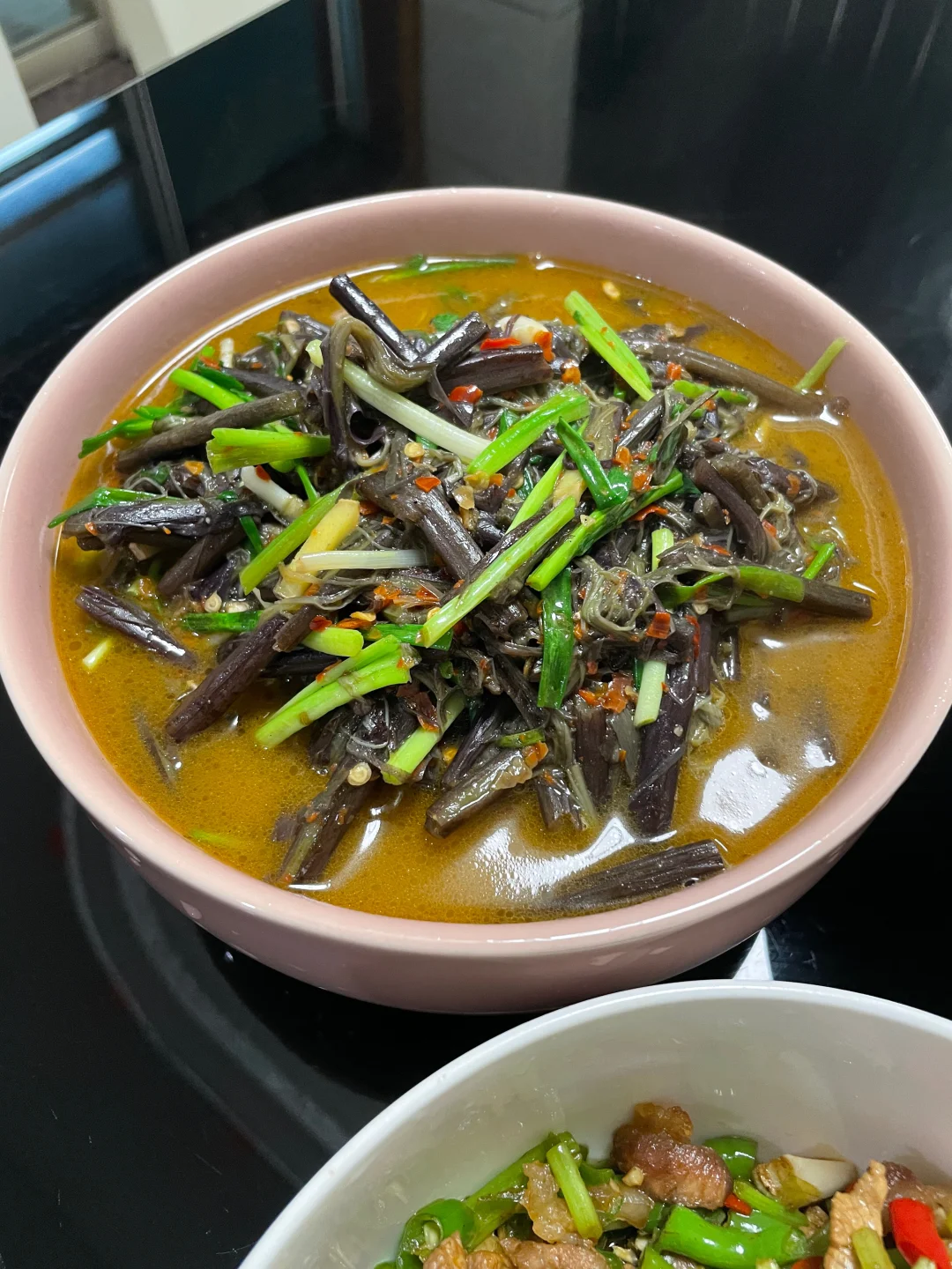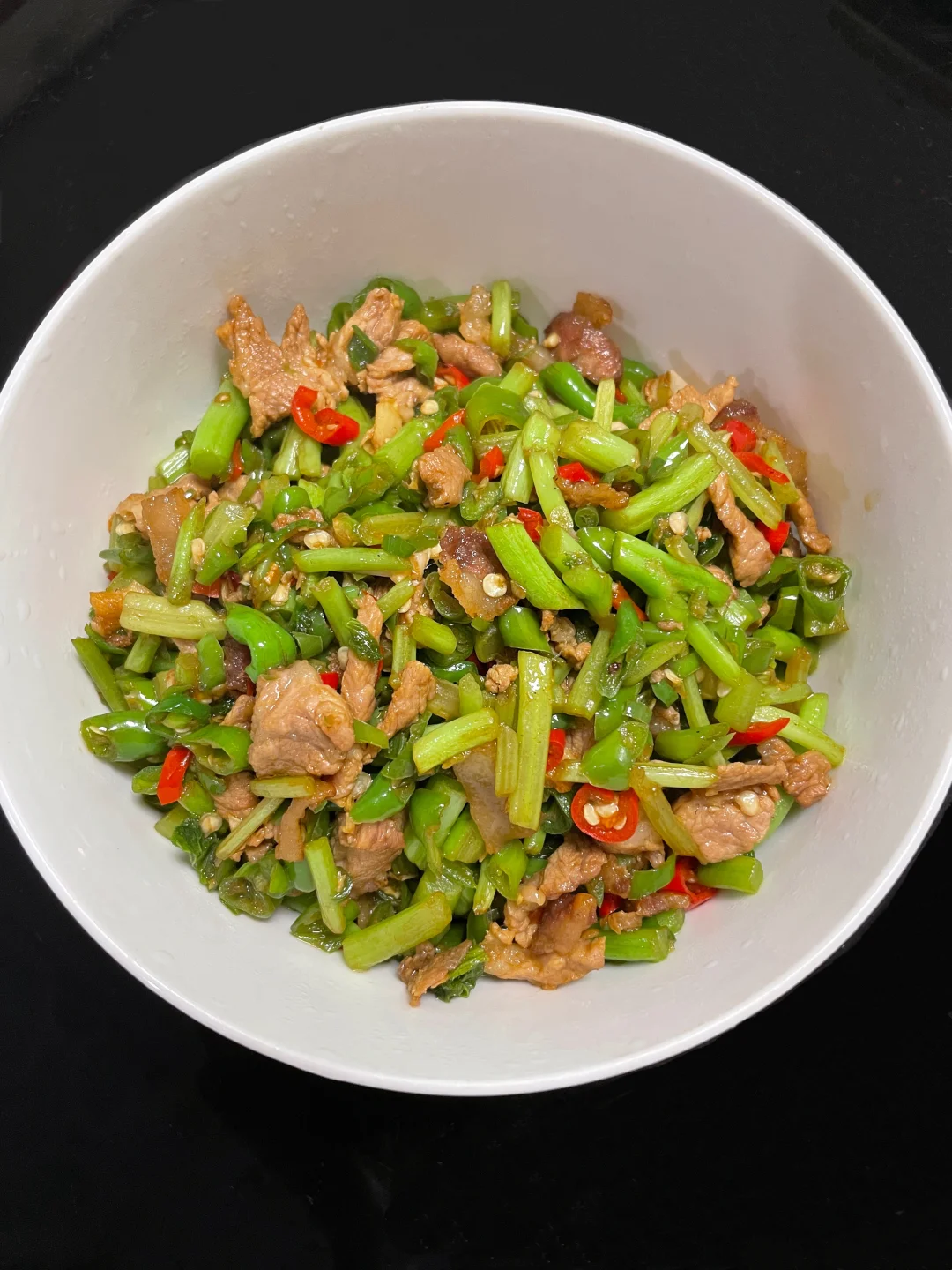 今日菜谱[庆祝R] 东汉菜梗炒肉 清炒蕨菜 酸辣藕尖