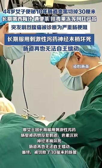 “悲剧还是发生了!”陕西,一女子因为便秘,长期喝西梅汁、通便茶等饮品,一坚持就是10年,结果前段时间女子总是肚子疼,5天都没排便,去医院一查被确诊为严重肠梗阻,肠道再也无法自主蠕动。网友:糊涂! 陕西西安 44 岁的廖女士,因十年便秘问题长期服用各类通便产品,最终被确诊为严重肠梗阻,肠道彻底丧失自主蠕动能力,这一事件在网络上引发广泛热议,网友纷纷感慨其行为 “太过糊涂”。 廖女士的便秘困扰始于十年前,彼时她 30 出头,与丈夫结婚未满两年,最初仅为两三天排便一次,并未引起重视,丈夫还曾调侃其吸收能力强,食物营养全被身体吸收,故而粪便较少。 随着时间推移,排便间隔逐渐延长至四五天,她仍未前往正规医院就诊,仅偶尔与朋友倾诉症状。 朋友的推荐成为廖女士通便之路的转折点。 有人向其推荐宣称 “中成药、无副作用” 的通便胶囊,也有人在朋友聚会时介绍网红通便茶,称其为纯天然成分,见效快且无不良影响。 廖女士抱着尝试的心态使用这些产品,发现排便效果显著,腹部坠胀感也随之消失,自此开始长期依赖此类产品。 依赖形成后,廖女士的使用频率与剂量不断攀升。 初期仅偶尔使用,后演变为每日必备,用药剂量从最初的一次一粒,逐步增加至一次多粒。 停用产品后,便秘症状会明显加重,三四天无法排便的情况时有发生,这种恶性循环让她无法摆脱对通便产品的依赖,十年间她陆续尝试了排毒果冻、西梅汁等各类网红通便产品,只要宣称有通便功效,便会跟风购买。 她还曾查看通便胶囊的成分表,看到大黄、番泻叶等常见中药成分后,便认为产品绝对安全,完全忽略了长期使用中药成分的潜在风险,从未考虑过咨询专业医生或了解产品副作用。 今年年初的深夜,廖女士突发剧烈腹痛,疼得冷汗直冒、蜷缩在沙发上无法动弹,脸色发青,连正常说话都十分困难。 接下来的五天,她连续未排便,腹部胀如鼓,喝水都感到恶心,家人见状立即将其送往西安市人民医院(西安市第四医院)救治。 急诊医生接诊后,迅速为廖女士安排全面检查,最终确诊为严重急性肠梗阻,肠道已完全失去自主蠕动能力。 医生先采取禁食、灌肠、静脉补液等保守治疗方式,三天后,肠道仍无任何蠕动反应。 主刀医生赵东波告知家属,情况危急,需立即手术,否则肠道坏死将危及生命,家属随即签字同意手术。 手术持续四个多小时,医生切开廖女士腹腔后,发现其一段结肠失去弹性,肠壁呈墨汁般黑色,摸上去硬邦邦,经诊断,肠道神经末梢已大面积坏死,最终切除了 30 公分病变肠管,才将其从危险边缘拉回。 术后廖女士得知自身病情,看着身上的刀口,满心悔恨,却无法挽回受损的肠道。 医生解释,其病症为泻剂结肠与黑肠病,由长期服用蒽醌类刺激性泻药导致,即便长期大量饮用西梅汁,也会扰乱肠道正常节律,加重便秘。 此类案例并非孤例。 浙江 52 岁女士因长期便秘,八年持续服用网红通便果冻与蒽醌类泻药,近期因腹胀如鼓、七天未排便就医,被确诊为黑肠病与不完全肠梗阻,肠道神经末梢坏死,需长期药物调理,无法恢复自主蠕动。 事件曝光后,网络上网友反应热烈。 不少人表示自身也在使用同类通便产品,看完廖女士的经历后即刻停用;有人指出网红通便产品乱象,呼吁平台加强监管,杜绝虚假宣传误导消费者。 还有人感慨,小小的便秘本可通过科学方式解决,却因错误选择酿成悲剧。 便秘作为常见的身体不适,成因复杂,涉及饮食结构、饮水量、运动情况及不良排便习惯等,部分器质性疾病也会引发该症状。 盲目依赖通便产品仅能暂时缓解症状,却无法解决根本问题,还会对肠道造成不可逆损伤。 正确的应对方式应为初期调整生活方式,增加膳食纤维摄入、多喝水、适度运动、养成规律排便习惯,若症状未改善,及时前往正规医院诊断治疗,切勿轻信偏方或网红产品,避免重蹈廖女士的覆辙。 如果各位看官老爷们已经选择阅读了此文,麻烦您点一下关注,既方便您进行讨论和分享,又能带来不一样的参与感,感谢各位看官老爷们的支持!
