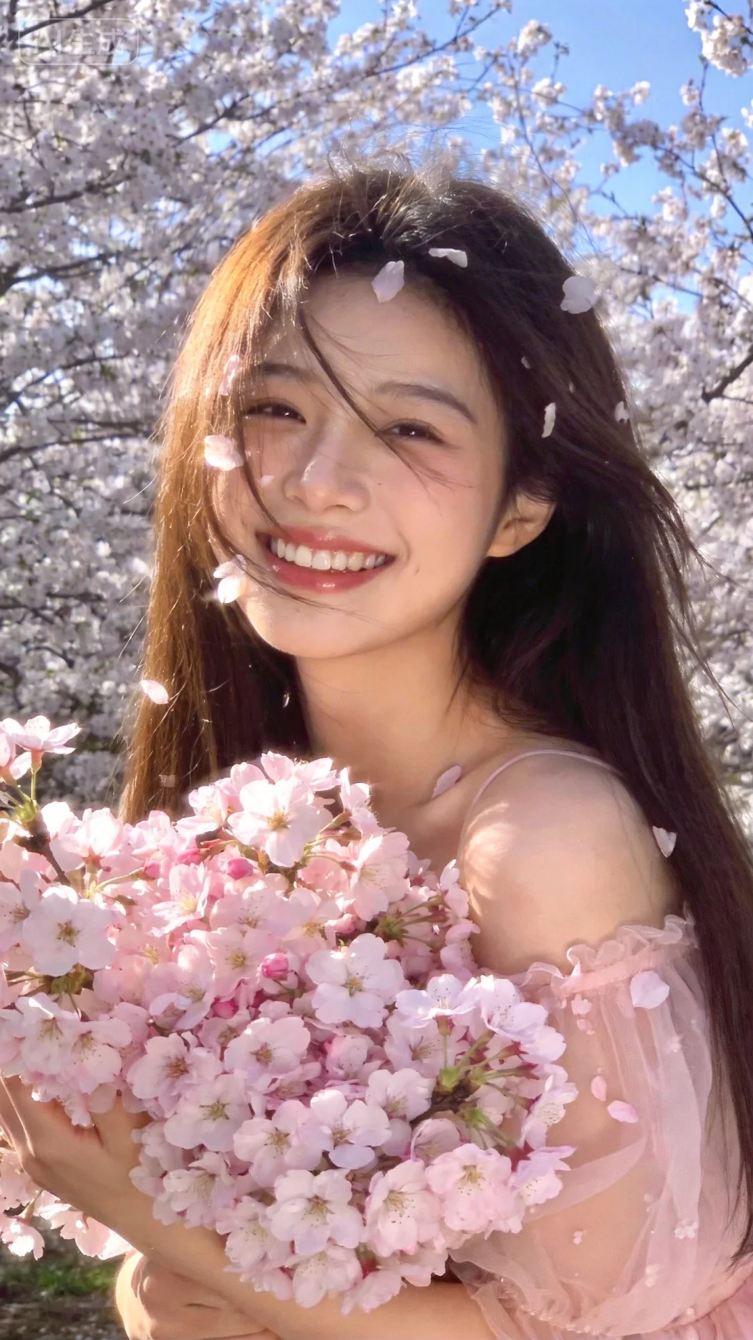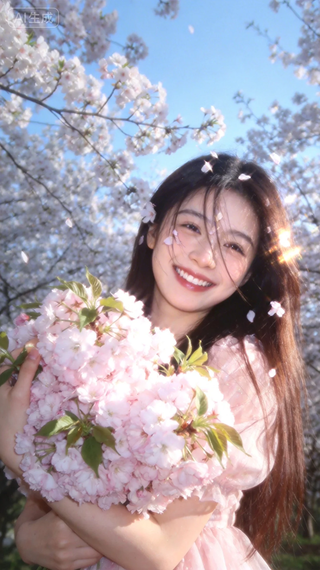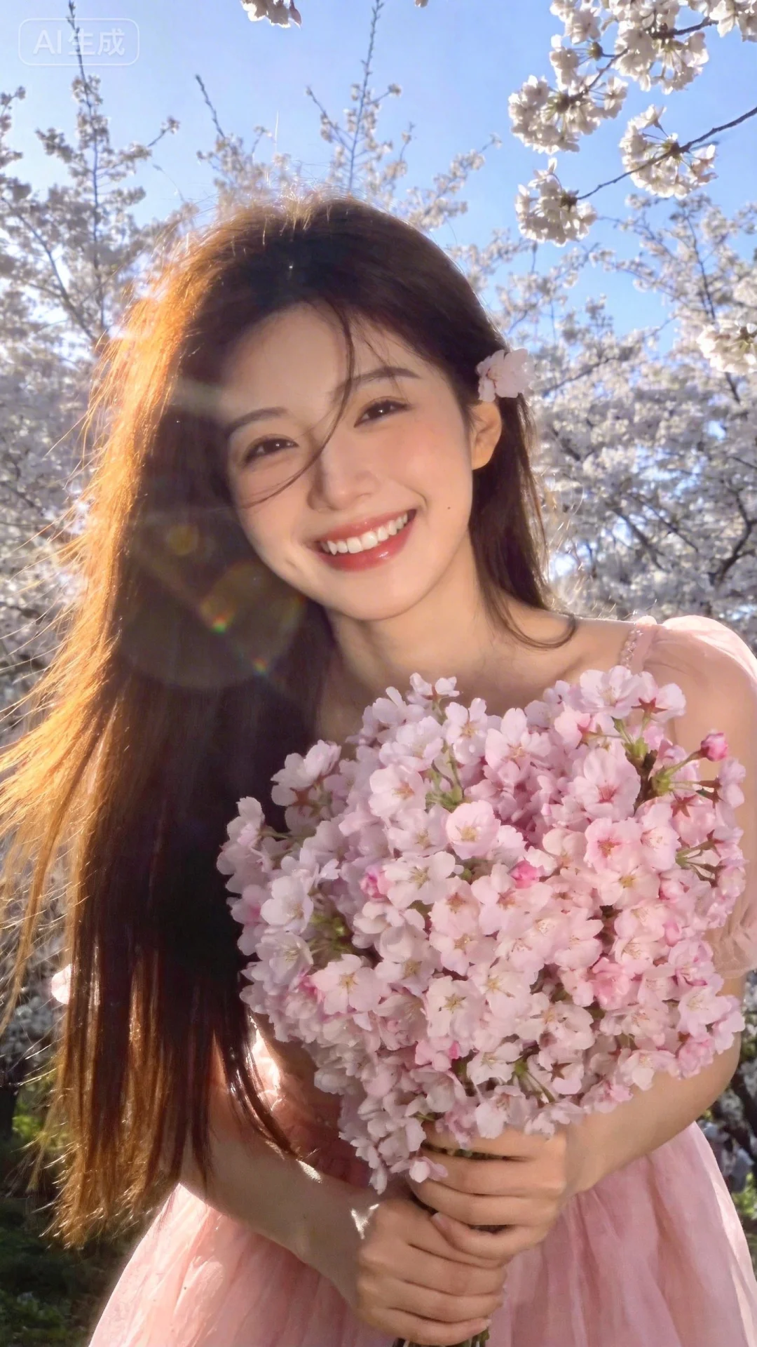 保持人物五官和脸型不变,无面部变形、无五官模糊、无磨皮过度。表情温柔,真实。真人写真,朦胧美学,网感图片,穿着粉色仙女裙,冷白皮长相甜美可爱的女生可爱纯俏皮灵动,棕色长直发,捧着一大束樱花,在樱花树园,花朵娇艳欲滴,女生开心地笑,风拂过发丝自然的落在脸颊,曝光补光,暖调滤镜,低光三分法构图,日系清新, 逆光照亮发丝, 樱花树背景,蓝天,樱花盛开, ccd画质,特写镜头, 平视镜头, 阳光光斑。生命力写真
