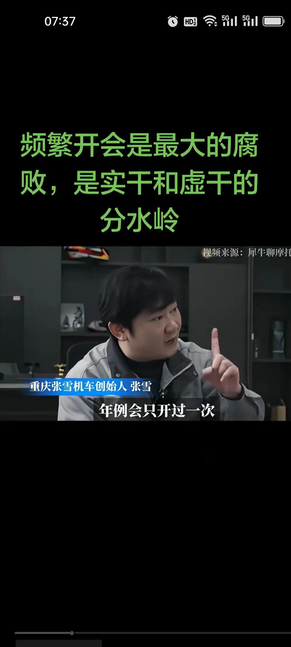 重庆张雪机车创始人张雪直言:频繁开会是最大的腐败,是实干和虚干的分水岭。公司成立至今,年例会只开过一次,没有周例会、月例会,没有层层汇报,管理层直接扎在一线,全公司仅3个层级,决策效率拉满。