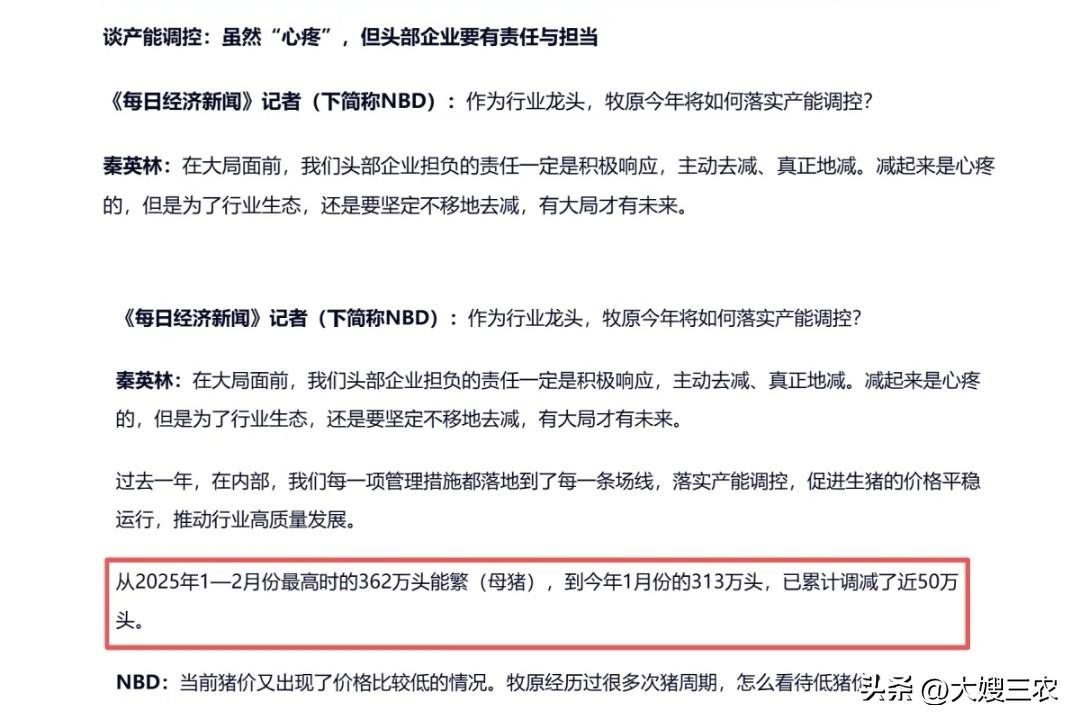响应去产能,牧原、温氏已经在行动,一个减母猪、一个减仔猪,殊途同归去产能! 先说牧原,根据每日经济新闻报道,牧原从2025年1-2月份的母猪存栏高峰362万头,下降到了2026年1月份的313万头,一年左右能繁母猪存栏减少了50万头。 作为养猪行业的“一哥”,到头降母猪存栏量,对于产能去化有很大帮助,但我觉得还可以再降一些,毕竟现在才能过剩比较严重,养殖端还需要齐心协力共同去产能。 再说温氏,近期在去产能说可以说是“另辟蹊径”,那就是向市场上年供应500万头鲜乳猪、烤乳猪等系列产品。这也是在实实在在去产能,因为减少了几个月后育肥猪的出栏量。 温氏算是养猪行业的“二哥”,能繁母猪存栏量也仅次于牧原。温氏2024年末能繁母猪存栏174万头,2026年2月末下降到了128万头左右,一年多下降了46万头,减少的还是很多的。 由于行业平均母猪PSY在提高,每头母猪年供应的仔猪数量增加。再加上猪企淘汰的母猪多是低效的,留下的母猪平均生产性能更好,所以截至目前养猪产能去化效果并不理想,还需要在各大猪企的带头下继续去产能!