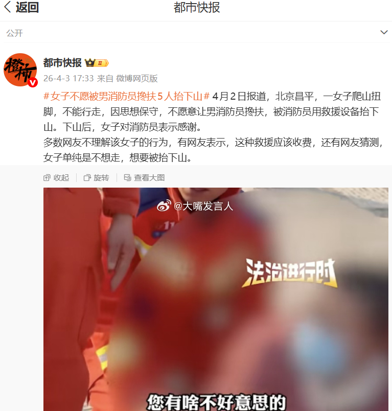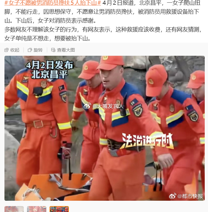 女子不愿被男消防员搀扶5人抬下山 碰上这样的人,也没什么太好的办法吧【不能行走,因思想保守,不愿意让男消防员搀扶,被消防员用救援设备抬下山】热点观点