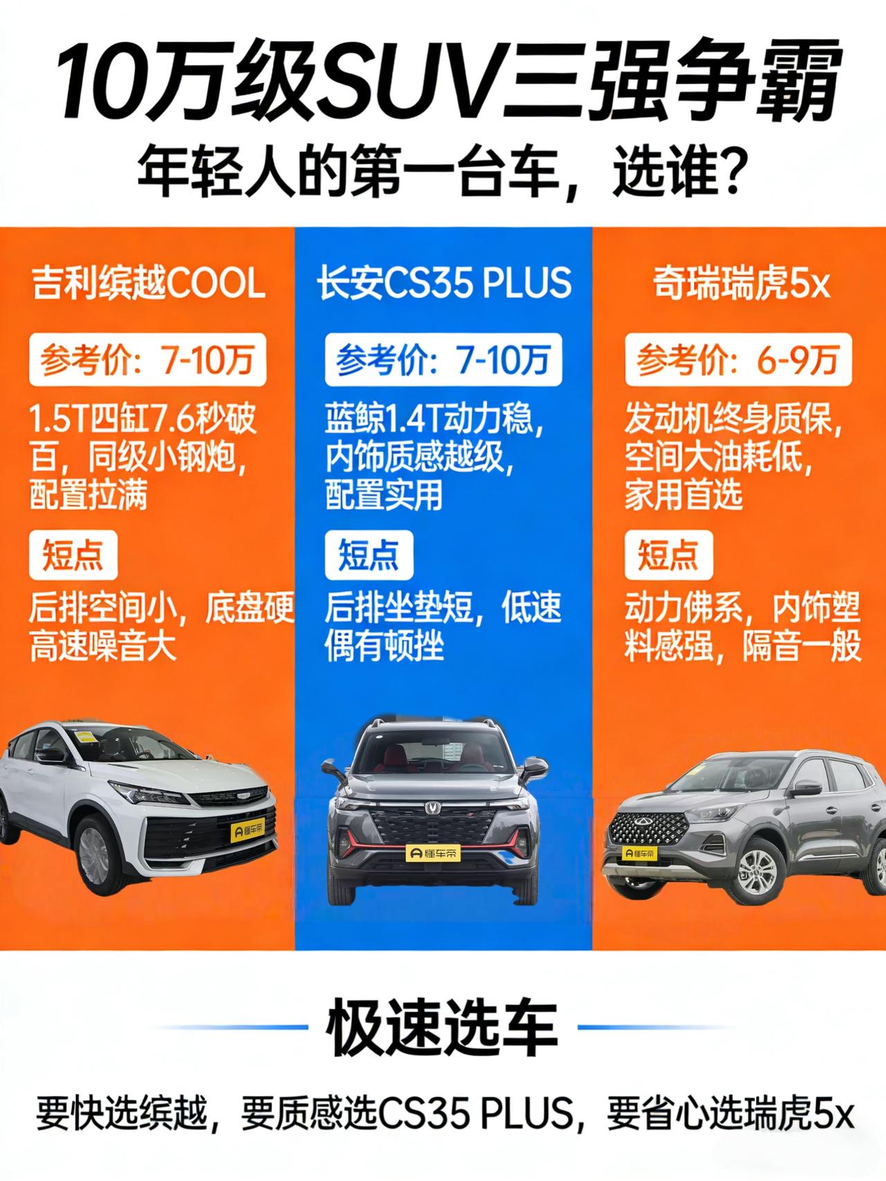 10万块预算别再盯着轩逸看了!这3台国产SUV,配置高空间大,年轻人第一台车真香 兄弟们,是不是手捏10万块预算,看来看去还是那几台合资轿车?配置毛坯房,动力老头乐,总感觉差点意思。 听我一句劝,咱们年轻人第一台车,真没必要死磕合资。现在的国产小SUV,那是真把“花小钱办大事”玩明白了。上周末我专门去汽车城泡了半天,把10万级卖得最火的三台国产SUV都摸了一遍,说说大实话。 👉 想有点驾驶激情,偶尔崩一下的,看吉利缤越COOL。 这车外观就挺“躁”,原厂自带个小尾翼,四出排气(别管真的假的,看着唬人)。我试驾的是1.5T四缸版本,最大181马力,那个加速体感在同级里真的算猛的,官方百公里加速7.6秒,双离合换挡“咔咔”快,超车信心十足。 槽点也得说:车确实有点小,后排坐三个成年人会有点“人贴人”。而且悬挂调校偏运动,过个减速带颠簸感比较明显,路感清晰得有点过头。适合单身小青年或者小两口,要的就是那股子冲劲儿。 👉对内饰质感有要求,不想坐进去全是塑料的,看长安CS35 PLUS。 坐进长安的车里,你第一反应绝对是“这车真就卖10万?”双联屏、皮质包裹、钢琴烤漆,摸哪儿都是软的,氛围感拿捏得死死的。而且它的1.4T蓝鲸发动机有160马力,低扭不错,市区里开感觉很轻快,很跟脚。 槽点也得说:车机偶尔会有那么一丢丢卡顿,而且后备箱地台偏高,搬个重物有点费腰。适合那些“外观给别人看,内饰给自己享受”的朋友,每天上车心情都会好一点。 👉追求极致省心和家用,不想折腾的,看奇瑞瑞虎5x。 这车第一眼可能没那么惊艳,但属于耐看型。它的最大杀招就是发动机终身质保(注:通常为首任车主,且需在品牌授权店定期保养,详情请咨询官方),奇瑞的发动机可靠性口碑在那儿摆着,图的就是个长远踏实。空间表现是这三台车中最偏向家用的,后排座椅舒适性不错。搭载的1.5L自然吸气发动机(116马力)配合CVT变速箱,主打一个平顺省油,城市代步够用,但急加速能力确实不是它的强项。适合注重经济性、可靠性和实用性的家庭用户。 ✍️总结一下怎么选: - 要快、要帅:选吉利缤越COOL(1.5T四缸,181马力)。 - 要精致、要豪华感:选长安CS35 PLUS(1.4T蓝鲸,160马力)。 - 要空间、要皮实耐用:选奇瑞瑞虎5x(1.5L自吸,116马力,发动机有质保政策)。 别听网上那些“加钱上卡宴”的鬼话,10万块,咱们国产车给到的体验,真的比同价位合资车香太多了!【来自懂车帝车友圈】