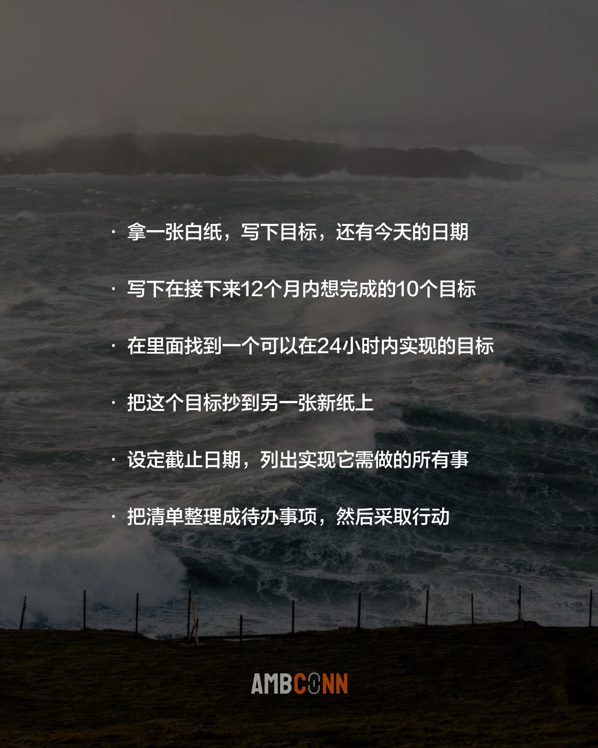 完成这个练习,你将在未来24小时内改变人生 · 拿一张白纸,写下目标,还有今天的日期 · 写下在接下来12个月内想完成的10个目标 · 在里面找到一个可以在24小时内实现的目标 · 把这个目标抄到另一张新纸上 · 设定截止日期,列出实现它需做的所有事 · 把清单整理成待办事项,然后采取行动 野心互联
