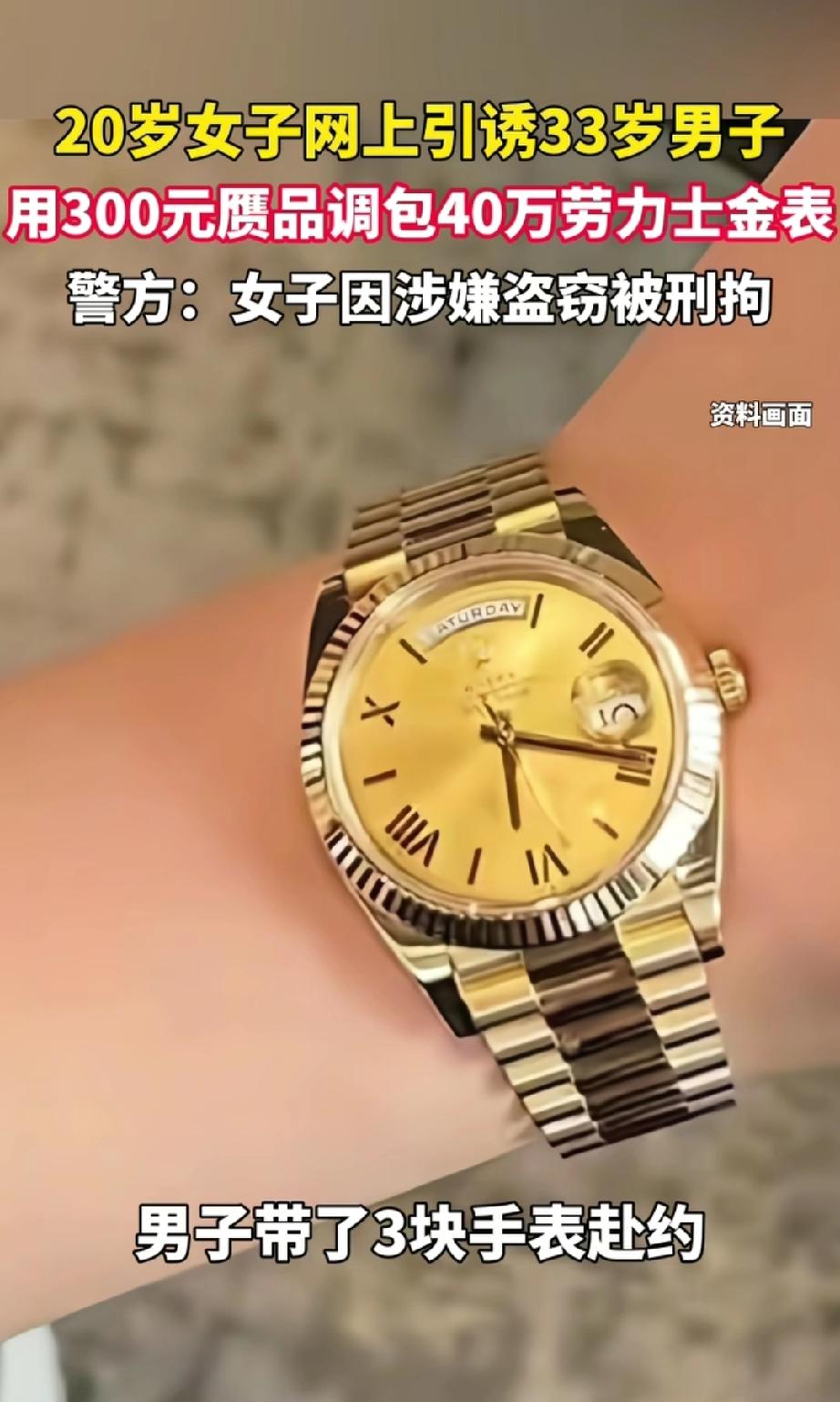 20岁女子网上引诱33岁男子,用300元赝品掉包40万劳力士金表。 现在的网络交友真的太让人防不胜防了!4月3日,33岁北京男子就遭遇了一场精心策划的骗局。20岁女网友以“回请”为由约他见面,提前花300元买了赝品劳力士,还准备1000元礼物铺垫。饭局上,她以买表为由试戴,趁男子转身瞬间完成掉包。 男子发现被调包时都懵了,那可是价值40万的劳力士啊!报警后,警方迅速行动,在男厕洗手池柜子底下找回真表。女网友自以为计划天衣无缝,却还是被抓了。这不仅是道德问题,更触碰了法律红线。网络交友,真得留个心眼,别让信任成了别人的“摇钱树”。 上海网恋骗局 相亲平台骗局 恋情骗局 网上交友骗局 寻缘相亲骗局 互联网爱情骗局 网络交友套路
