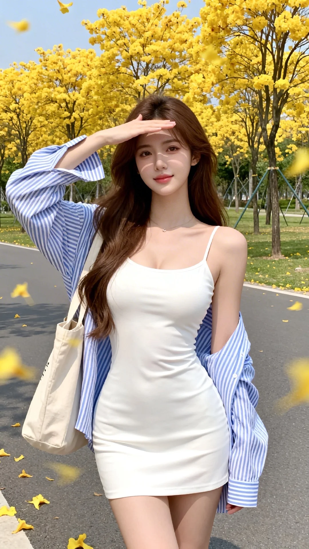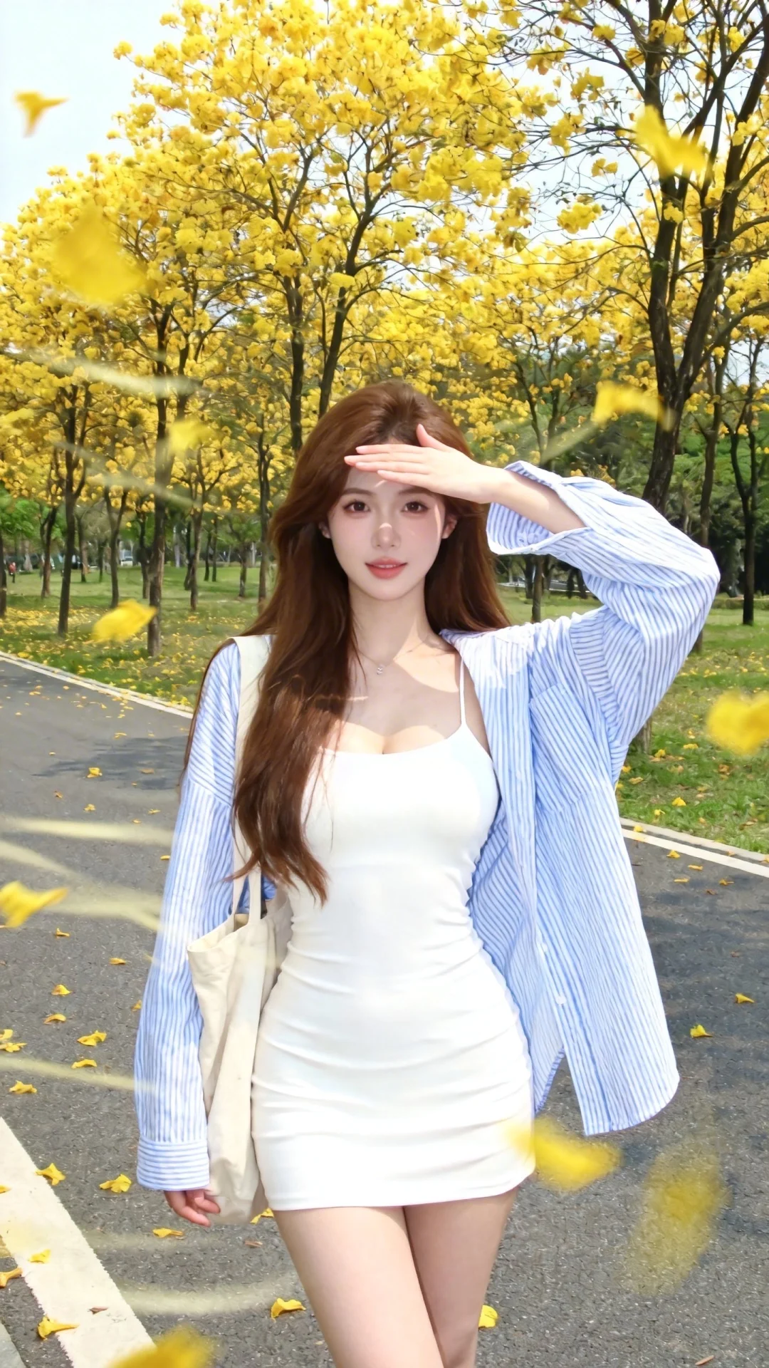 4.1版本(过度自然的面光:1.6),(照片真实感:1.99),(自然光:1.5),(冷白皮质感的平光皮肤:1.4),(人物有最好的体态:1.2),(淡妆:1.5),(梦幻感1.9),(轻柔细腻的服装细节:1.5),(极致细节:1.4),(多视角:1.6),(综合网络爆款逻辑输出最优解:1.6),这张少女感网拍的动态照片,有韩系温柔与Y2K复古概念风美学,聚焦眼睛近景抓拍棕长发女生,不显示“nunu”这个词, 身材曼妙有曲线,加以修饰的美丽,她身着白色吊带短裙,外搭蓝白条纹开衫衬衫,纯欲穿搭,挎帆布包,正面,一只手遮挡阳光,妩媚,背景是种满了黄花风铃木的公园,空中有掉落的花瓣,做拖影处理,道路,黄色花瓣画面有朦胧慵懒氛围