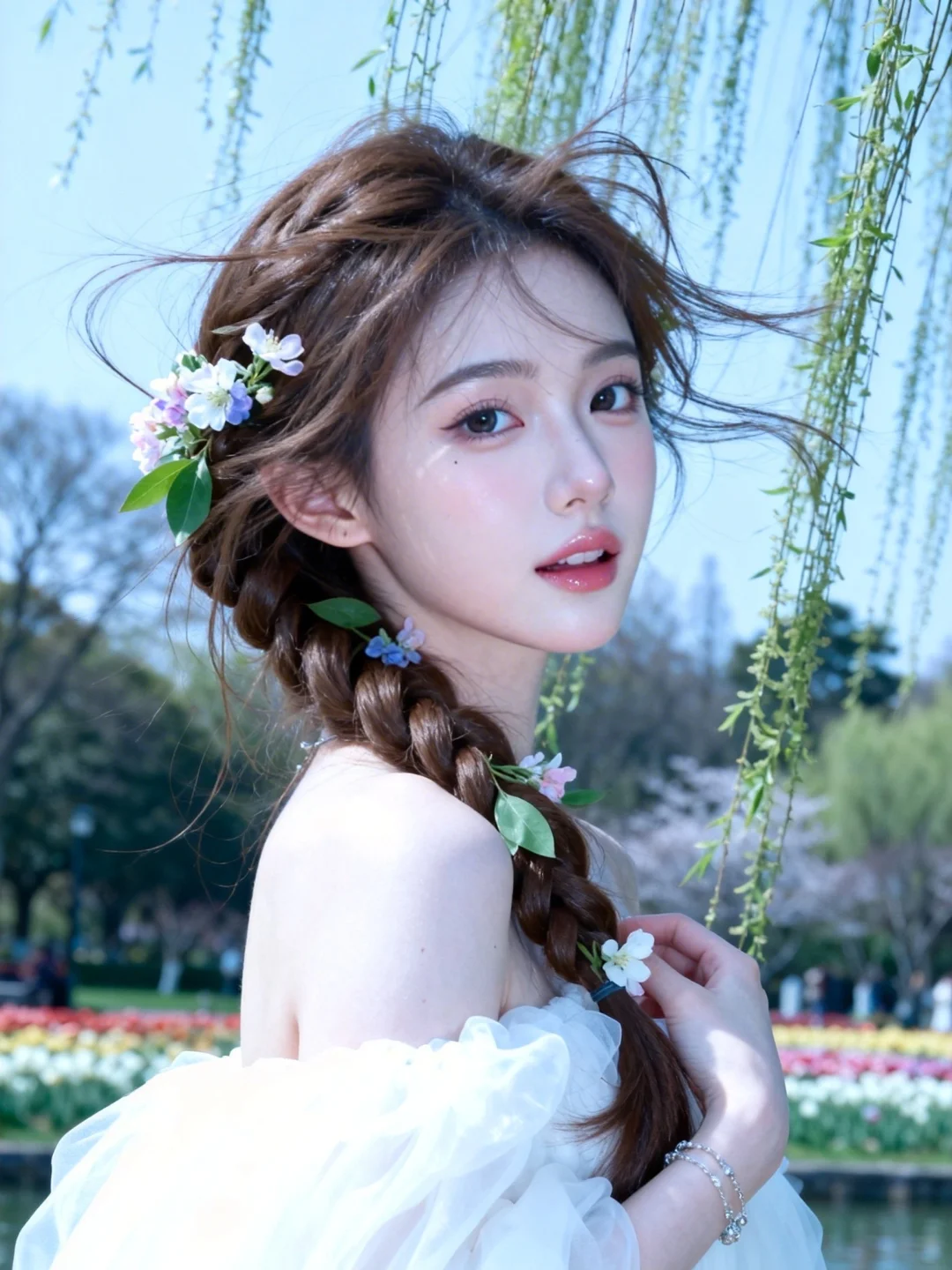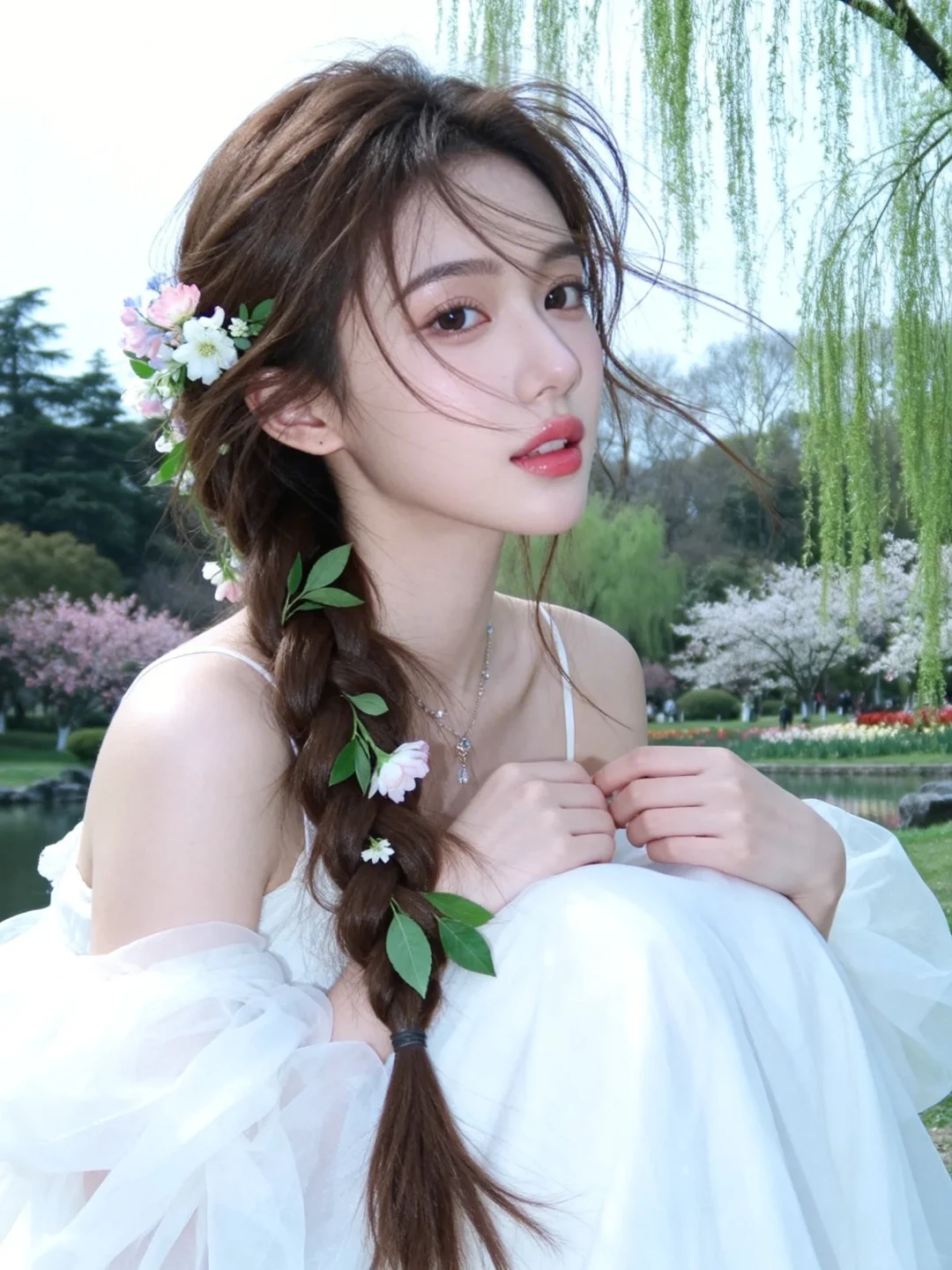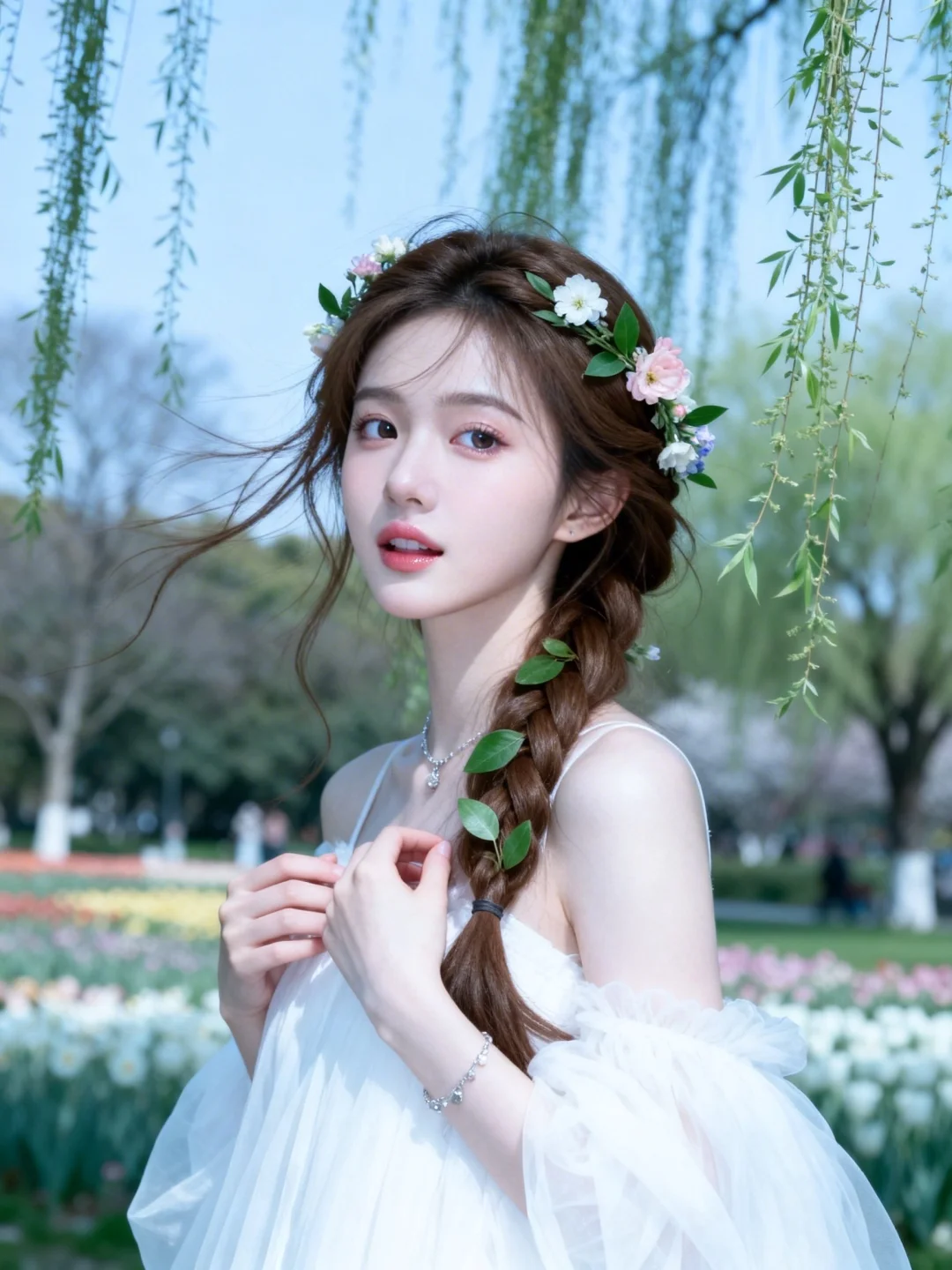 春天唯美柳条风景,背景公园虚化,唯美高级背景充满花草树木草,超清晰画质,妆造精致,饰品精巧,棕色长发上编织许多鲜花和叶子搭配,头发和鲜花花巧妙结合,身着白色飘逸长裙蓬松极简风格,细节完美,五官精致,突出头发凌乱美,面部清晰,清冷调。日常快照风格,非精心构图,非专业打光。(电影级面光:1.6),(光线追踪:1.5),(冷白皮漫感质感的光滑皮肤:1.7),(人物有最好的骨相:1.2),(网感脸:1.6),(网感妆:1.6)身材完美,莫兰迪配色,高颜值网红,INS风,幼态脸,19岁女生尖下巴,三庭五眼比例均衡,细腻陶瓷水嫩肌肤,偏冷白皮,随机的妆容,随机的饰品,随机的动作,侧光,发丝轻飘,凌乱,随机角度拍摄,总体有很多的不确定性,但又好看,
