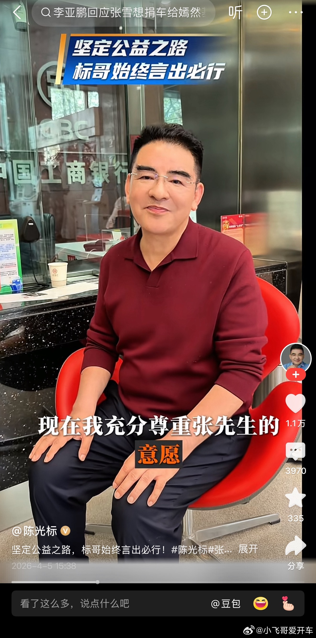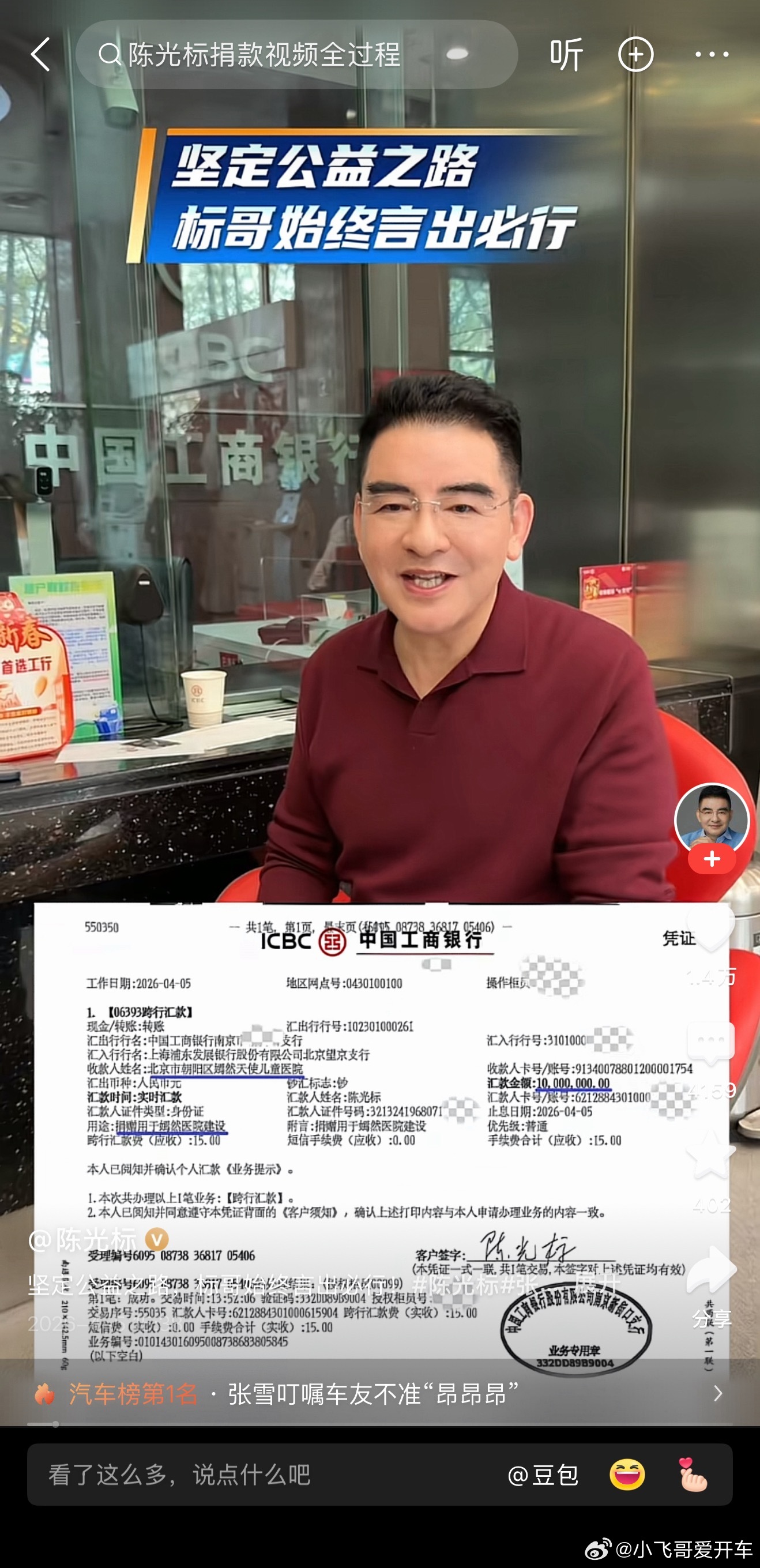 陈光标晒1000万转账单据,并发文称:鉴于张雪迟迟未来提车,特此将车辆变现资金捐