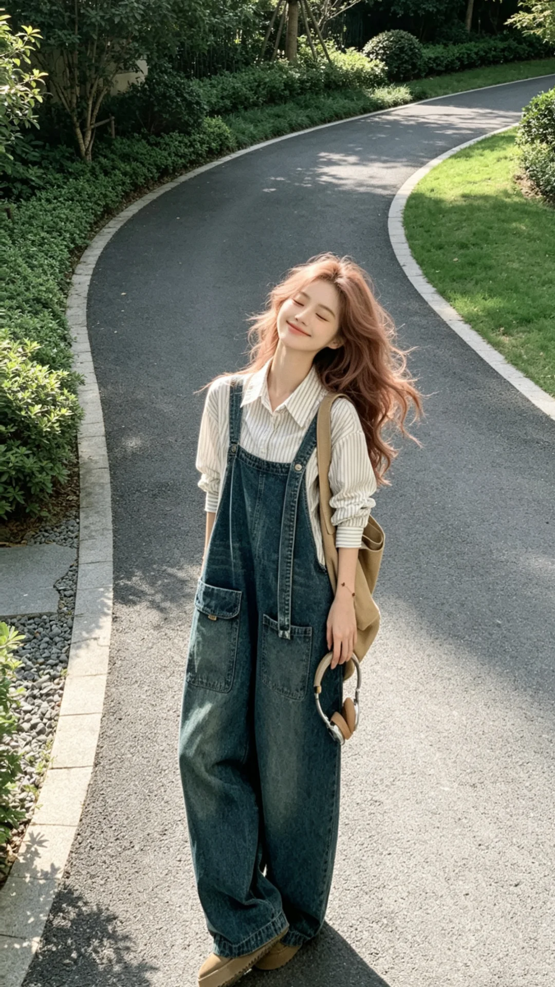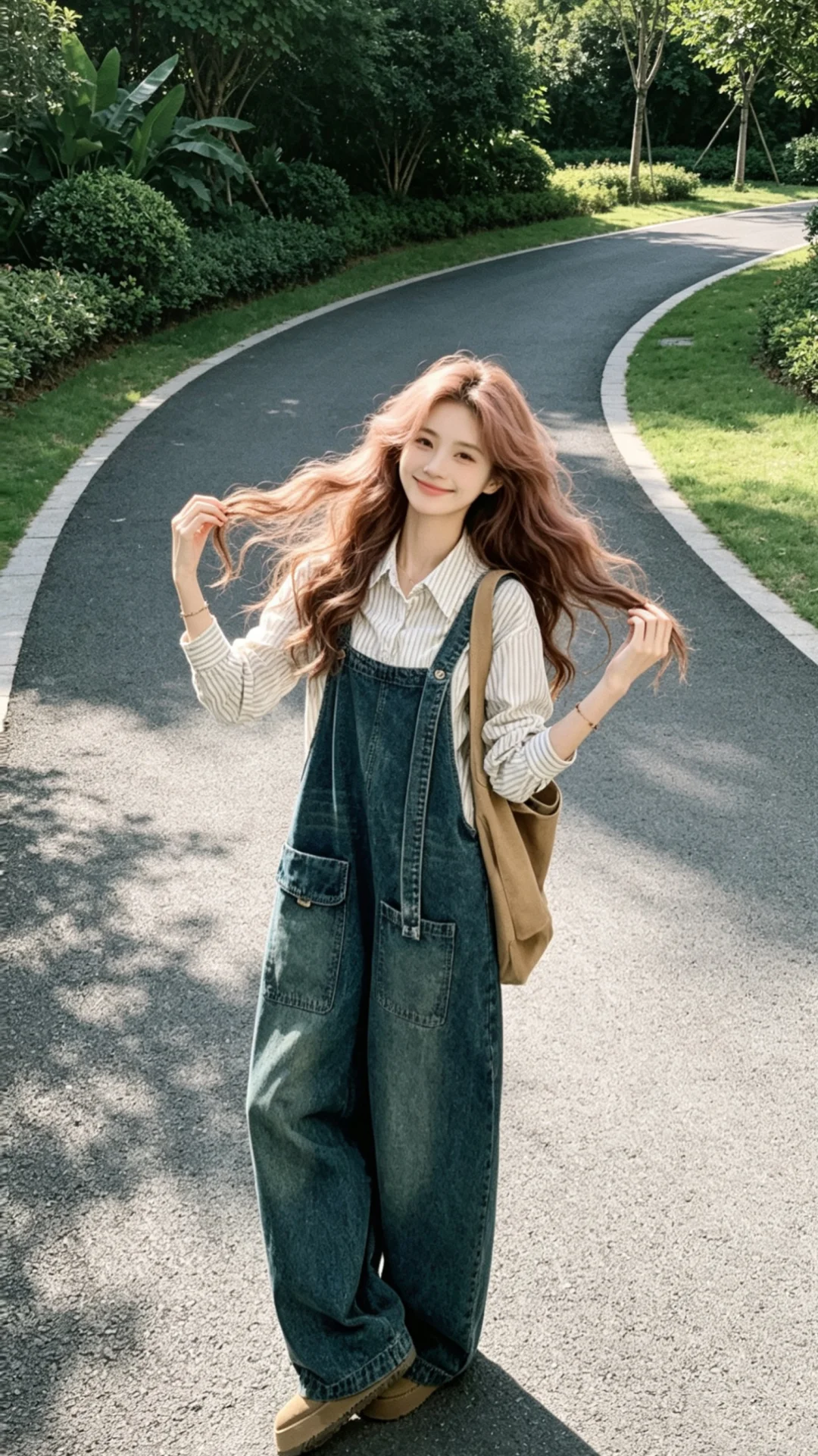 都市少女风,蓝白搭配,时尚穿搭,城市天际线背景,清新自然。