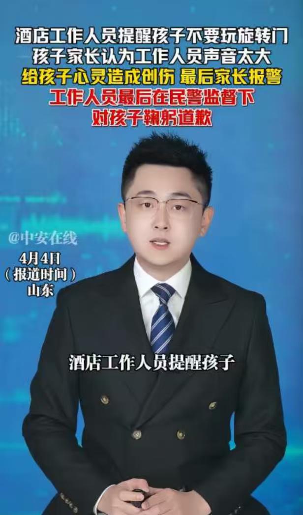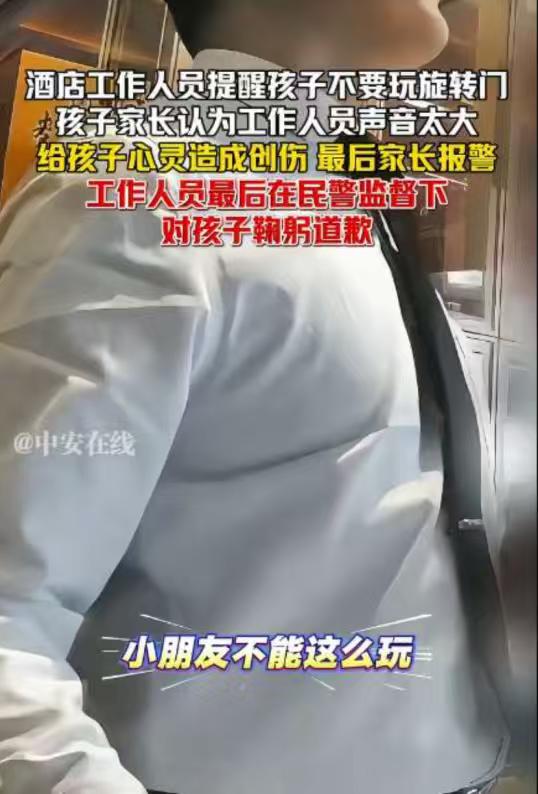 民警监督下的三声道歉,酒店工作人员的委屈,打了谁的脸? 山东某酒店的一场暖心提醒,最终竟演变成工作人员在民警监督下向孩子鞠躬道歉,三声“对不起”一句比一句沉重,不仅让当事人满心委屈、一头雾水,更让全网网友直呼离谱。这声道歉的背后,是善意被辜负,是道理被漠视,更是不良家教的真实写照,狠狠打在了蛮不讲理的家长脸上,也让人们对情理与规则的边界生出诸多思考。 事情发生在清明假期的4月4日,一位父亲带孩子入住山东某酒店,孩子因好奇跑到旋转门处玩耍,反复用手推转门,全然没有意识到夹手的危险。酒店工作人员见此情景,立刻柔声提醒孩子“不能这么玩,快出来”,语气亲切且刻意压低了嗓音,全程无呵斥、无恐吓,只是出于职责的善意提醒。 这本该是一场家长道谢、借机教育孩子注意安全的温馨小事,不料孩子父亲的反应却截然相反。他不仅未制止孩子的危险行为,反而径直冲到工作人员面前,厉声指责对方声音太大吓到了孩子。面对工作人员的轻声解释,这位父亲更是变本加厉,歇斯底里地连续发难,音量刺耳、态度蛮横,全然不顾自己的言行才是真正的“大声恐吓”。 即便工作人员和酒店经理先后道歉,这位父亲依旧不依不饶,坚称工作人员给孩子造成了心灵阴影,执意选择报警。而最终的处理结果,更是出乎所有人的意料——民警到场后,要求酒店工作人员向孩子鞠躬道歉。于是,满心委屈的工作人员,在民警的监督下对着孩子连说三声对不起,他始终想不通,自己恪尽职守提醒安全,究竟错在了哪里?不提醒是工作失责,提醒了却要道歉,左右为难的处境,让人心疼。 此事曝光后,网友几乎一边倒地站在酒店工作人员这边。大家纷纷表示,工作人员的提醒毫无问题,语气和音量都合情合理,反观孩子父亲,不仅蛮不讲理、借题发挥,更是用自己的暴躁言行给孩子做了最坏的示范。更有网友对此次的处理结果提出质疑,认为这样的判定有失公允,寒了善意之人的心,也纵容了无理取闹的行为。 细究此事,这位父亲的所作所为,远比工作人员的一句提醒更“吓孩子”。他借着孩子的名义发泄情绪,将自己的不满肆意转嫁到工作人员身上,甚至不惜浪费宝贵的警力资源,只为满足自己的一己私欲。他本可以借着工作人员的提醒,给孩子上一堂生动的安全教育课,告诉孩子要感恩他人的善意、远离危险、懂得尊重,可他却选择了最极端、最无理的方式,给孩子传递了错误的价值观:遇事不分青红皂白,只要闹得够大,规则就能为自己让路。 父母是孩子的第一任老师,一言一行都在潜移默化中影响着孩子的成长。这位父亲的暴躁与蛮横,不仅让孩子错失了一次良好的家庭教育机会,更可能让孩子在未来的生活中,变得同样不讲理、爱计较,不懂得尊重他人、珍惜善意。而酒店工作人员的三声道歉,看似是对这场闹剧的妥协,实则是对无理行为的无声控诉,这三声道歉,打在工作人员的心上,更打在那位蛮不讲理的父亲脸上,打在那些漠视善意、纵容任性的行为上。 善意不该被辜负,职责不该被苛责,家教更不该如此扭曲。希望这位父亲能在事后认真反思,明白自己的言行究竟错在何处;也希望每一个为人父母者,都能以礼待人、明辨是非,用正确的言行给孩子树立榜样,让善意被珍惜,让道理被尊重,让这个世界的温暖与美好,能被温柔以待。真心诚意的道歉 道歉教育